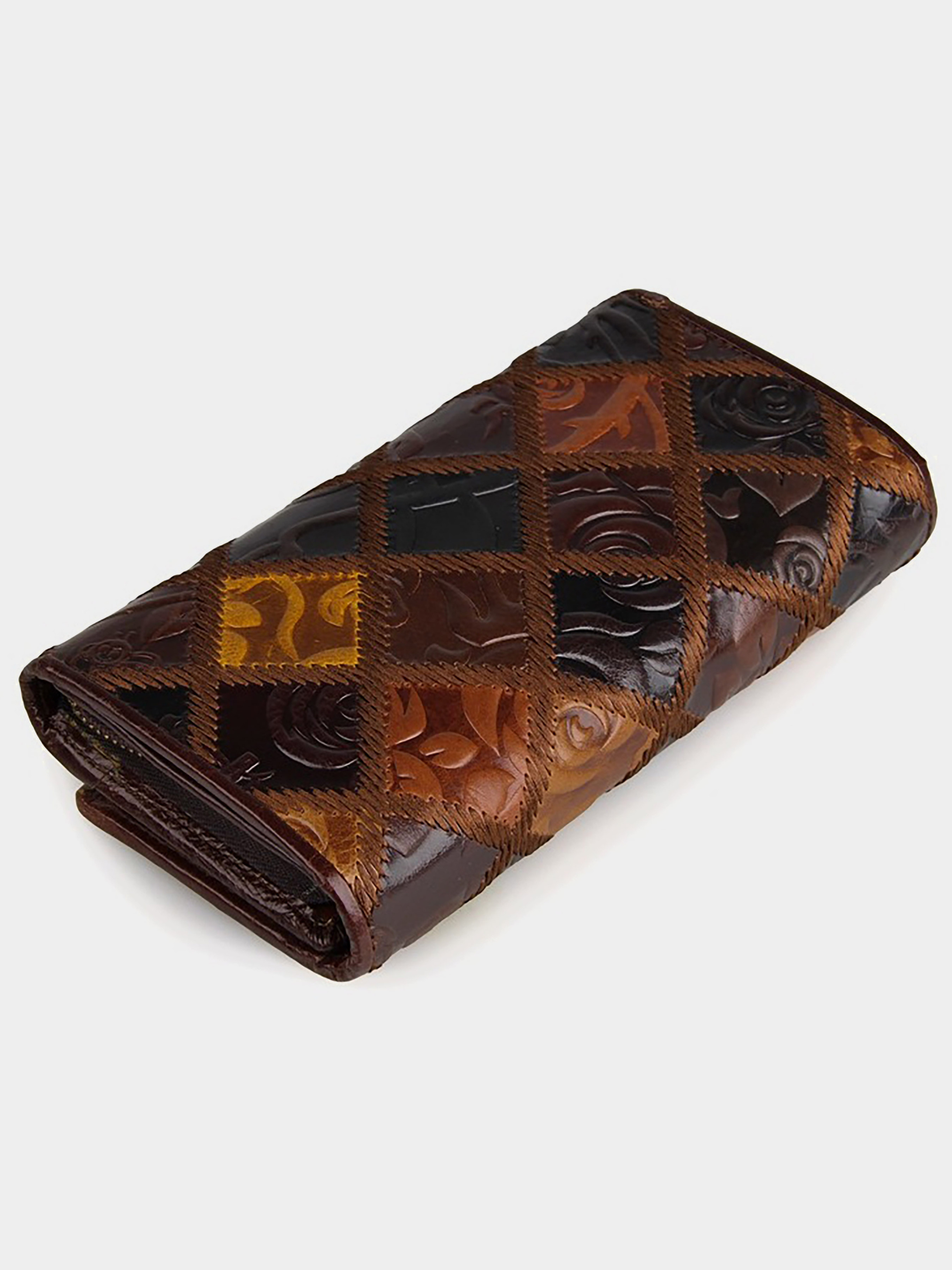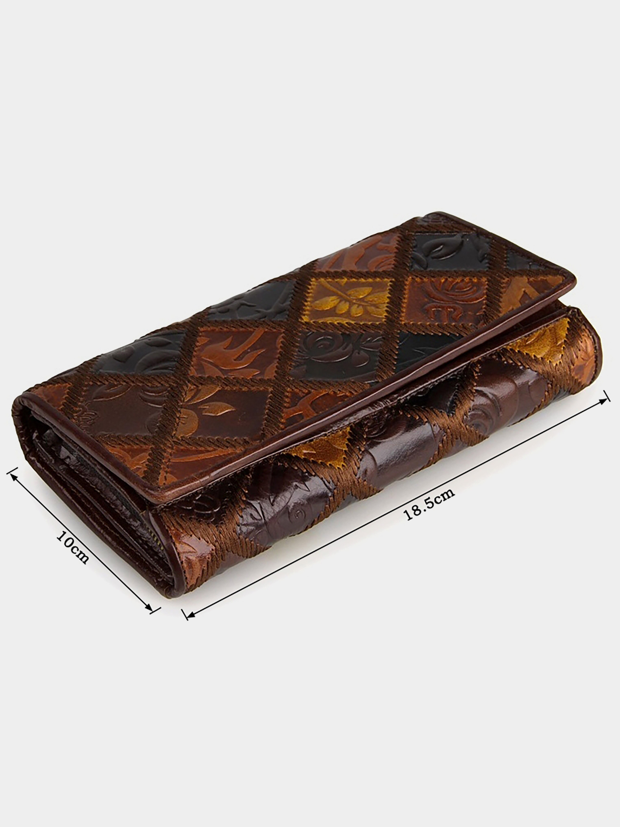 Размер: (ШхВ, см): 18,5х10; Материал: натуральная кожа высокого качества; Цвет: коричневый. Добротный женский кожаный кошелек с множеством удобных кармашков и отделений. Внешняя сторона изделия украшена теснением на коже в виде декоративных рисунков. Цвет фурнитуры: латунь. Аксессуар закрывается клапаном на кнопке. Кошелек упакован в текстильный пылезащитный чехол белого цвета. Внутри: - одно большое отделение для банкнот; - отделение на молнии, которое внутри разделено на два перегородкой; - 13 отделений для пластиковых карточек, одно из которых с прозрачной пленкой; - 1 накладной карман для денег.