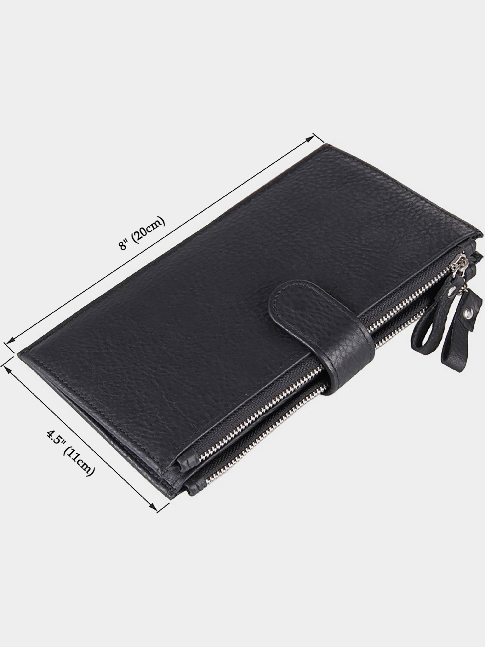 Цвет: черный; Материал: натуральная кожа высокого качества; Размеры (ШхВ, см): 11х20. Для пошива бумажника используется 100% натуральная телячья кожа, надежная фурнитура и прочный износостойкий текстиль для внутренней обшивки. Кошелек прошит крепкой нитью. Внешний вид аксессуара напоминает эксклюзивную книгу и наверняка приглянется Вам. Закрывается с помощью хлястика на кнопке, при открытии его на верхних гранях размещено два отделения на молнии. Их можно использовать для купюр и габаритного смартфона до 5,5 дюймов (нужно учесть габариты корпуса). При открытии клатча оборудовано: -20 мест для пластиковых карт или визиток; -1 место под пленкой; -2 скрытых кармана. Такой кожаный кошелек-клатч шикарно ложиться в руку, невероятно функционален и практичен в использовании, отлично подойдет людям, которые носят много банковских карт, скидочных карт и т.д. а качество аксессуара на высоком уровне, так что прослужит своему владельцу длительно время.
