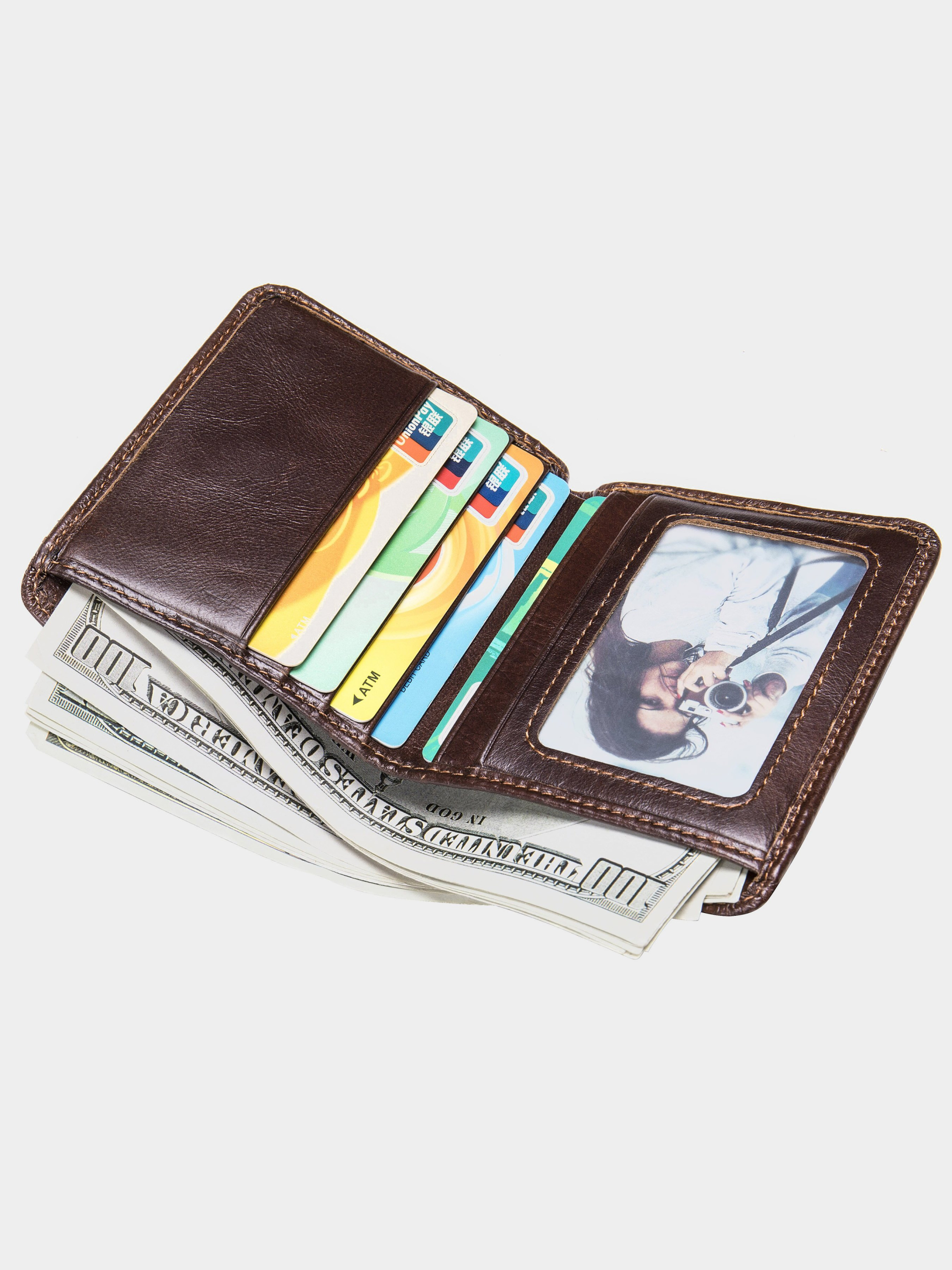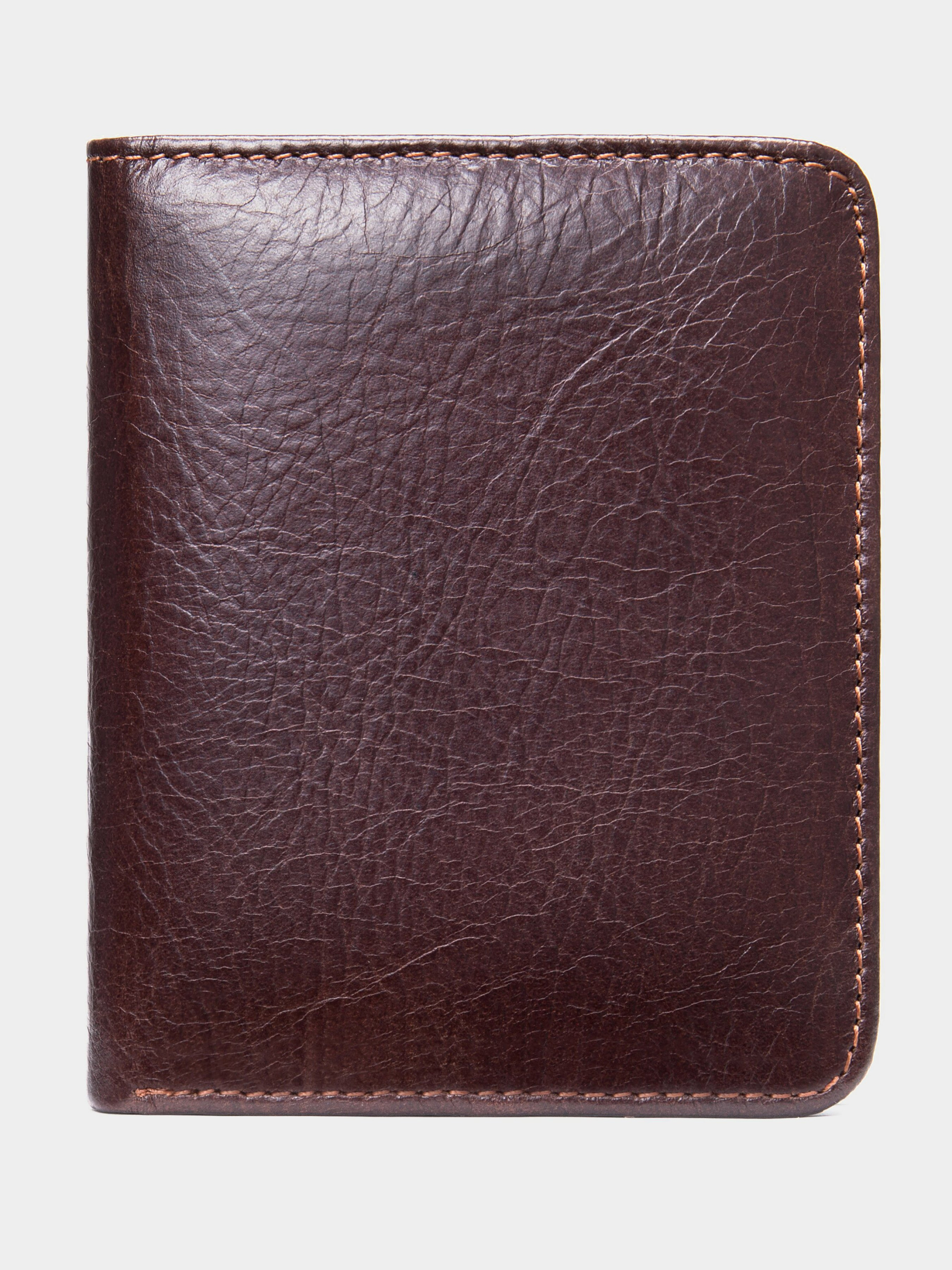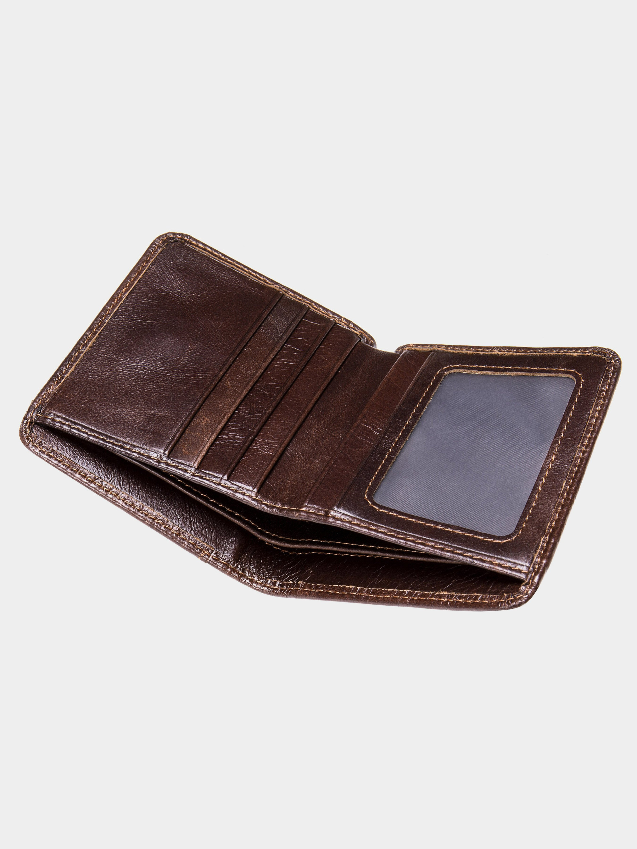 Цвет: коричневый; Материал: натуральная кожа высокого качества; Размер (ШхВхГ, см): 10,5х8,4х1,5; Страна производитель: Китай. Особенности: - два основных отделения для купюр; - 5 слотов для кредиток (1 из них под пленкой); - 1 открытый карман; - модель без застежки. Функциональный и стильный кошелек для мужчин. Глянцевое покрытие модели будет красиво играть на солнечных лучах. Портмоне с легкостью поместится в карман брюк. Изделие прошито по краям светлой нитью. Модель очень компактная. Стоит отметить, что в изделии отсутствует монетница. Портмоне подойдет для вас, если вы отдаете предпочтение купюрам и банковским картам.