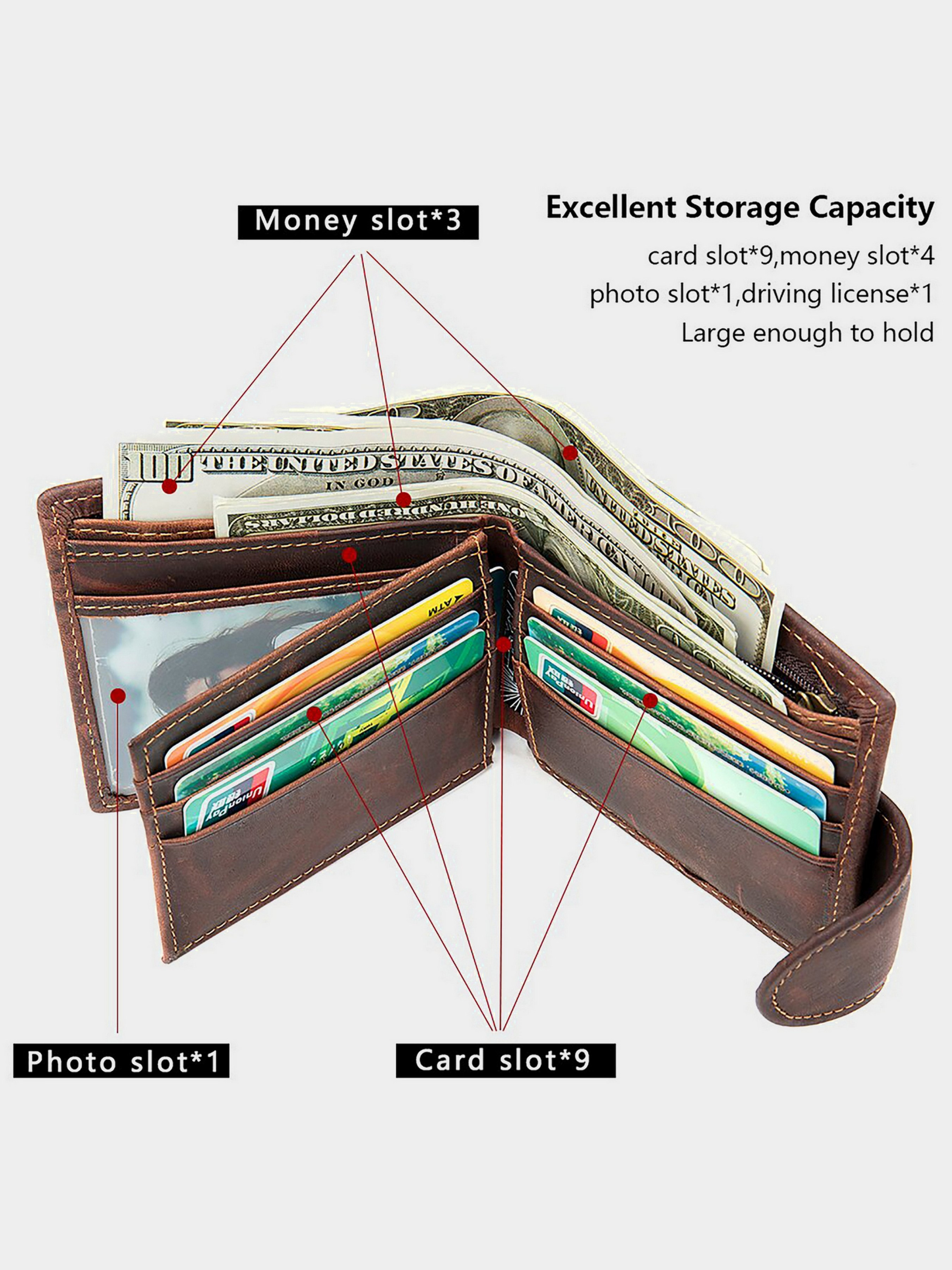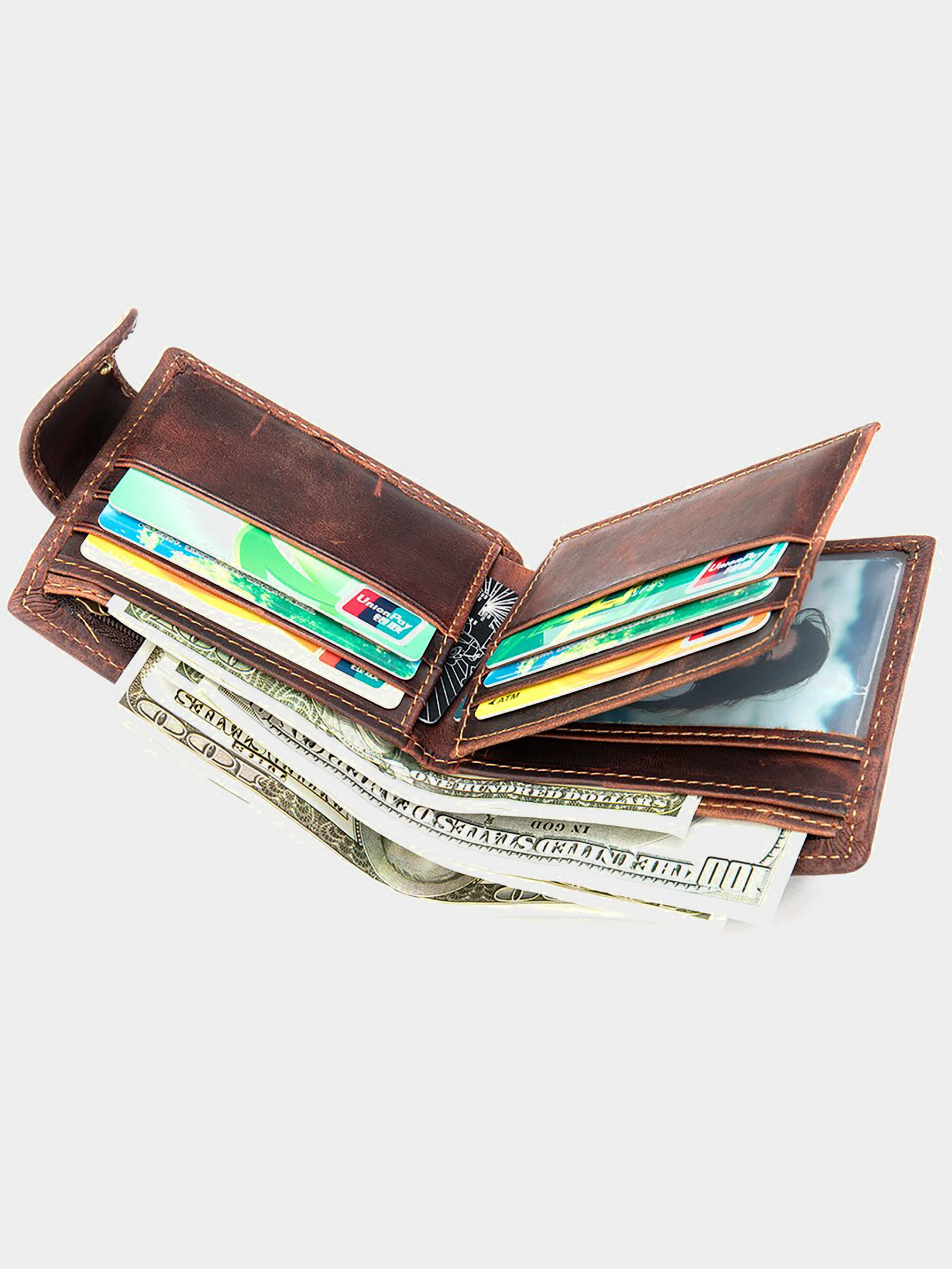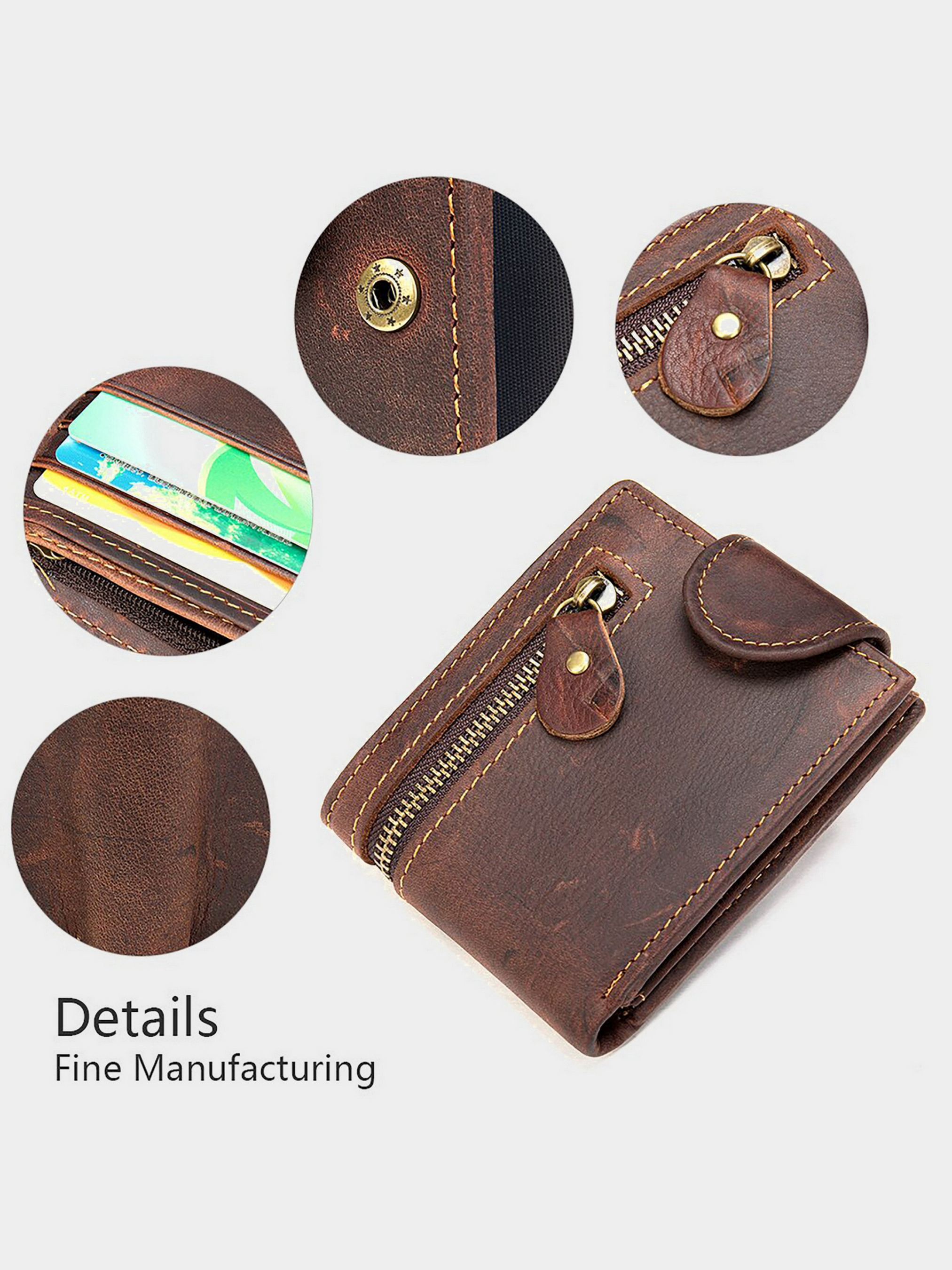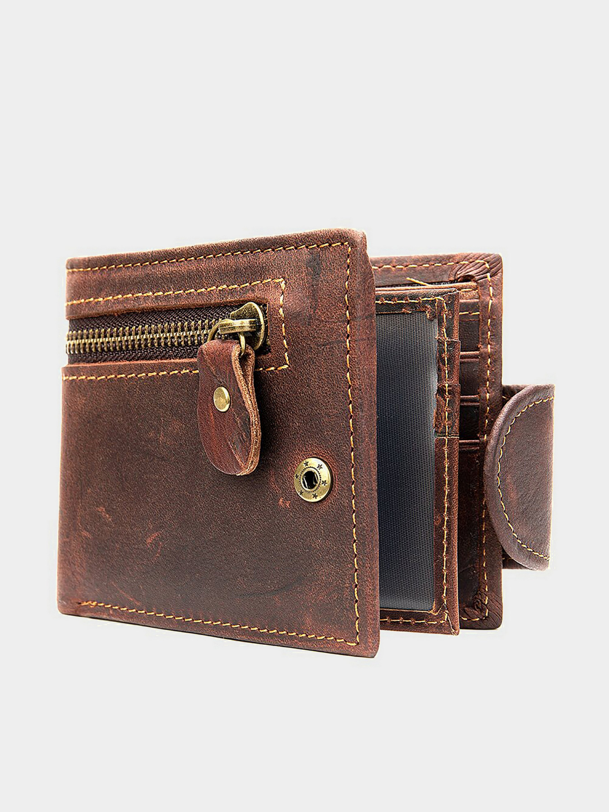 Цвет: коричневый; Материал: натуральная кожа высокого качества; Размер (ШхВхГ, см): 9,5х11х2; Страна производитель: Китай. Особенности: - три основных отделения для купюр и одно отделение на молнии; - 8 слотов для кредиток (2 из них под пленкой); - 3 открытых кармана; - сплошное отделение на молнии на лицевой стороне портмоне; - закрывается на кожаный хлястик с кнопкой. Функциональный и стильный кошелек для мужчин из винтажной кожи. Данный тип кожи пользуется особенной популярностью среди наших клиентов. Особенностью винтажной кожи является то, что со временем такие изделия выглядят с эффектом старины. Портмоне компактных размеров и легко поместится в карман брюк. В наружный карман вы можете поместить монеты. Изделие станет идеальным подарком для мужчин.
