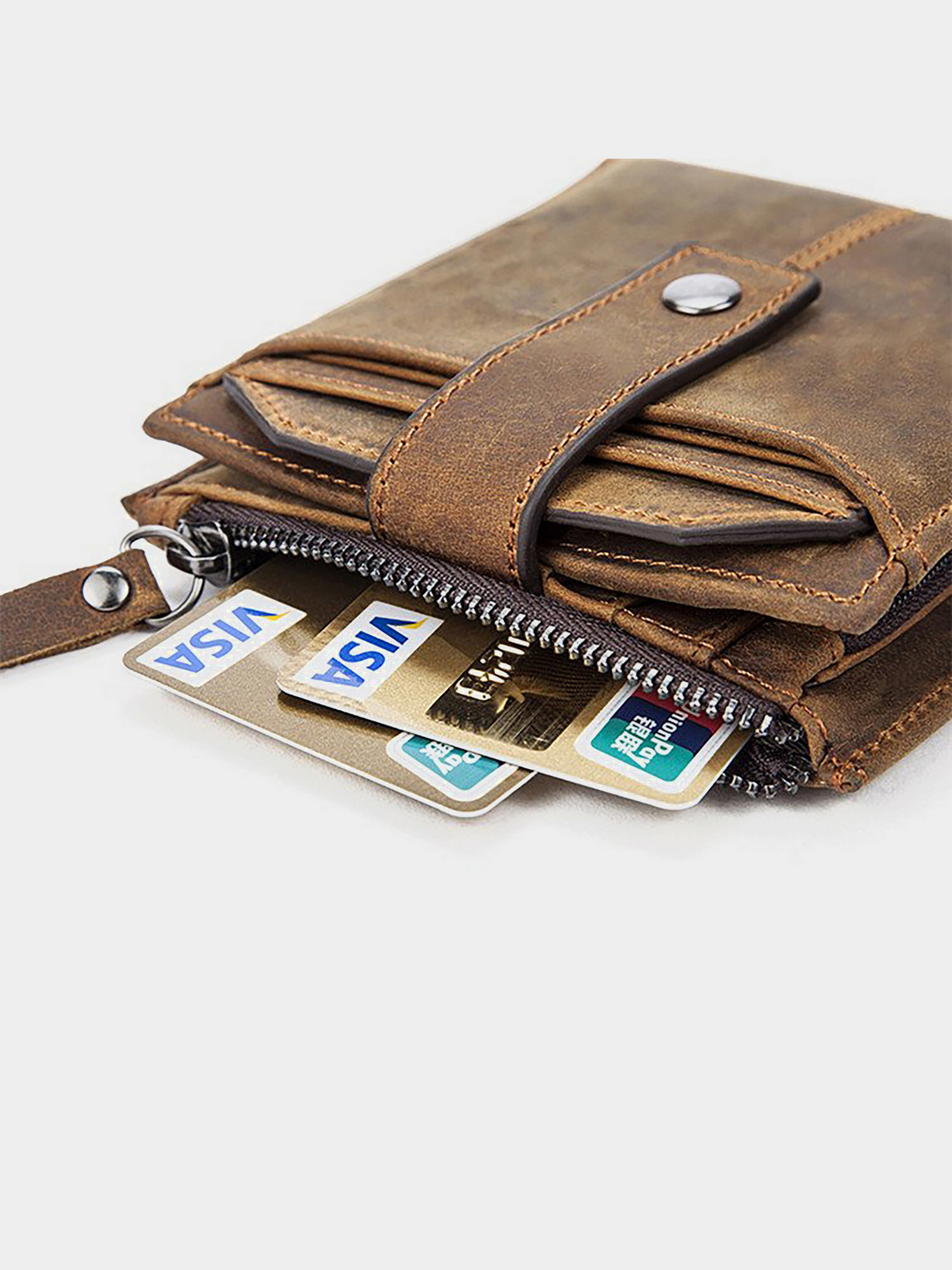 Материал: натуральная кожа высокого качества. Цвет: черный. Размеры (ШхВхГ, см): 12х11х1,5см. Страна производитель: Китай. Бренд: Vintage. Описание: - 2 отделения для купюр открытого типа; - отдел для банкнот под молнией; - 4 кармана открытого типа; - 5 слотов для кредиток (один из них прозрачный); - боковой карман на молнии; - вкладыш на лицевой стороне для фото и 4 слота для карточек; Качественный кошелек с эффектом старины, смотрится очень стильно и аристократично. Подойдет для любителей носить с собой много карточек. Аксессуар застегивается на хлястик с кнопкой. Модель небольшого размера и поместится в небольшую сумку. Носятся аксессуары из такой кожи очень хорошо. Такой кошелек добавит изюминку в ваш образ и станет прекрасным дополнением к вашему стилю. Аксессуар упакован в тканевой чехол, что защищает его от попадания пыли и различных загрязнений. Может быть прекрасным подарком для близкого человека.
