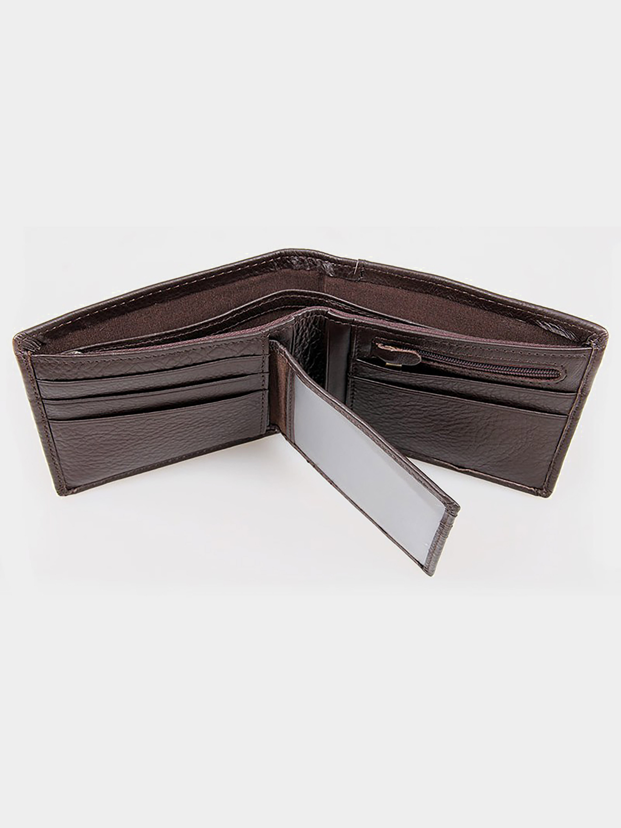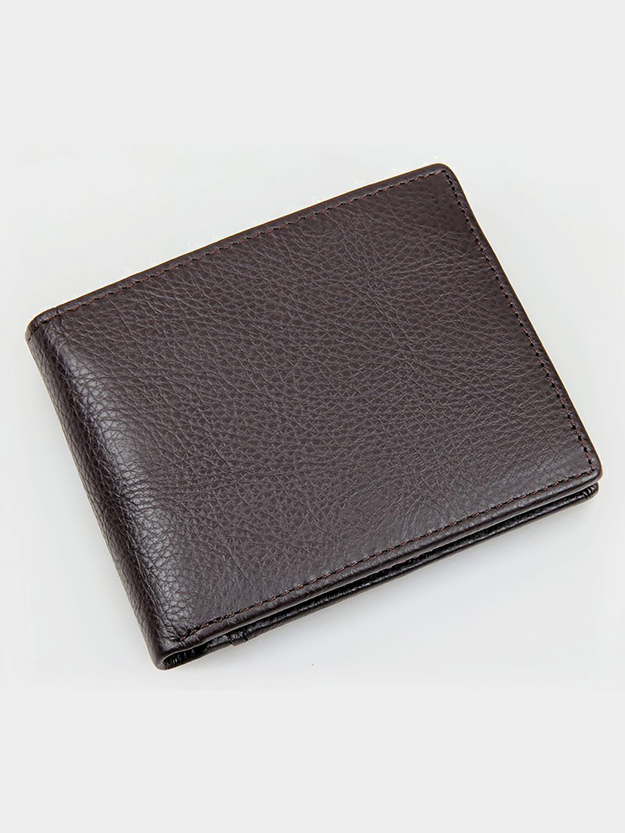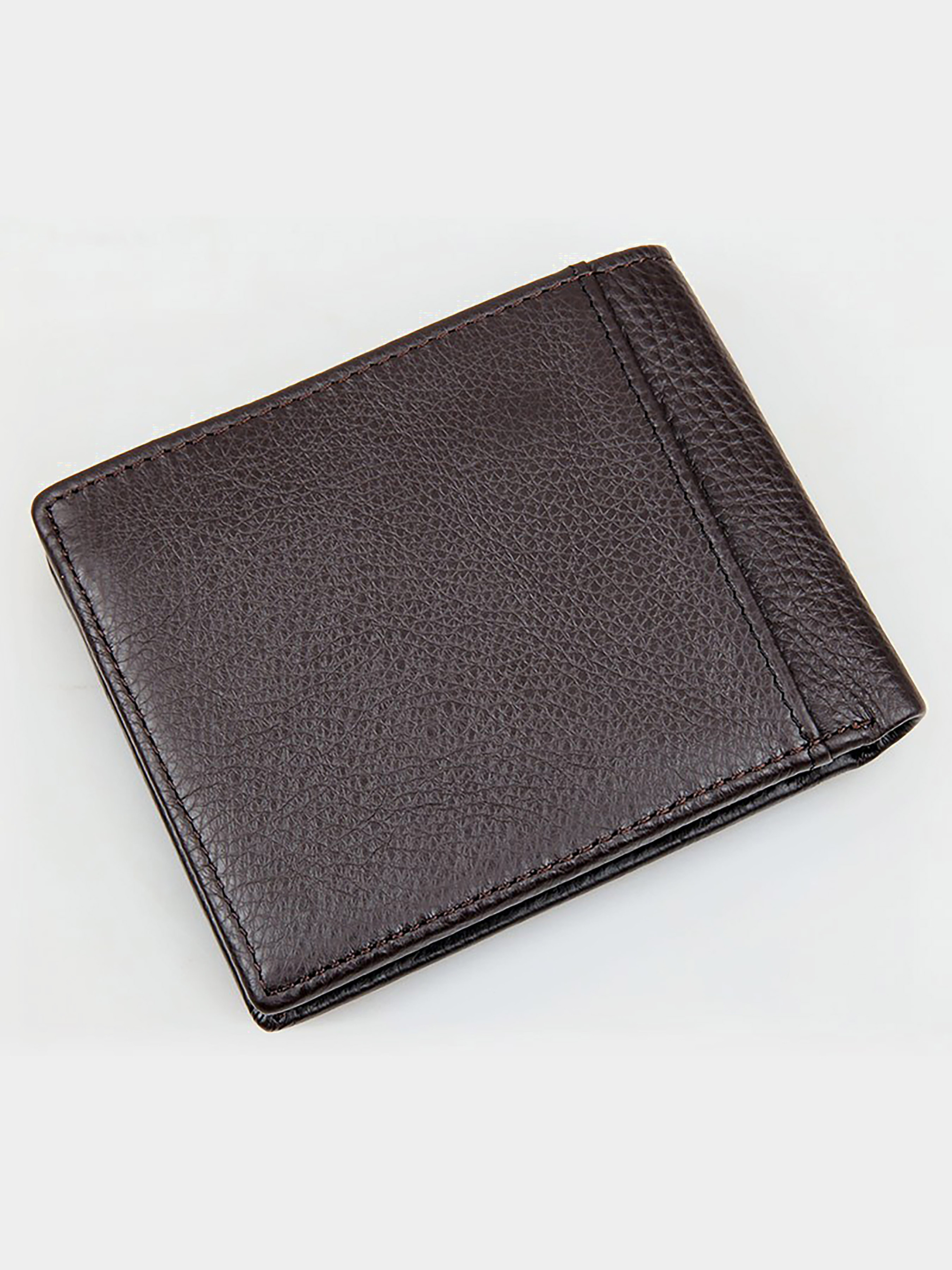 Размер (Ширина, Высота, см.): 12х9,5; Материал: натуральная кожа высокого качества; Цвет: коричневый. Современное мужское портмоне из натуральной кожи высокого качества. Данная модель не отличается компактными размерами, но она помещается в передний карман джинсов. Портмоне надежно прошит прочной темно-коричневой нитью. Аксессуар упакован в текстильный пылезащитный чехол. Характеристики: - 3 отделения для банкнот, одно из которых закрывается молнией; - 9 отделений для пластиковых карточек; - монетница на молнии; - отстегиваемая визитница для 5 кредиток.