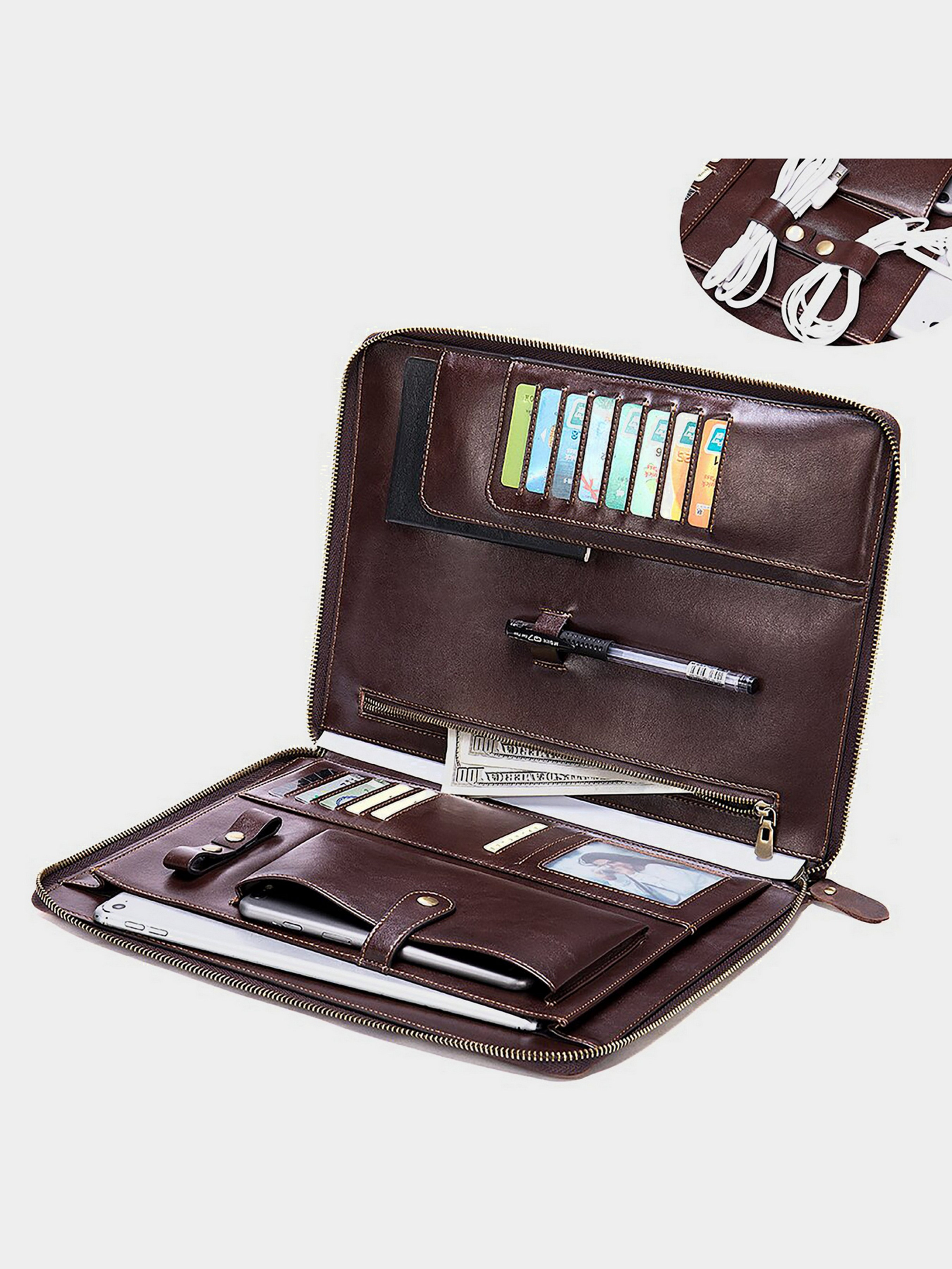 Цвет: коричневый; Материал: натуральная кожа высокого качества; Размер (ШхВхГ, см): 31,5х23,5х2; Страна производитель: Китай. Особенности: - встроенное отделение для купюр (бумажник); - 15 слотов для кредиток (один из них под. пленкой для фото); - одна петля для ручек; - две петли для ключей; - один открытый карман для документов; - встроенный карман на молнии; - два откидных кармашка; - один открытый карман на стенке. Стильная деловая папка из винтажной кожи. Изделие создано специально для деловых мужчин. Папка идеально заменит вам сумку и бумажник. В нее можно поместить документы формата а4. А также в папку поместятся ваши визитки, купюры ключи и ручки. Папка станет идеальным подарком для мужчин, которые ценят качественные вещи и хотят выглядеть на все 100.