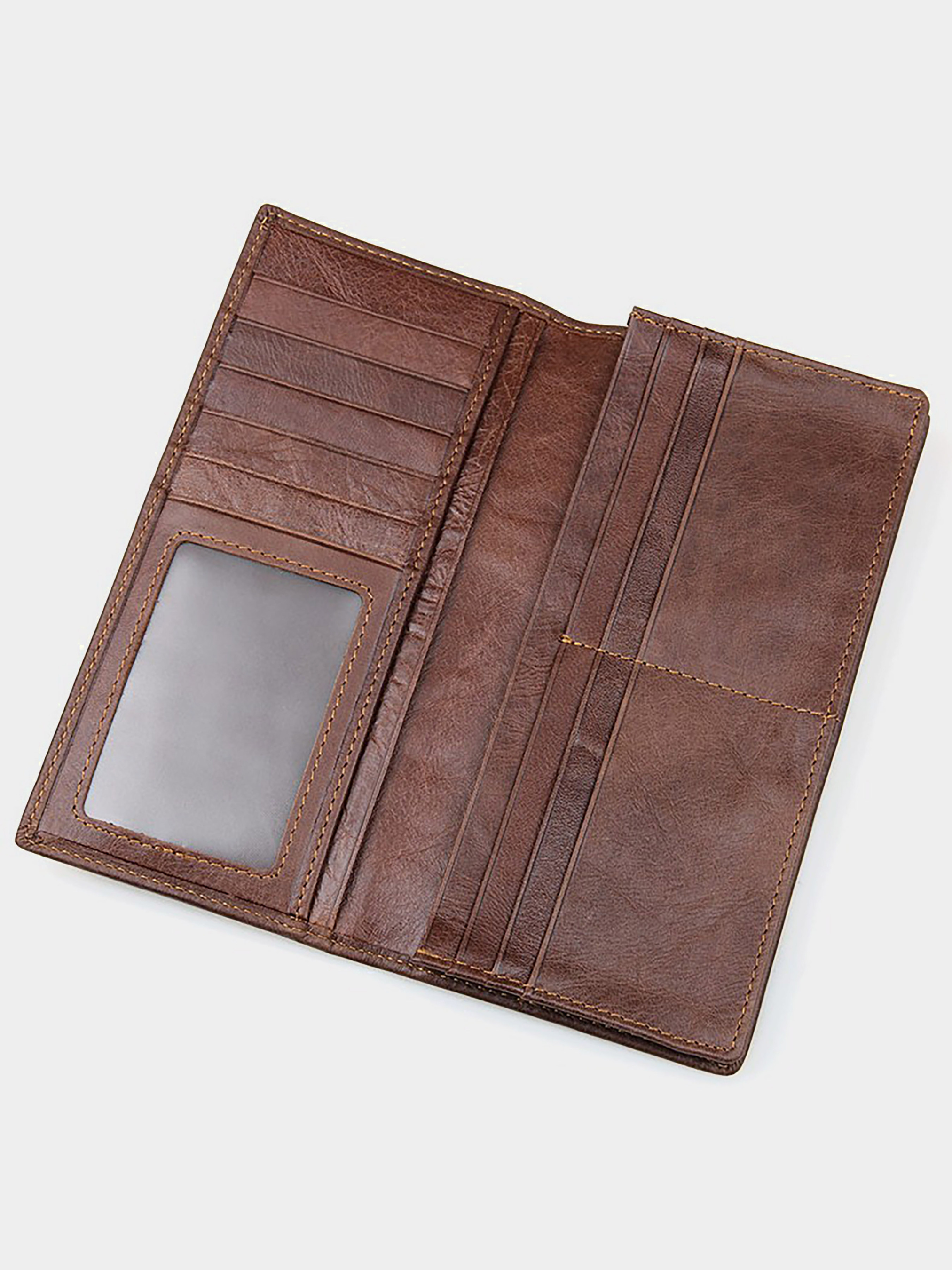 Размер (Ширина, Высота, см.): 9х19; Материал: натуральная кожа высокого качества; Цвет: коричневый. Стильное вертикальное мужское портмоне из натуральной кожи. Портмоне удобно держать в руке. Изделие аккуратно прошито сверхпрочной нитью. Банкноты в таком портмоне помещаются в развернутом состоянии. Бумажник упакован в текстильный пылезащитный чехол белого цвета. Внутри: - одно вместительное отделение для банкнот; - 11 отделений для пластиковых карточек и одно прозрачное для документов; - два небольших кармана для купюр.