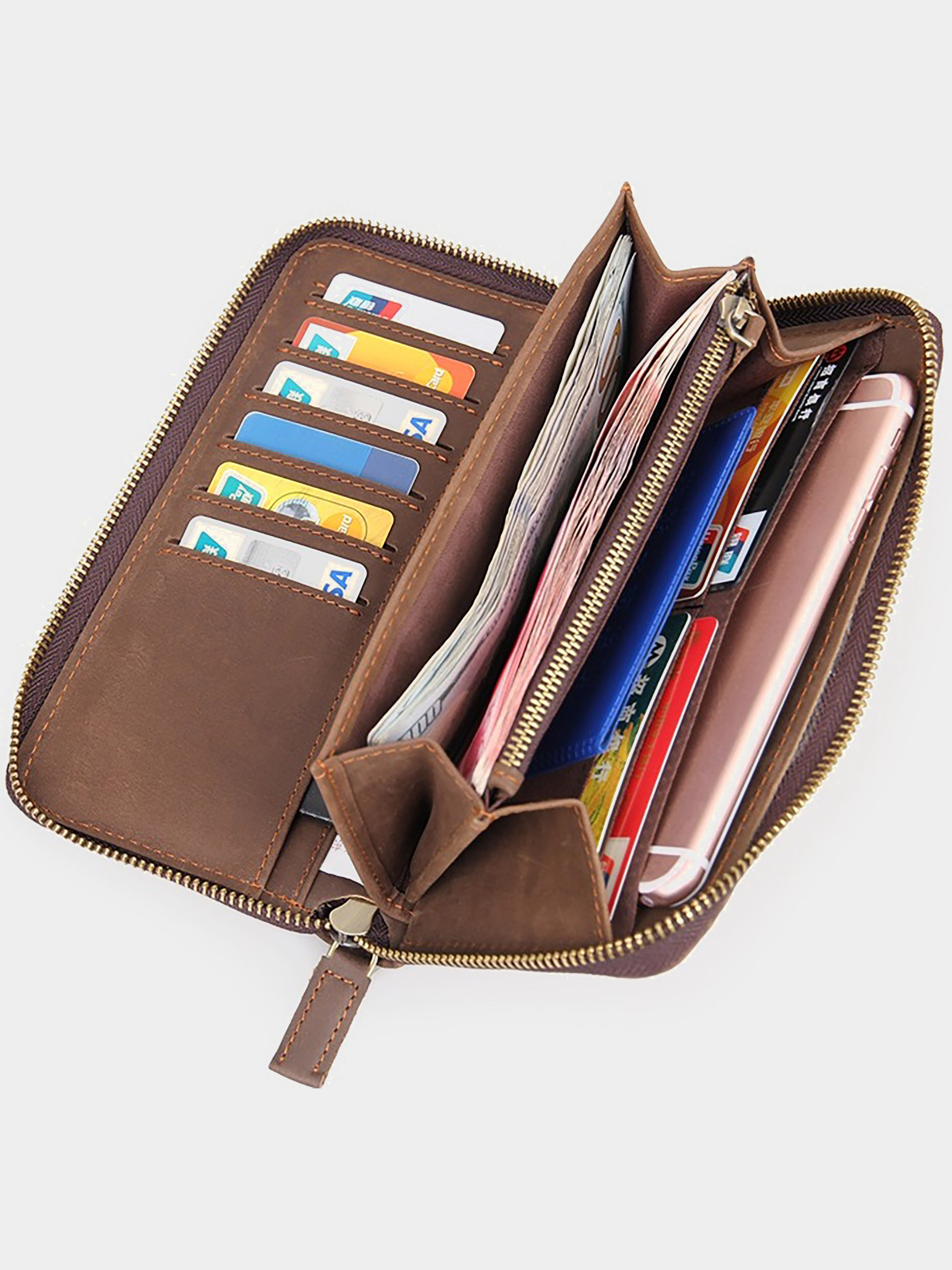 Модный женский кожаный кошелек на молнии. Аксессуар чрезвычайно удобный и функциональный. Помимо прямого назначения, в него может поместиться телефон, ключи или другие мелкие вещи которые не хочется носить в руках. Цвет фурнитуры: латунь. Изделие имеет очень красивый тесненный рисунок на коже. Кошелек не упакован в коробочку, но укомплектован текстильным пылезащитным чехлом. Внутри: - отделение-перегородка на молнии для монет; - 15 отделений для пластиковых карточек; - 3 скрытых отделения для банкнот; - 2 отделения для банкнот или телефона. Аксессуар станет превосходным решением для подарка любимой супруге, бабушке, маме или сестре к любому празднику.