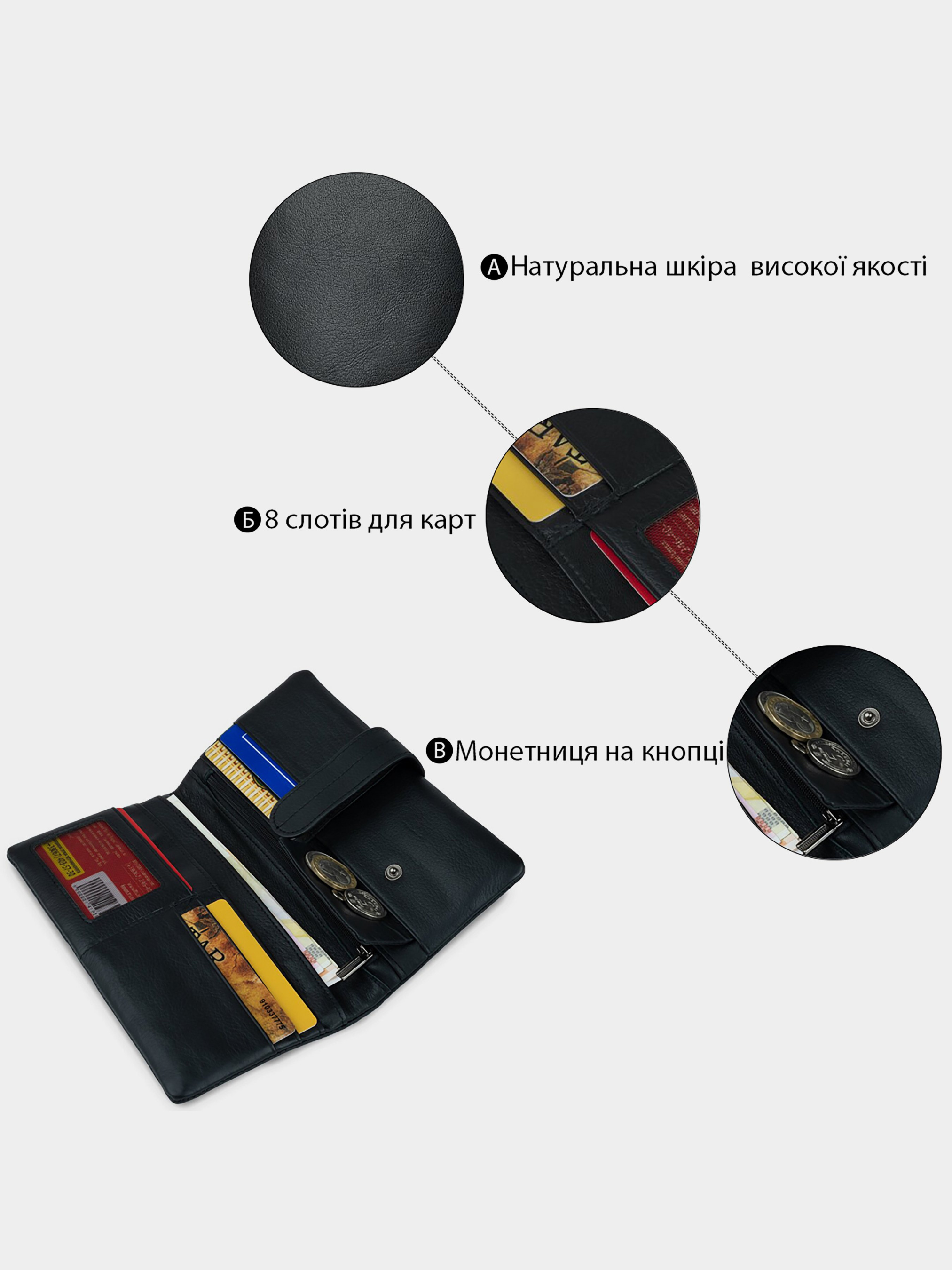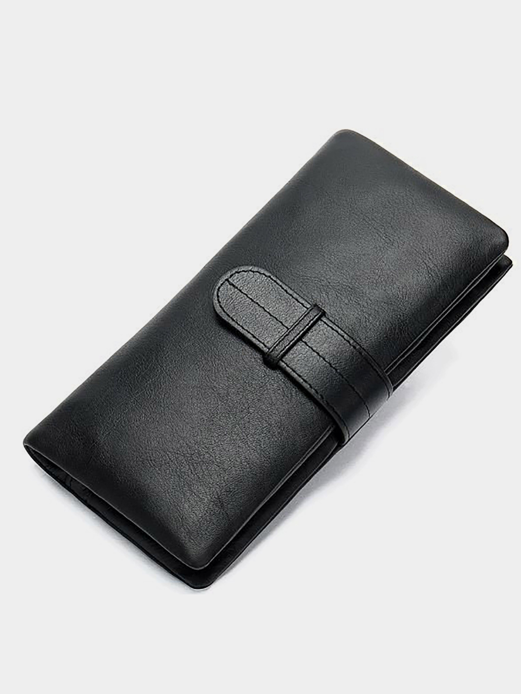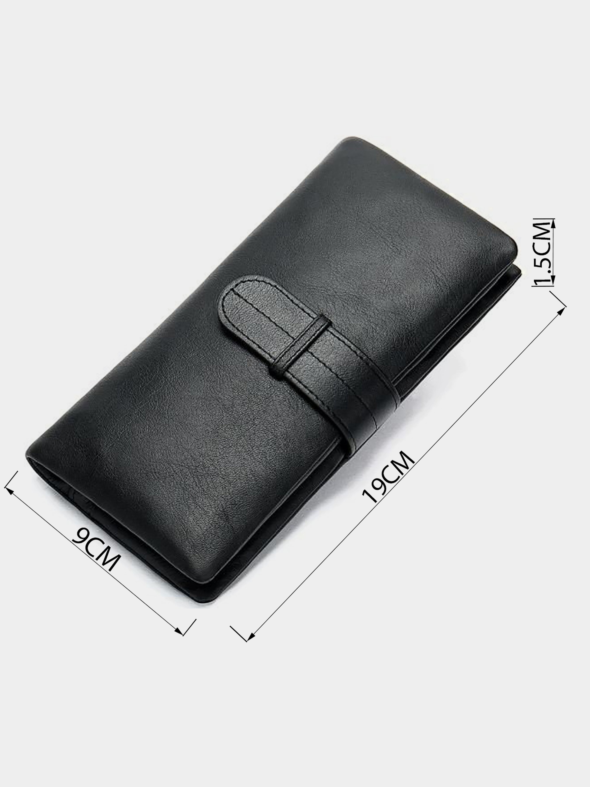 Материал: натуральная кожа высокого качества. Цвет: черный. Размеры (ШхВхГ, см): 9х19х1,5 см. Страна производитель: Китай. Бренд: Vintage. Описание: - 2 открытых кармана для денег; - карман на молнии; - монетница на кнопке; - 4 открытых кармана; - 8 ячеек для кредиток (одна под сеткой); - кошелек закрывается на хлястик. Внутри аксессуар кожаный в сочетании с текстилем. Вместительный вертикальный кошелек спокойно поместится в вашу сумку и отлично подойдет к вашему образу. Дизайн кошелька изготовлен в классическом стиле и продуман до мелочей для вашего удобства. Кошелек дополнен разнообразными карманами, чтоб ваши вещи не путались и не мешались. По краям аксессуар прошит коричневой строчкой в тонах аксессуара.