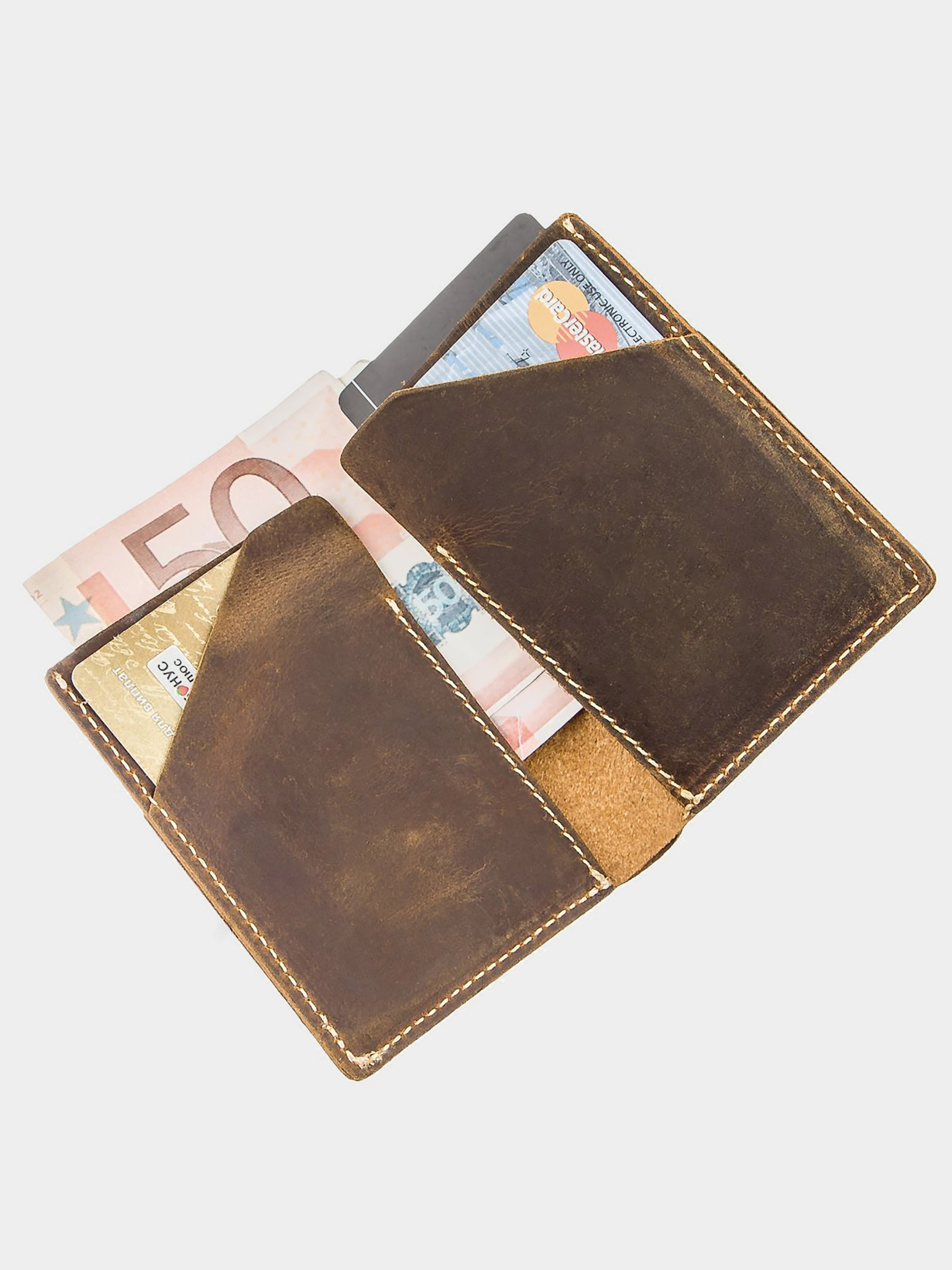 Материал: натуральная кожа; Цвет: коричневый; Размеры (ШхВхГ, см): 8х9,5х0,5. Страна производитель: Китай. Особенности: - отделение для купюр (в свернутом виде); - два слота для карточек. Компактный бумажник с минимальным размером темно-коричневого цвета. Модель обладает минимальным, но самым необходимым функционалом. Бумажник вместится в карман брюк. Изделие подходит как мужчинам, так и женщинам. Винтажная кожа, из которой выполнен бумажник пользуется особенной популярностью среди клиентов. А ее основной изюминкой является то, что со временем на такой коже выступают своеобразные царапины и потертости, которые придают ей шарм. Такой бумажник будет чудесным подарком для ваших близких.