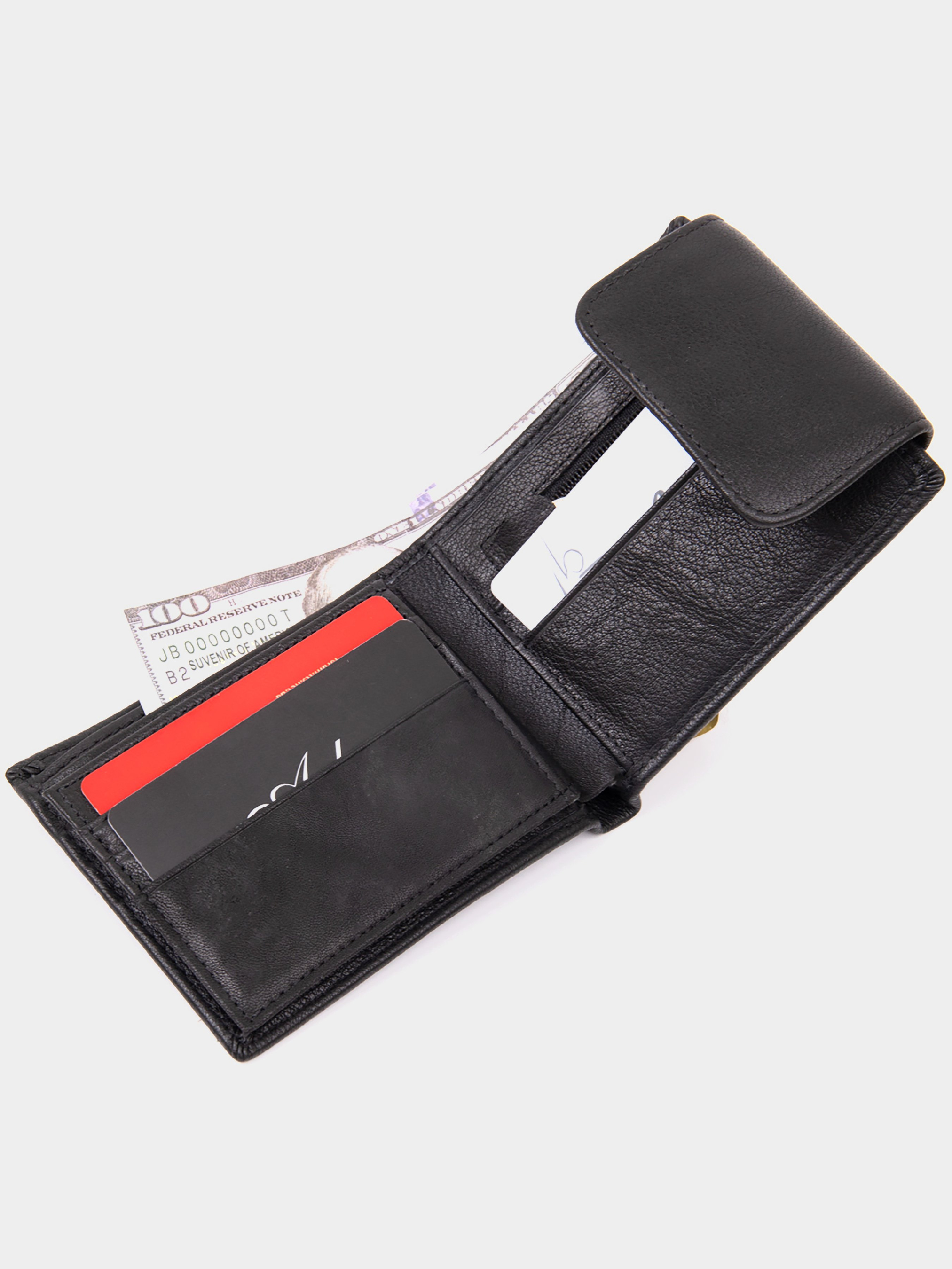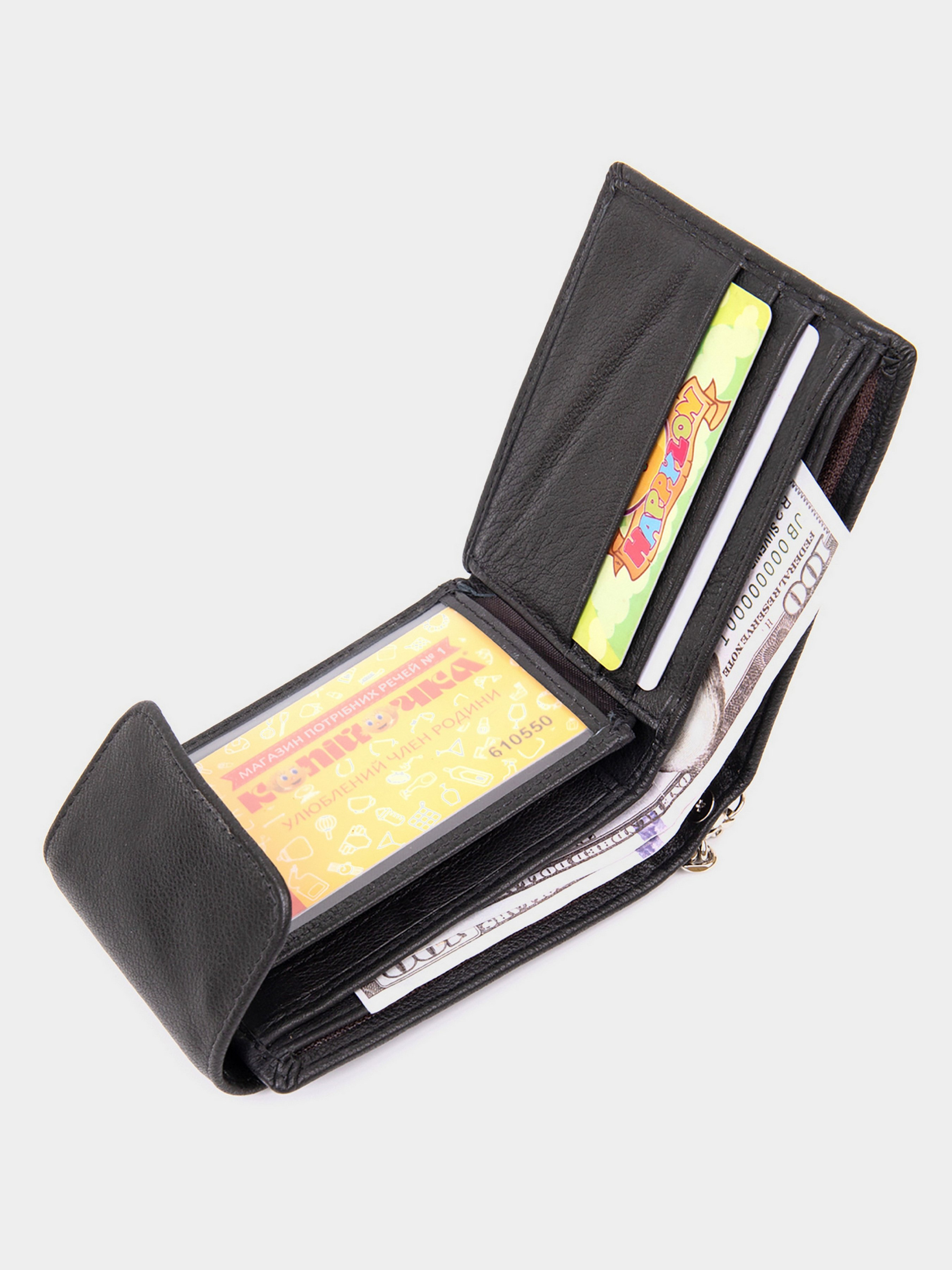 Цвет: черный; Материал: натуральная кожа; Размер (ШхВхГ, см): 11х9х1. Страна производитель: Китай. Бренд: Vintage. Особенности: - три отделения (одно на молнии); - девять ячеек для кредиток (одна под пленкой); - кармашек на молнии (может быть использован для монет); - закрывается на кожаный хлястик с кнопкой. Портмоне для мужчины и женщины в классическом черном цвете с непринужденным дизайном. Тонкое и мягкое кожаное портмоне со слотами для кредиток кармашком для монет и отделениями для купюр. Аксессуар очень стильный и дополнен самым необходимым функционалом без лишних деталей. Портмоне имеет цепочку с карабином. За нее вы сможете подцепить ваш аксессуар за лямки пояса и таким образом обеспечить ему дополнительную безопасность от кражи. Хотим отметить, что цепочка у модели не снимается. Купюры помещаются в развернутом виде. Аксессуар - лучший подарок как для себя, так и на подарок.