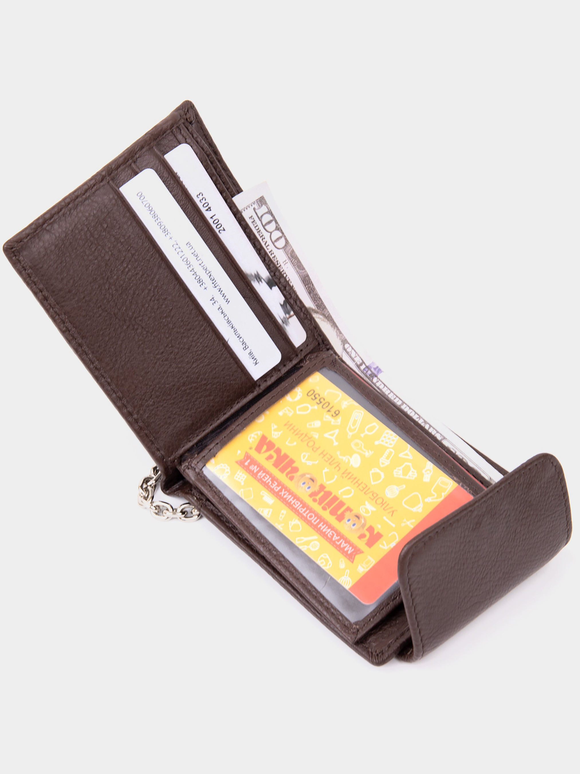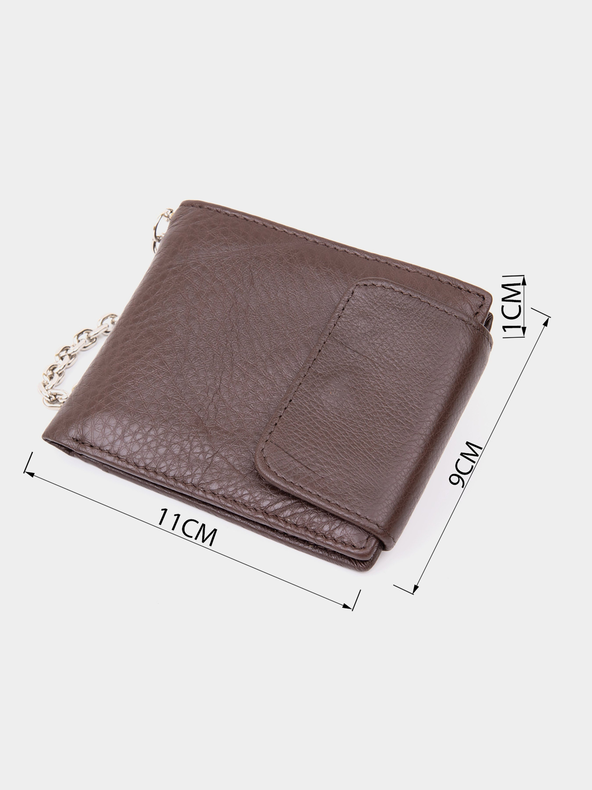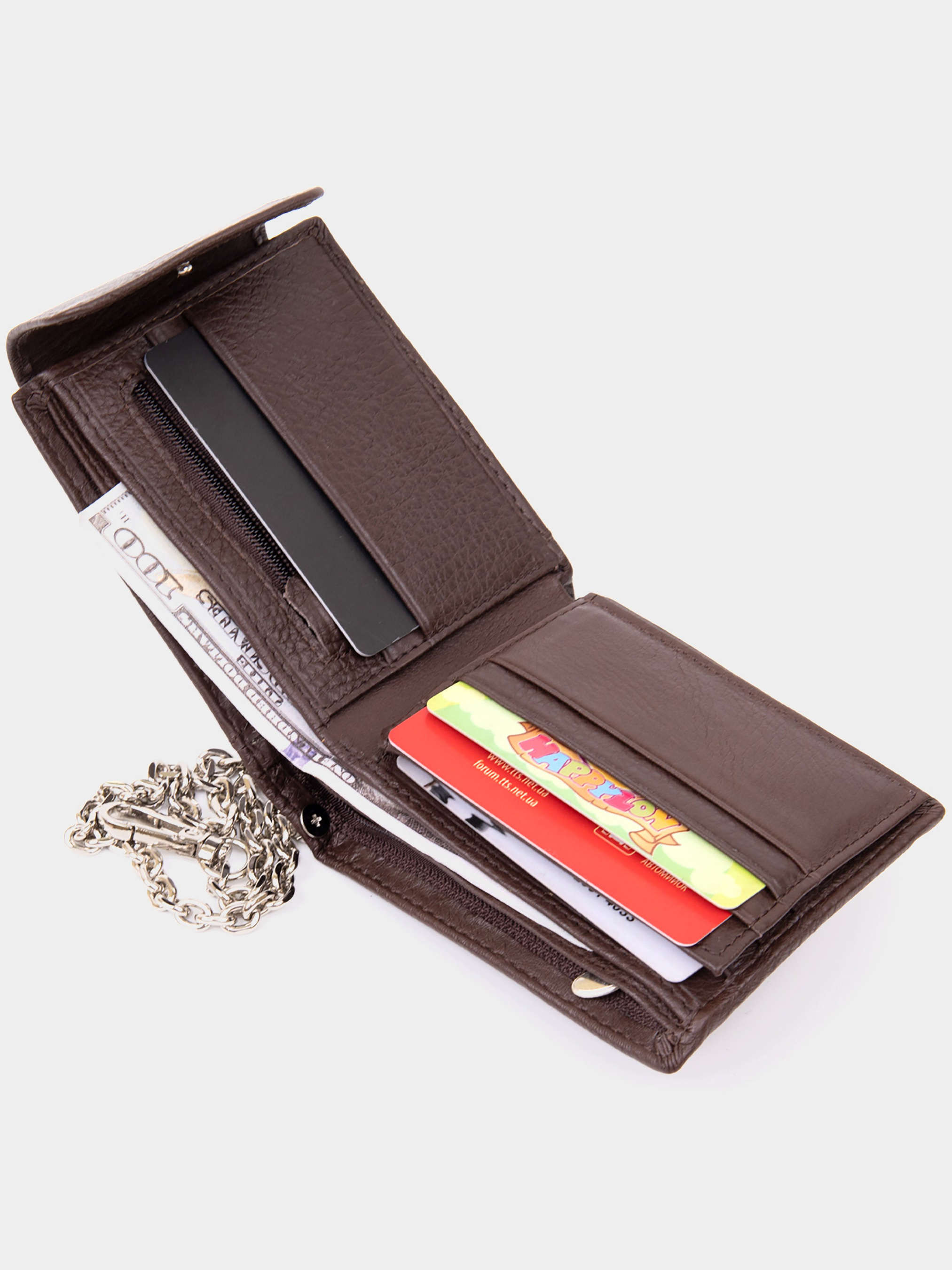 Цвет: коричневый; Материал: натуральная кожа; Размер (ШхВхГ, см): 11х9х1. Страна производитель: Китай. Бренд: Vintage. Особенности: - три отделения (одно на молнии); - девять ячеек для кредиток (одна под пленкой); - кармашек на молнии (может быть использован для монет); - закрывается на кожаный хлястик с кнопкой. Тонкое и мягкое кожаное портмоне со слотами для кредиток кармашком для монет и отделениями для купюр. Дизайн портмоне идеально подобран под современного клиента. Аксессуар имеет застежку с карабином на конце. Таким образом вы сможете зафиксировать портмоне с помощью карабина за лямки пояса. Ваше портмоне будет в безопасности. Изделие имеет самый необходимый функционал без лишних деталей. Кожаное портмоне прослужит вам далеко не один год. Идеальный подарок для ваших близких и знакомых.