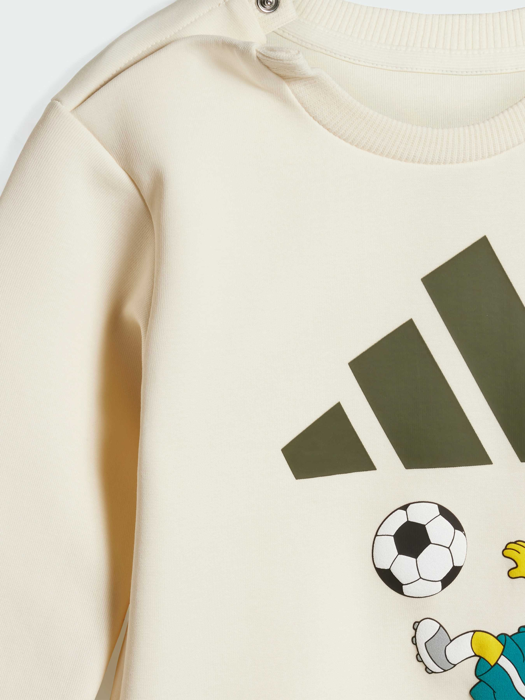 Характеристики 95% бавовна, 5% еластан Круглий виріз горловини Стандартний крій Опис Цей комплект для малюків від adidas ідеально підійде як для перших кроків, так і для активного повзання. У комплект входять м'який трикотажний світшот і зручні джогери з еластичним поясом, який полегшує переодягання. Веселі зображення Барта Сімпсона додають образу яскравий і пустотливий акцент.