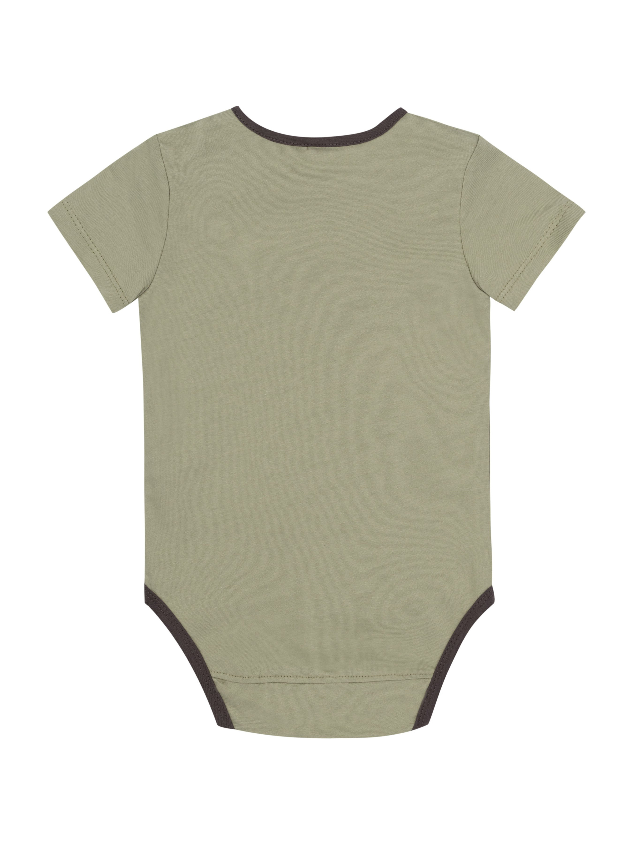 Боді прямого силуету. Тканина однотонна. Перед оздоблений друком. В лівому плечовому шві та по низу виробу є застібки на кнопки. Рукав вшивний, короткий. Горловина оброблена обкантовкою.