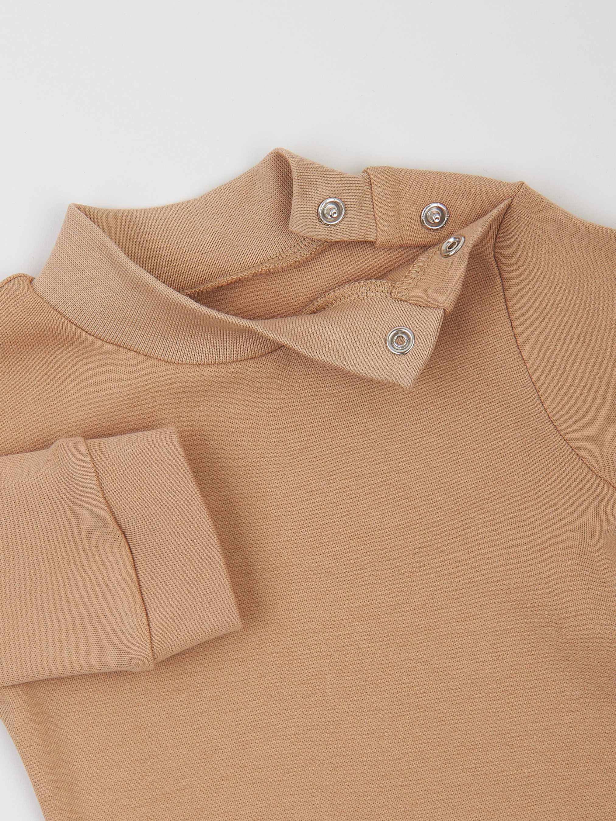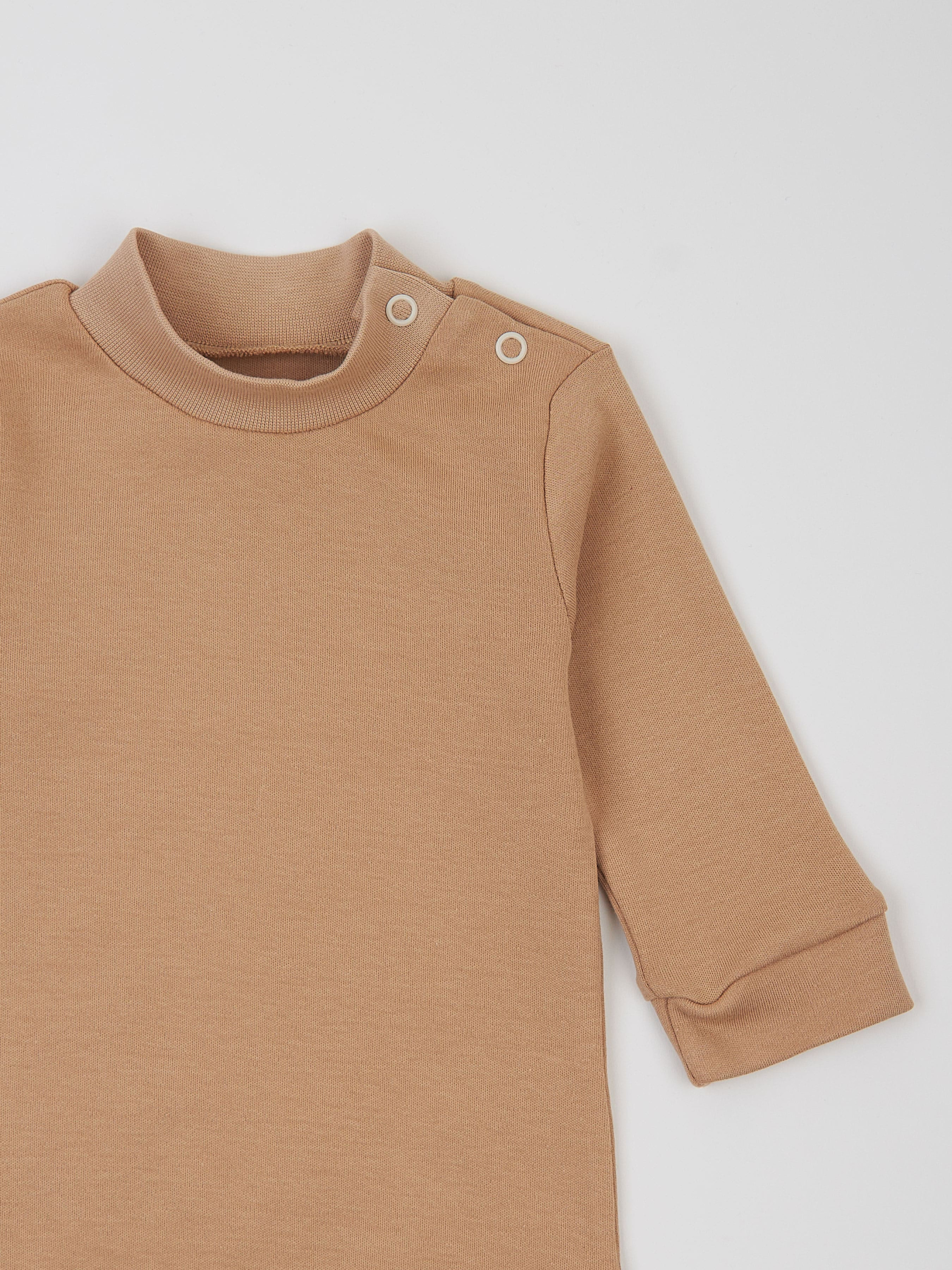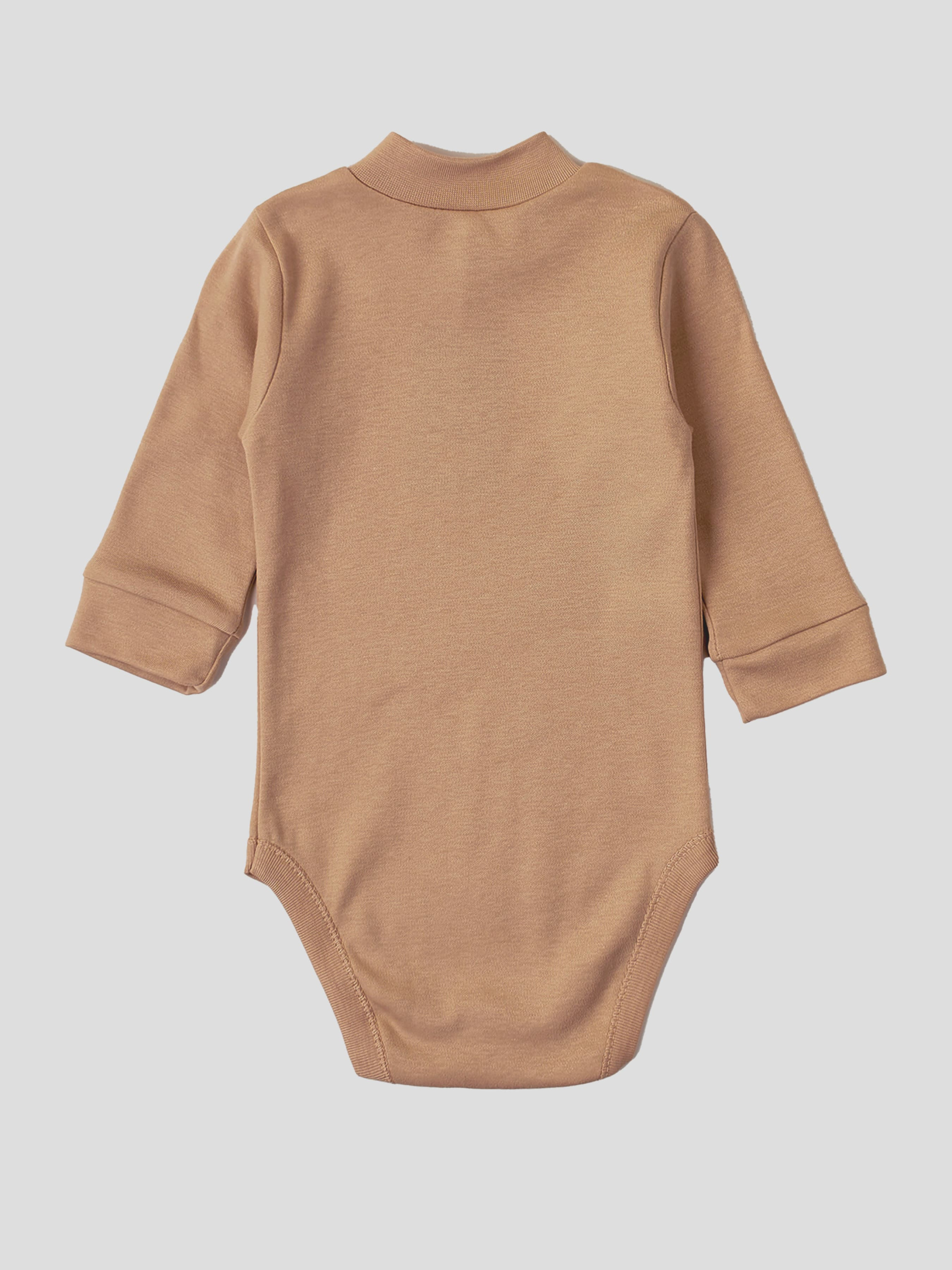 Однотонний боді-гольф — ідеальне рішення для дитячого гардеробу. Виготовлений з м'якої бавовняної тканини з безнікелевою фурнітурою, він забезпечує комфорт і безпеку для ніжної дитячої шкіри. Цей боді також прикриває шию дитини у прохолодну погоду, а кнопки на плечі та горловині полегшують надягання через голову. Зручно розташовані кнопки внизу дають змогу швидко замінити підгузок, якщо це необхідно. Стриманий бежевий колір додає універсальності — боді пасуватиме і хлопчику, і дівчинці, ставши базовим елементом будь-якого дитячого гардеробу. Сертифікат OEKO TEX Standard 100; Фурнітура: безнікелева (Німеччина); Вид тканини: інтерлок; Склад: 100% бавовна; Колір основної тканини: бежевий