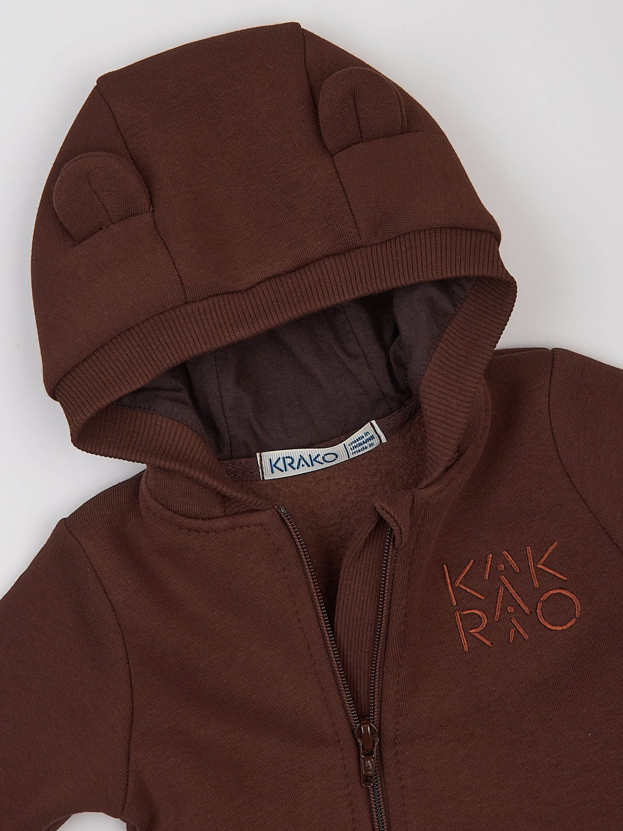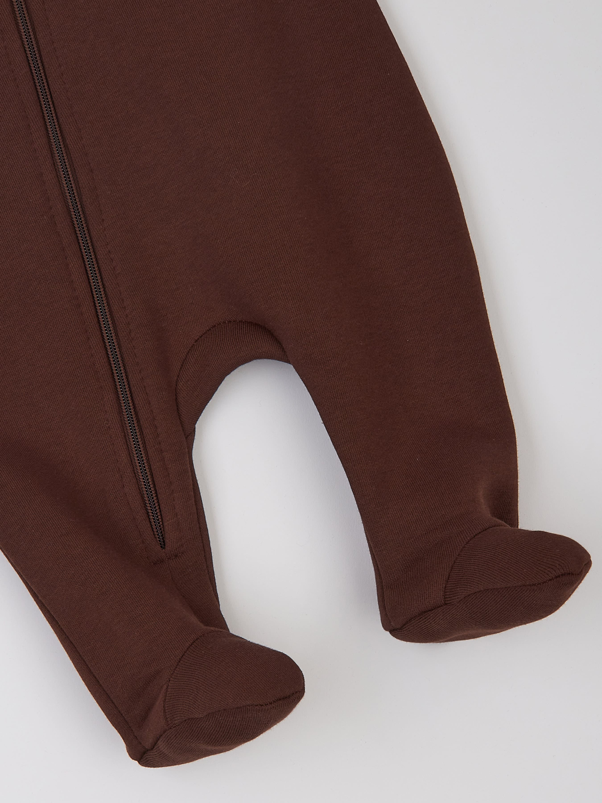 Утеплений трикотажний комбінезон відтінку "шоколад" на блискавці для немовлят — це поєднання комфорту, тепла та стилю, розроблене спеціально для малюків. Глибокий коричневий колір і унісекс-дизайн роблять його чудовим вибором як для хлопчиків, так і для дівчаток, забезпечуючи затишок у прохолодну погоду завдяки високоякісній тринитці з флісовим начосом. Комбінезон оснащений кількома продуманими деталями, що роблять його ідеальним для перших місяців життя дитини. Подовжені манжети зручно відгортаються, дозволяючи за потреби сховати ручки малюка від холоду, що особливо доречно під час прогулянок. Застібка на блискавці спрощує процес одягання й зняття, забезпечуючи практичність для щоденного використання. Блискавка може бути розташована з іншої сторони, ніж на фото — це конструктивна особливість, яка не впливає на зовнішній вигляд, комфорт чи стиль комбінезону. Капюшон із декоративними вушками надає образу малюка особливого шарму, а фірмова вишивка підкреслює унікальність дизайну. Завдяки флісовому начосу комбінезон відмінно зберігає тепло. Цей комбінезон із тринитки — не тільки базовий елемент дитячого гардеробу, але й стильний вибір, який стане в нагоді як для щоденних прогулянок, так і для важливих подій. Склад: 70% бавовна, 30% поліестер; Вид тканини: трикотаж з начосом; Колір основної тканини: коричневий; Принт: однотонний.