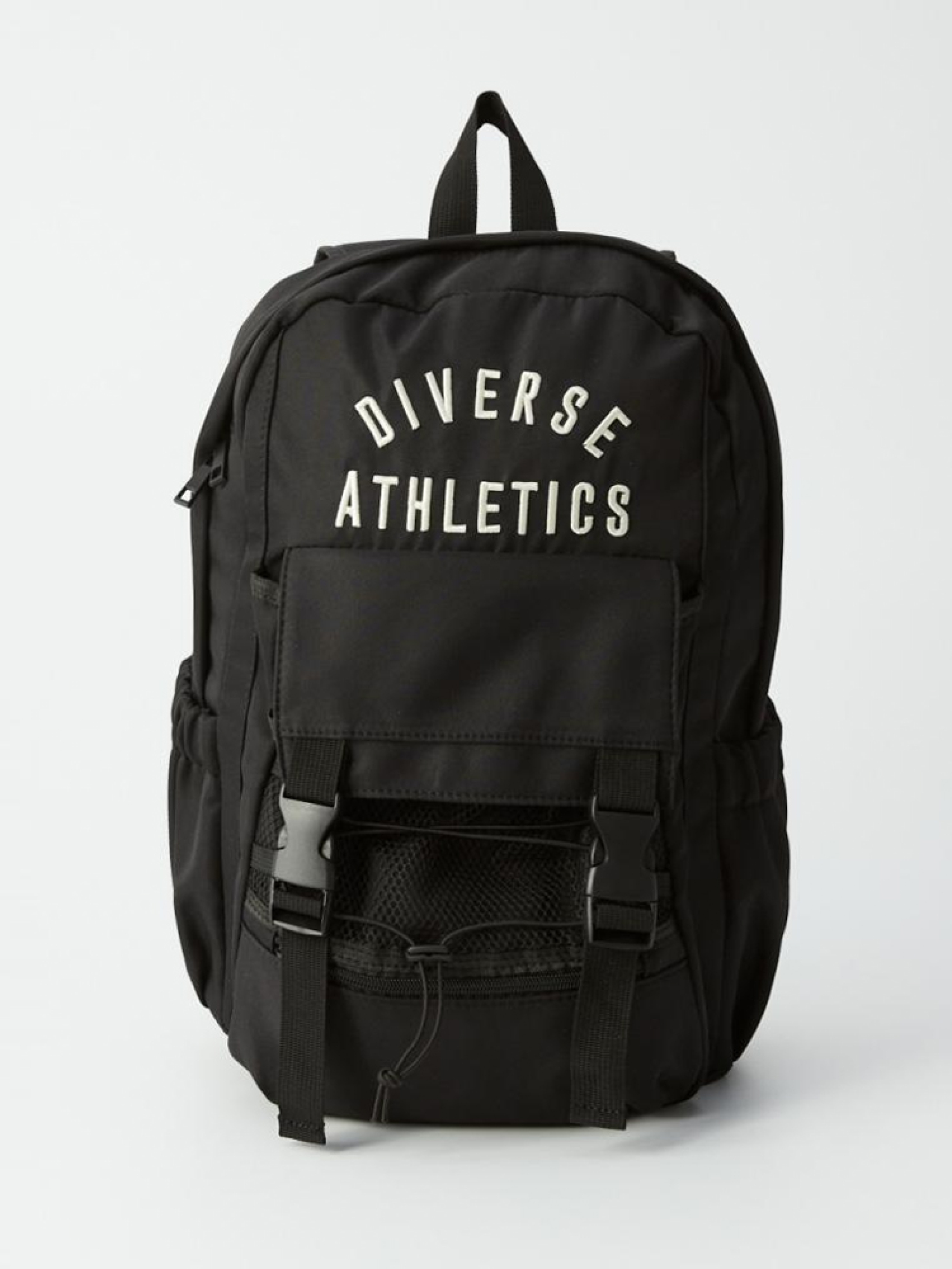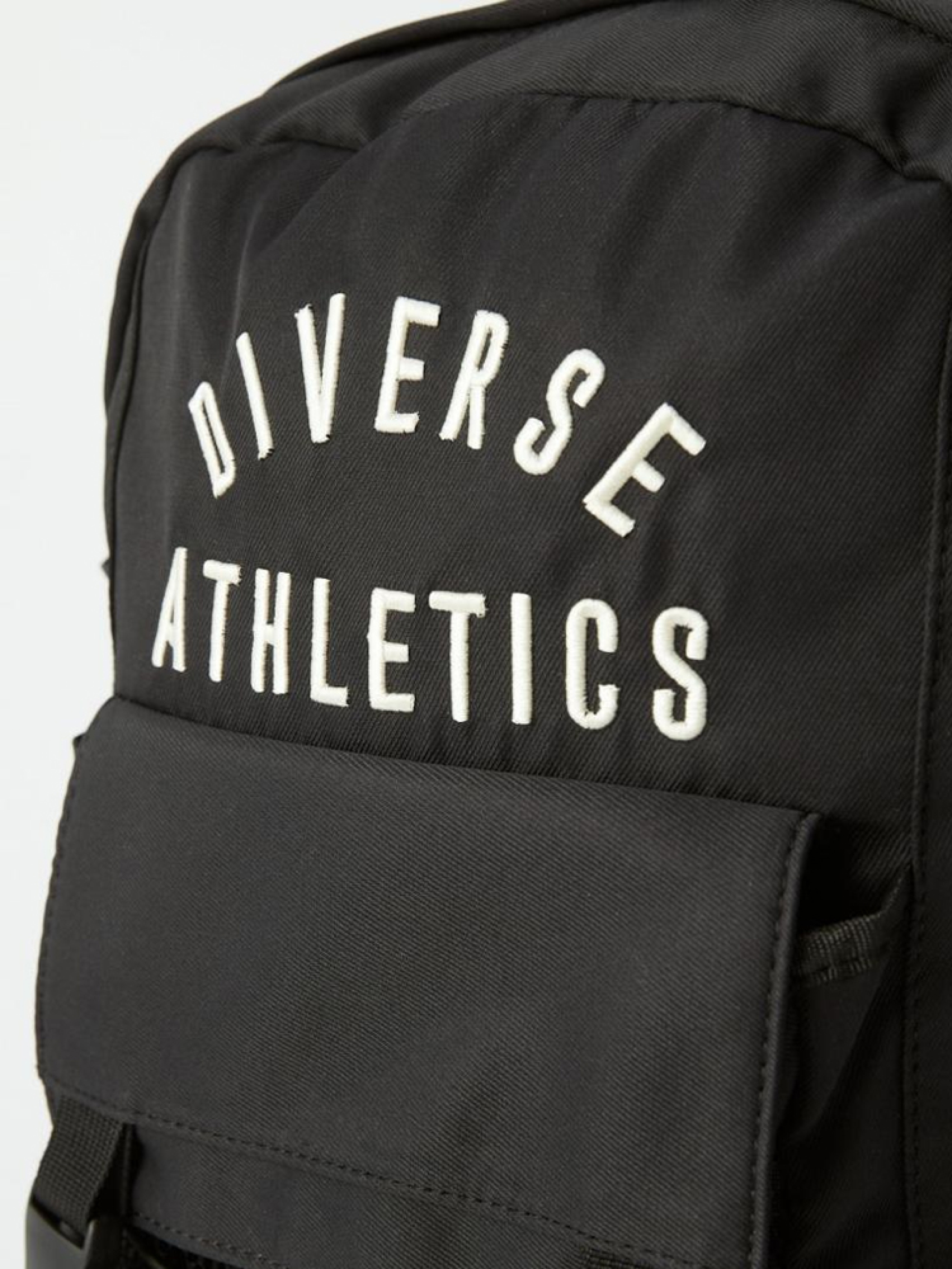 Чорний рюкзак: - основне відділення з органайзером на стінці (включає відділення для ноутбука та два менших відділення), - тканинні кишені з еластичним краєм з боків, - спереду: велика кишеня (ширина 21 см х висота 27 см) на застібці, кишеня на блискавці внизу рюкзака сітчаста кишеня на гумці. - виготовлений з м'якого приємного на дотик матеріалу, - велика 3D вишивка Diverse Athletics, - канва всередині. Розміри рюкзака: ширина 29 см; висота 44 см; глибина 13,5 см. Сезон: Весна/Літо Склад: 100% поліестер.