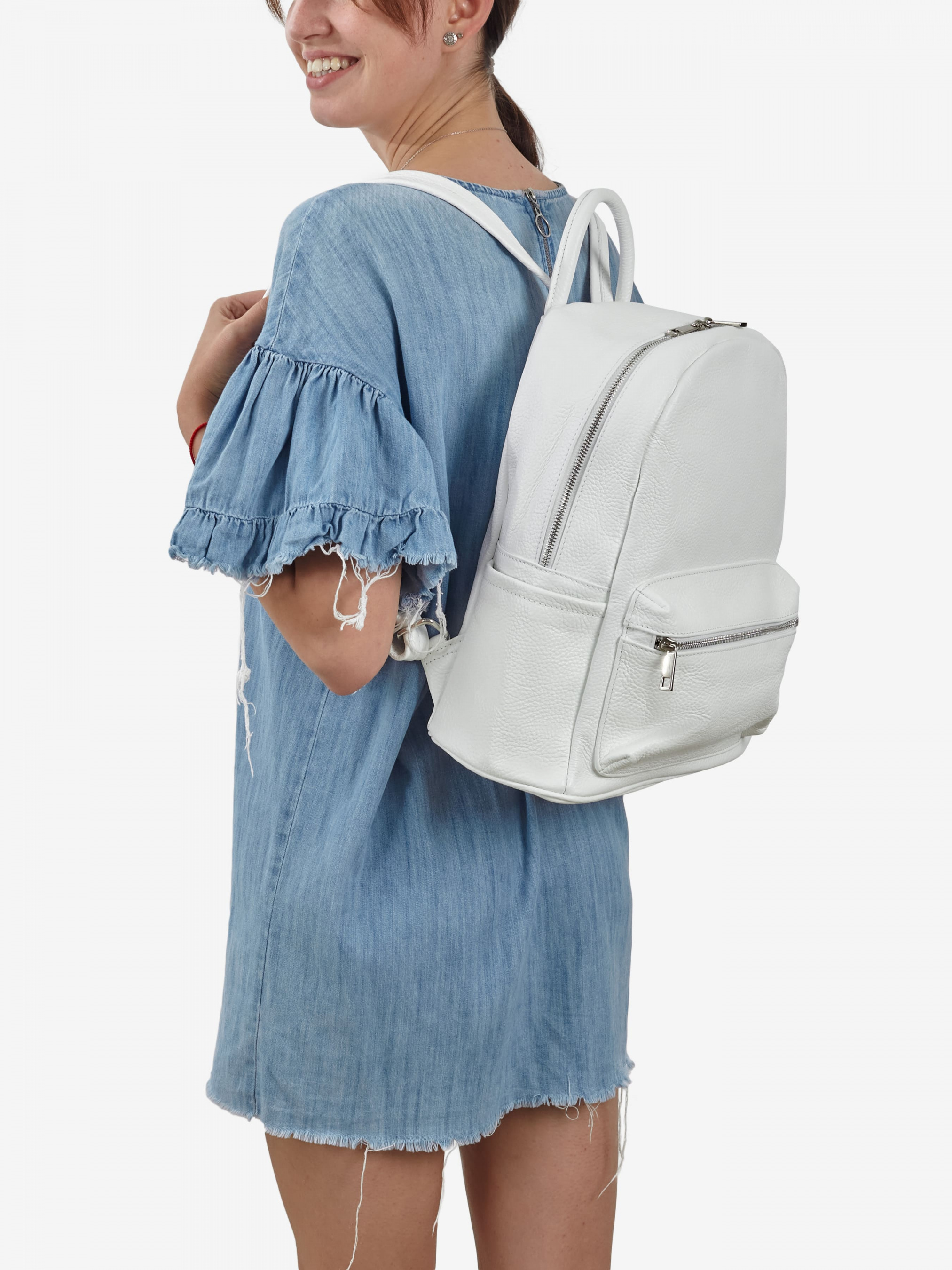 Деталі: Матеріал: 100% натуральна шкіра Шкіра має фактуру флотар Фурнітура сріблястого кольору Розміри (Ш x В x Г) - 31 x 34 x 13 см Всередині 1 відділення та кишенька для дрібниць на блискавці Плечові ремені регулюються Підкладка: 100% бавовна Застібка: блискавка Дизайн: Яскраве забарвлення рюкзака Regina Notte не залишить байдужою не одну модницю. Пошитий він з якісної натуральної італійської шкіри. Ця модель передбачає використання виробу у двох варіантах – ndash; як сумку та як рюкзак. У рюкзаку одне відділення на блискавці. У ньому можна носити важливі документи, ноутбук чи планшет. Спереду є містка шкіряна кишеня для телефону або гаманця. Є можливість носити цей рюкзак за ручку або використовувати плечові ремені.