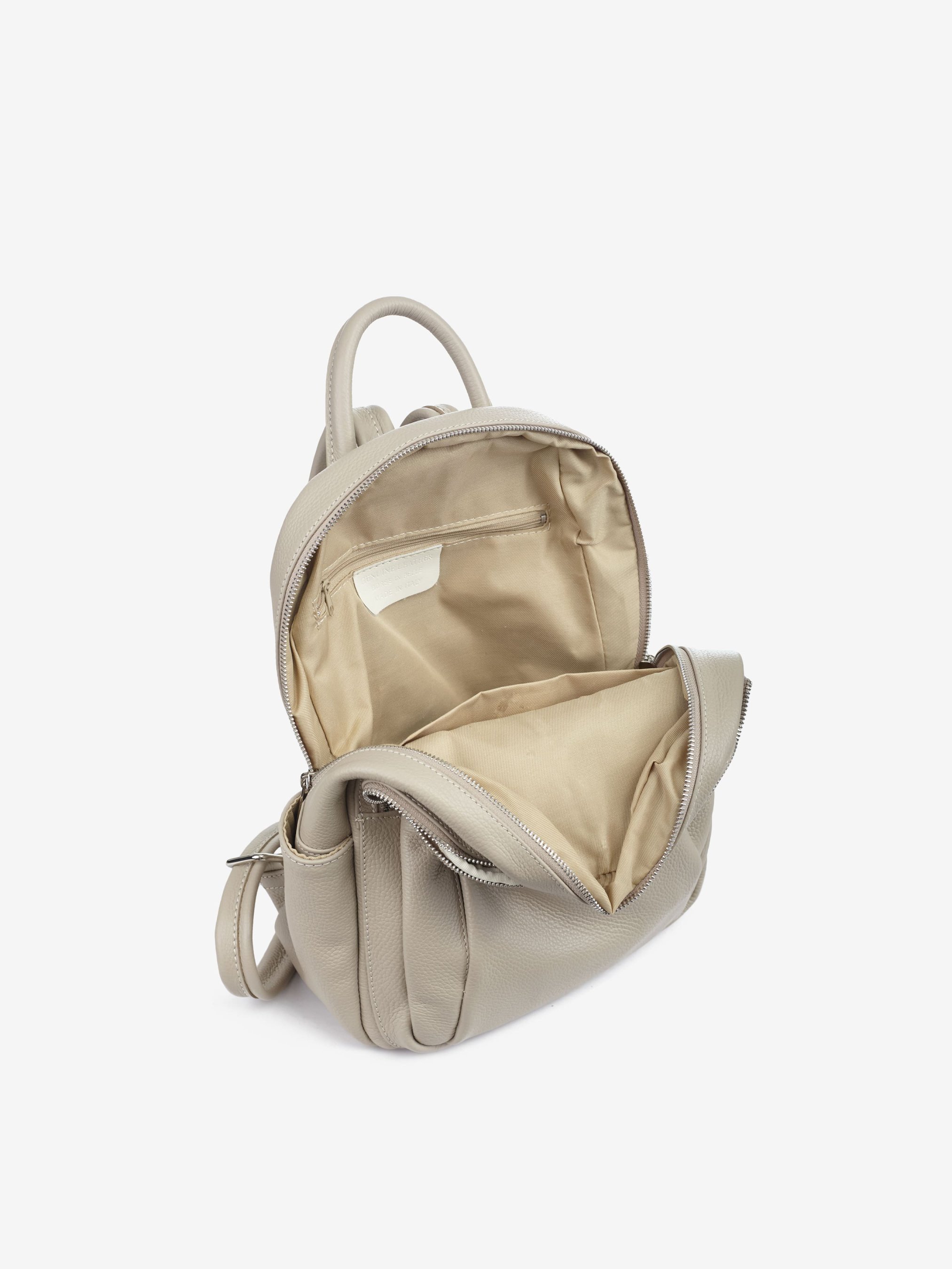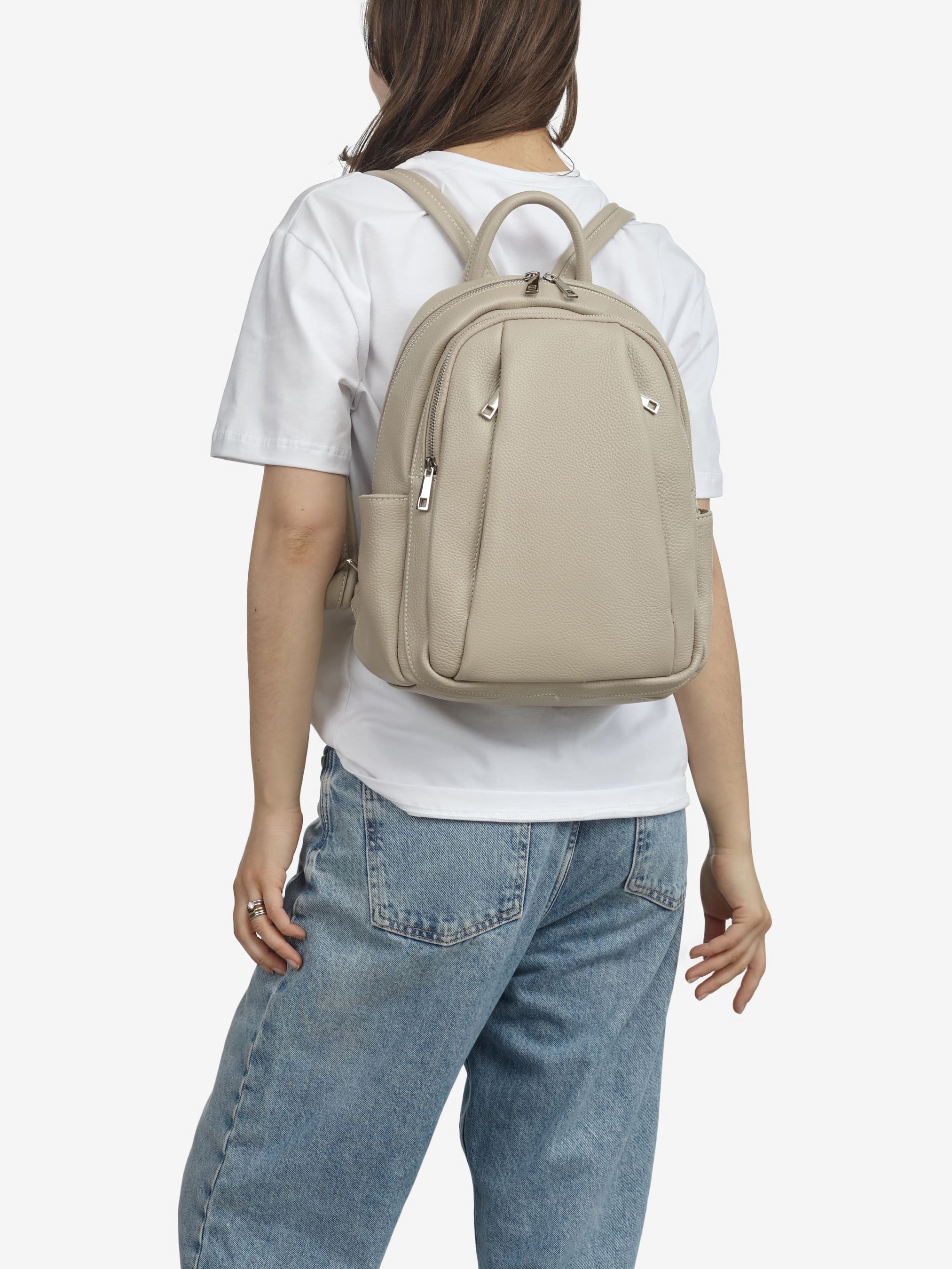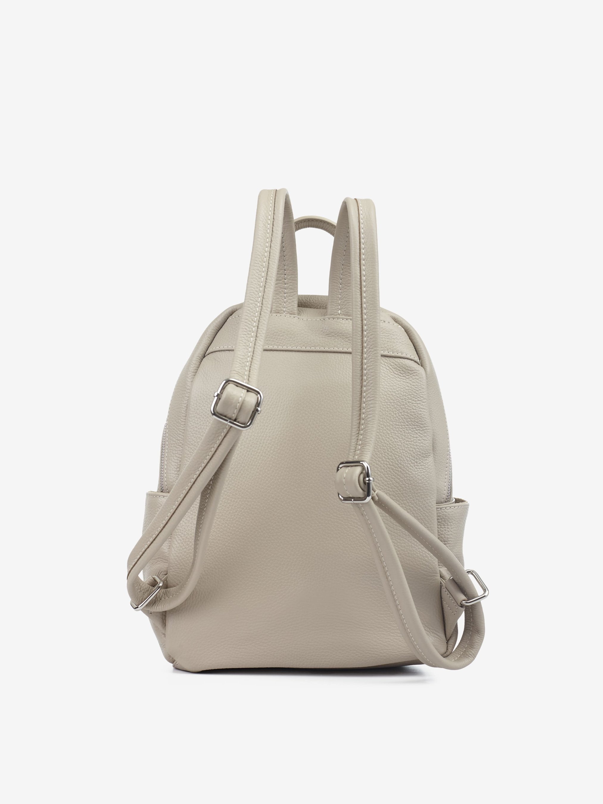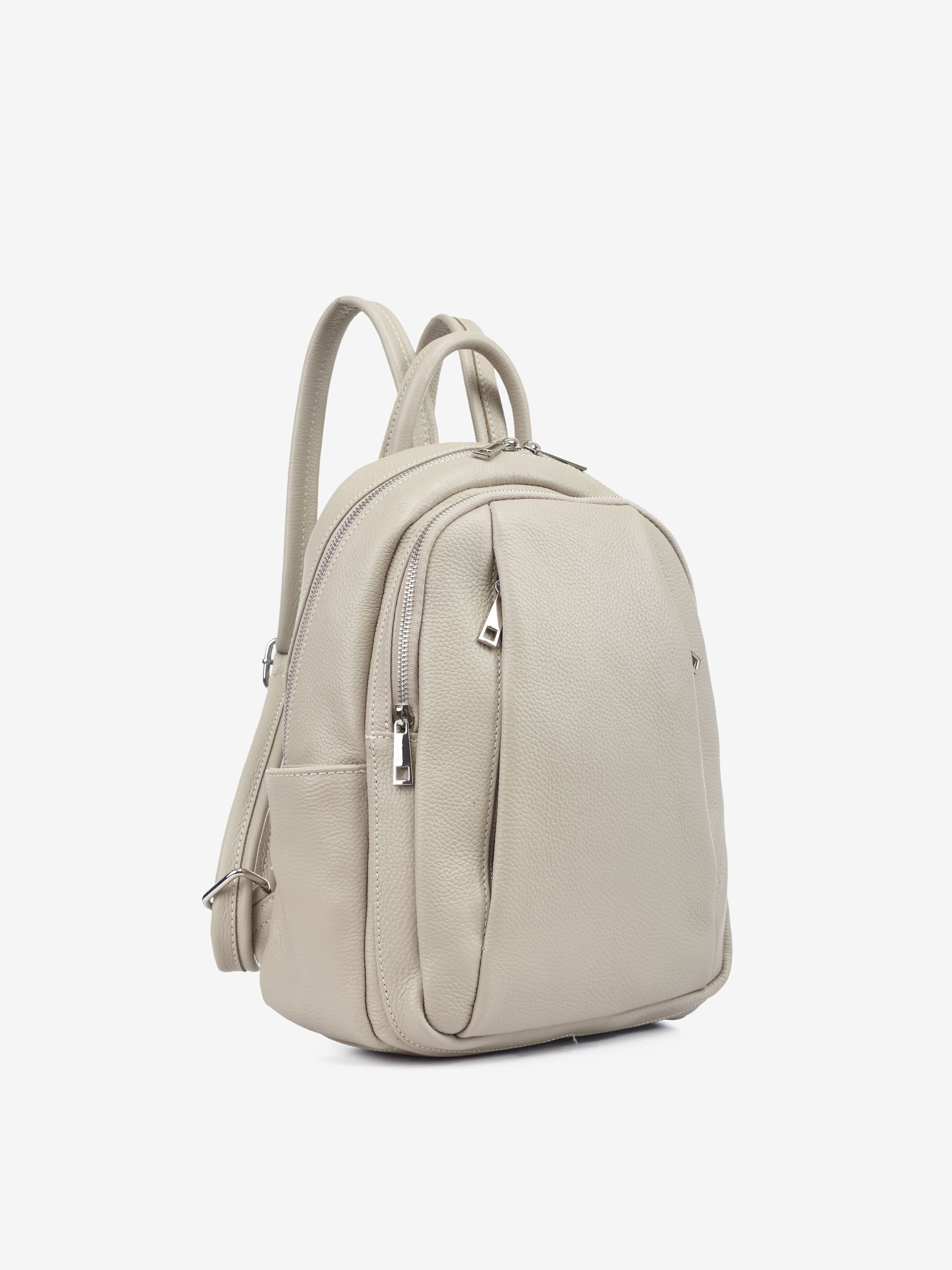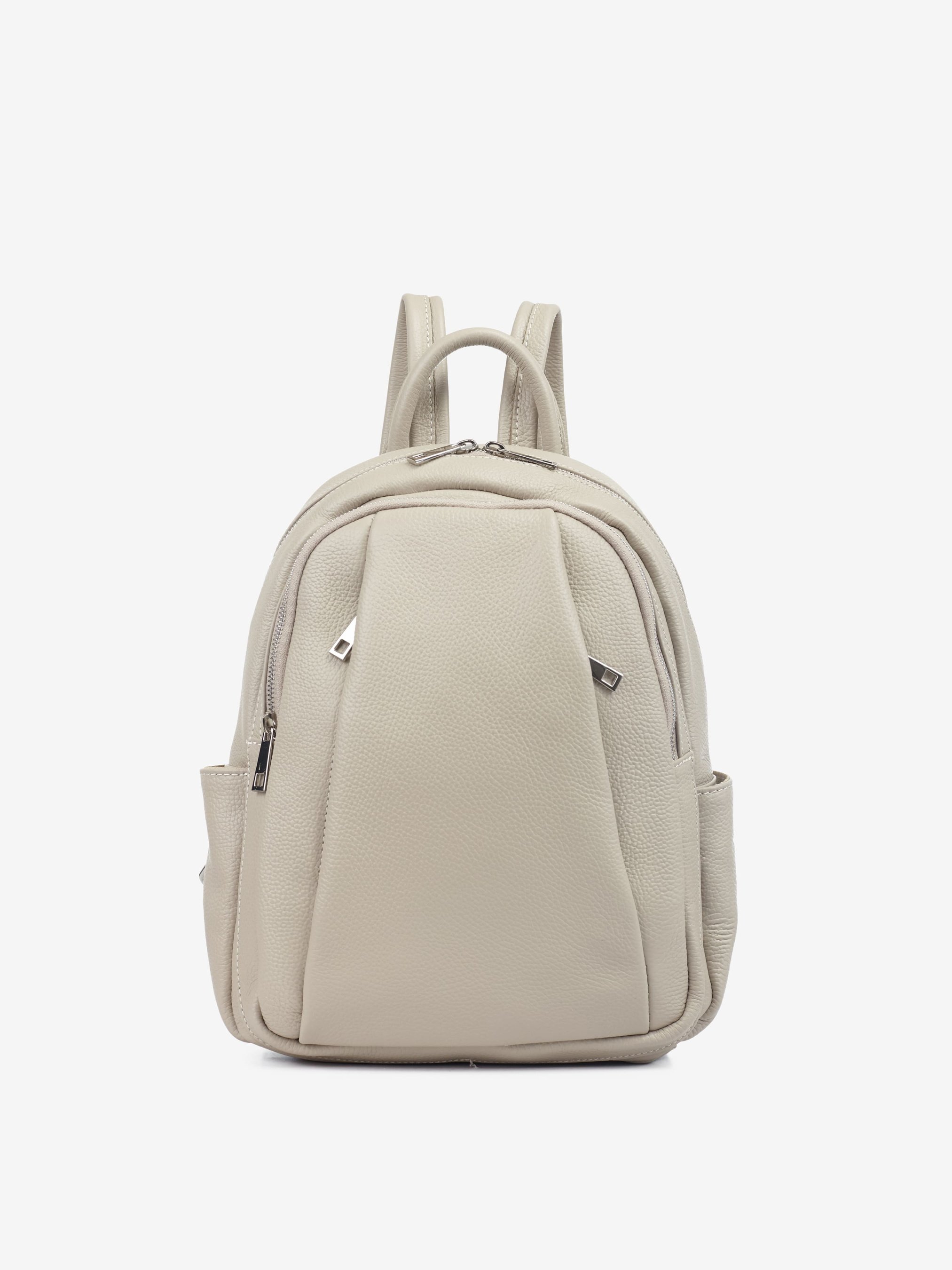 Деталі: Матеріал: 100% натуральна шкіра Шкіра має фактуру флотар Фурнітура сріблястого кольору Розміри (Ш x В x Г) – 23 x 33 x 13 см Усередині: 1 відділення та 2 кишеньки для дрібниць, одна з них на блискавці Спереду 2 вертикальні кишені на блискавці і 1 велика кишеня на блискавці на всю глибину рюкзака з боків кишеньки без застібки Підкладка: 100% бавовна Застібка: блискавка