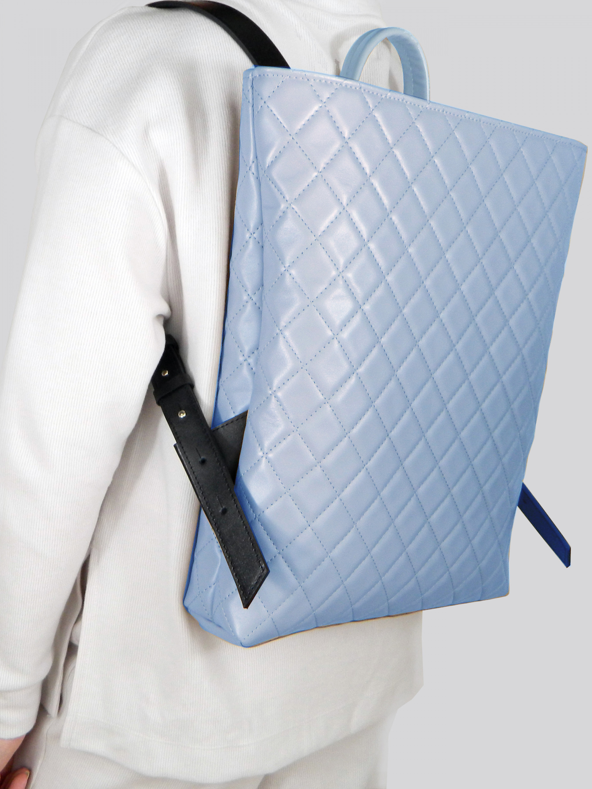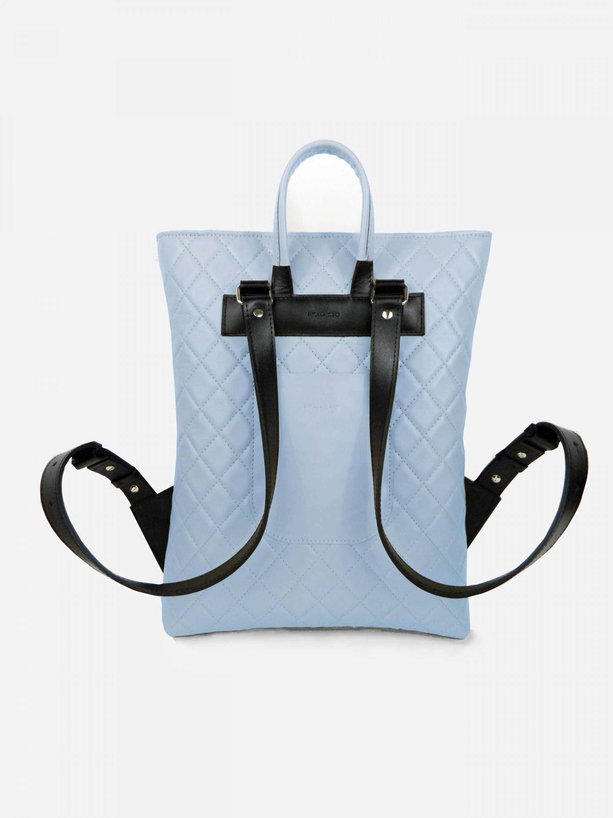 Прямокутний міський стобаний рюкзак із м’якої шкіри блакитного кольору. Закривається на металеву блискавку зверху. Внутрішнє відділення із тканинною підкладкою. Накладна кишеня з тильного боку і кишеня на блискавці всередині. Ручка для підвішування та регульовані лямки з гладкої чорної шкіри. Модель “Bilancia” – виглядає неймовірно привабливо. Відчуйте неперевершений стиль,якість і функціональність цього стьобаного шкіряного рюкзака!