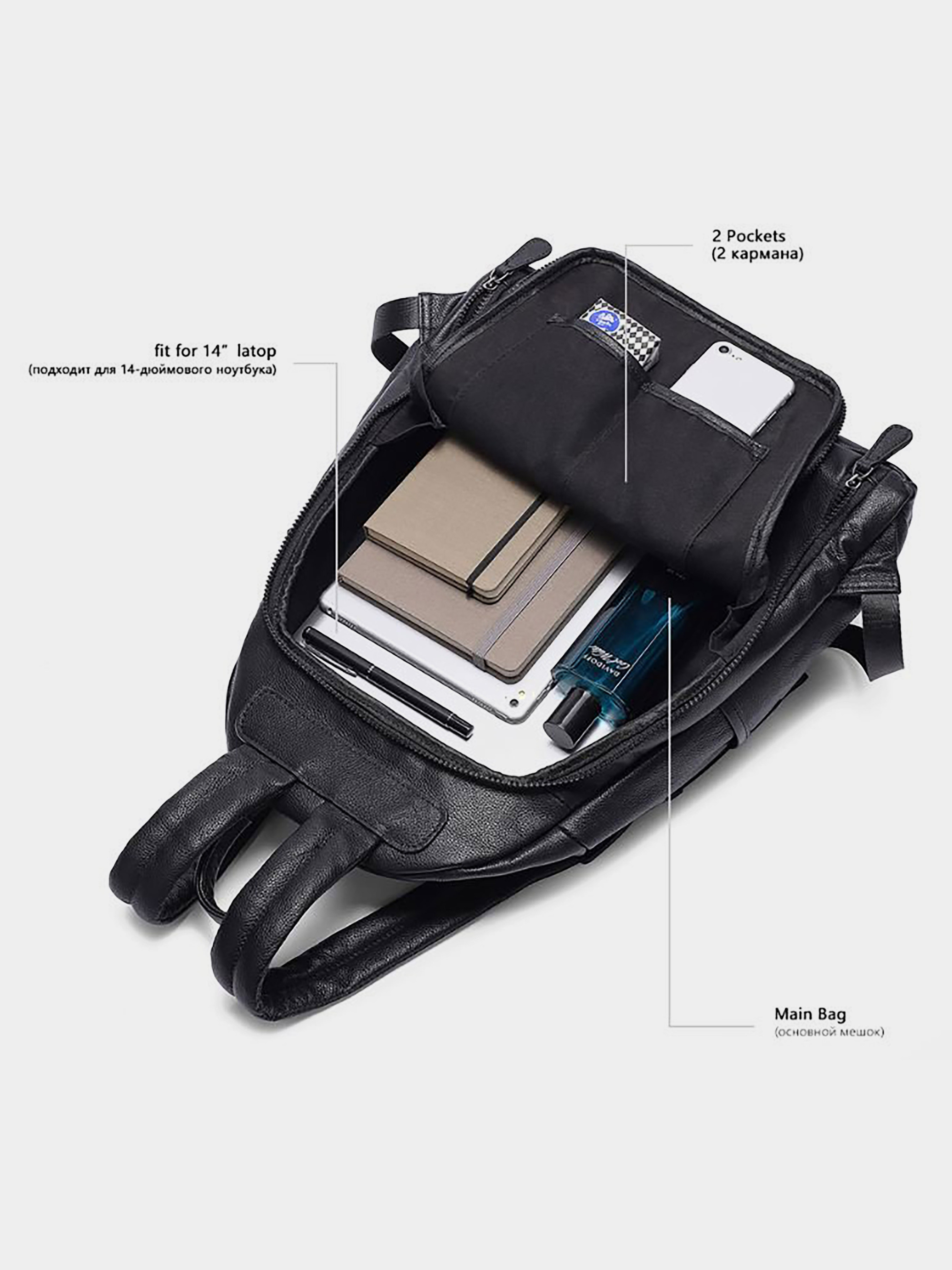 Матеріал: натуральна шкіра високої якості; Колір: чорний; Розміри (ШхВхГ, см): 36х39х18. Країна виробник: Китай. Бренд: Vintage. Особливості: - основне відділення на блискавці, яке широко розкривається; - дві відкриті кишені для мобільного; - потайна кишеня на блискавці на задній стінці; - вертикальна бічна кишеня на блискавці; - накладна кишеня на блискавці на лицевій стороні; - кишеня відкритого типу збоку. Дуже вмісткий шкіряний рюкзак класичного кольору. Аксесуар м'який на дотик. Відмінний варіант як для міста, так і в поїздку. Модель підійде як для чоловіків, так і для жінок. Аксесуар не важкий. Рюкзак дуже добре носиться і зручний у використанні. Колір фурнітури: темний метал. По краях прошитий світлою ниткою. Підкладка даного аксесуара виконана з міцного текстильного матеріалу чорного кольору. Є ручка для зручного носіння в руці і лямки - на плечі. Ідеальний і довгоочікуваний подарунок для близької людини. Впевнені, якістю ви будете задоволені. Рюкзак упакований в тканинний мішок.