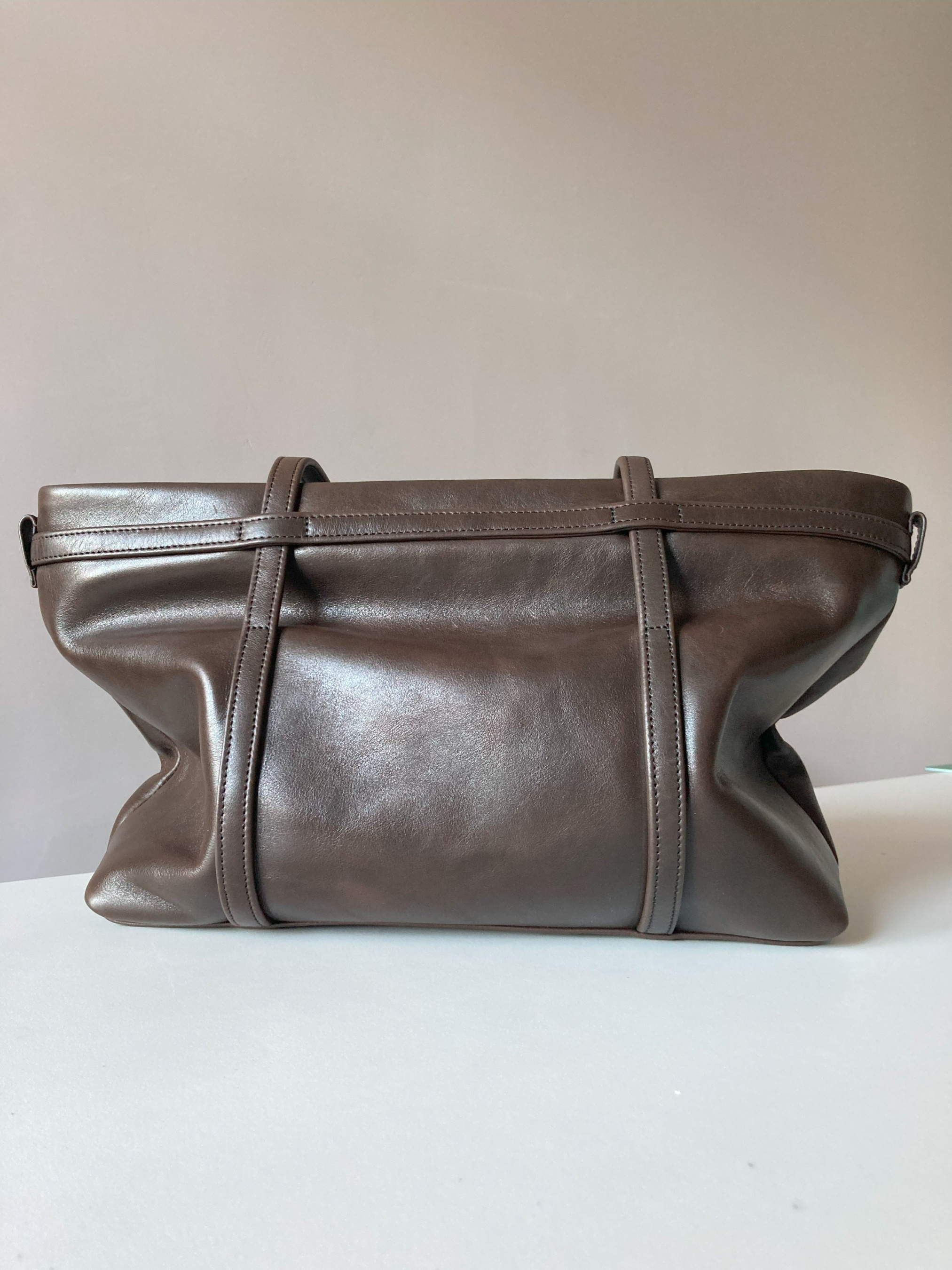 Містка м'яка сумочка із натуральної шкіри. Всередині кишеня на блискавці та кишенька без застібки. Підкладка бавовняна, дно всередині шкіряне. Розмір - 34см / 26см / 12см. Вміщує ноутбук 15". Довжина ручок 60 см, ширина 1,5 см. Колір фурнітури - срібло. Застібка - блискавка. Колір - темно-коричневий. Сумочка виготовлена в Україні.