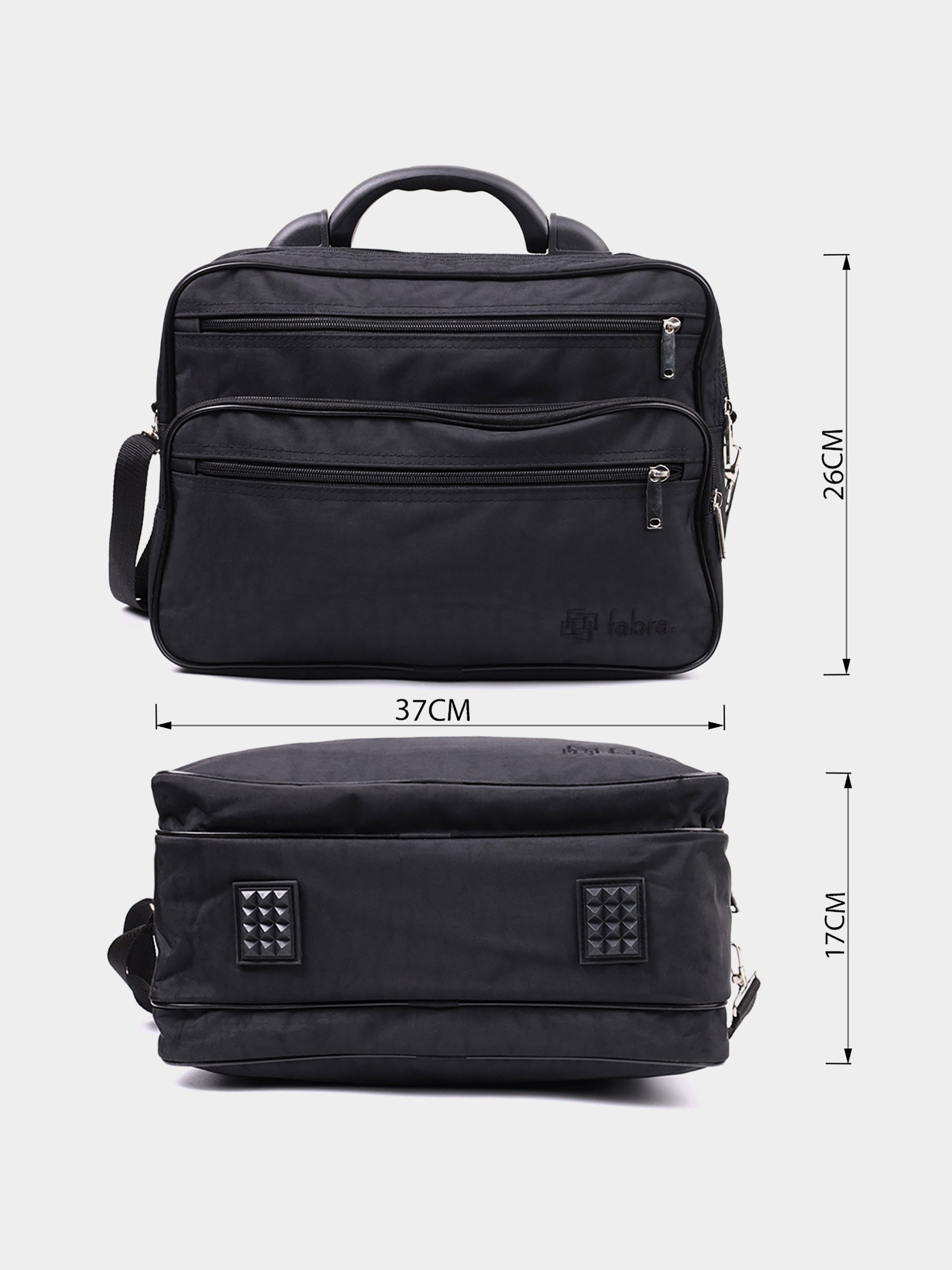 Матеріал: поліестер; Колір: чорний; Розміри (ШхВхГ, см): 37х26х17см; Бренд: FABRA; Країна виробник: Україна. Особливості: - два основні відділення на блискавках; - три кишені, що закриваються блискавками на лицьовій стороні; - не ковзаючі гумові ніжки для захисту дна сумки; - добротна пластикова ручка для носіння в руках; - знімний текстильний ремінь, що регулюється; - підкладка з тканини. Середня прямокутна сумка на кожен день із якісного матеріалу – поліестеру. Виріб має оптимальний розмір для Вашої зручності, її можна використовувати як сумку на кожен день, а також брати з собою у невеликі подорожі чи відрядження. Функціонал сумки продуманий до дрібниць, вона складається із двох великих відділень та трьох кишень різних розмірів зовні, що дуже важливо для порядку у речах. На лицьовій стороні, у правому нижньому кутку, вишитий значок бренду, що є запорукою якості. Носити аксесуар можна в руках, для цього передбачена пластикова ручка і на плечі за допомогою надійного ременя, що знімається. Пошита сумка акуратно, всі рядки рівні, підкладка міцна чорного кольору, надійна і якісна фурнітура. Тканинна сумка стане бажаним подарунком для ваших близьких і найголовніше дуже корисним та необхідним. Сумка з поліестеру, дуже вигідна альтернатива шкіряним сумкам, тому що прослужить не менше, не втрачаючи свого первісного вигляду, а ціна приємно порадує.