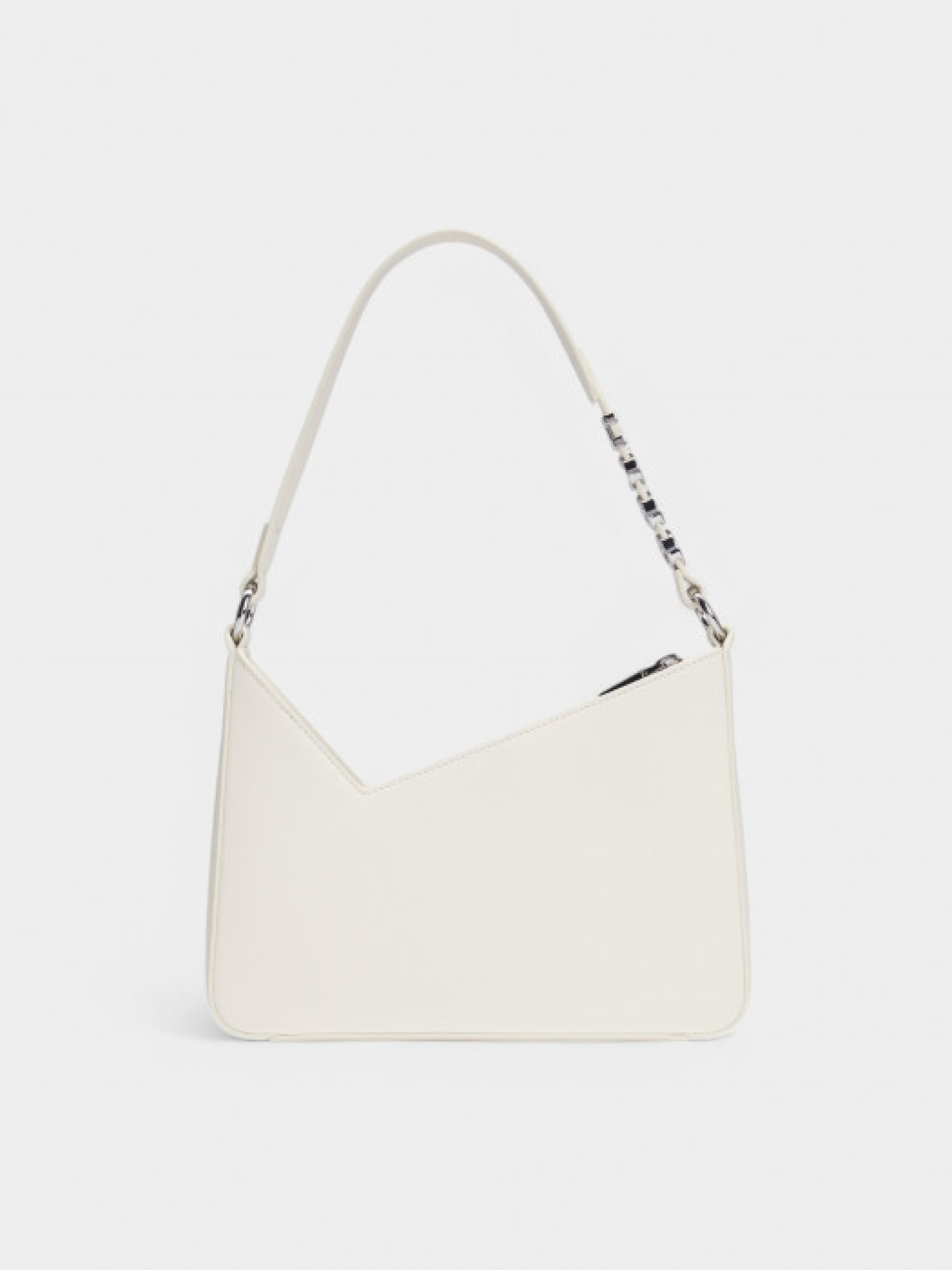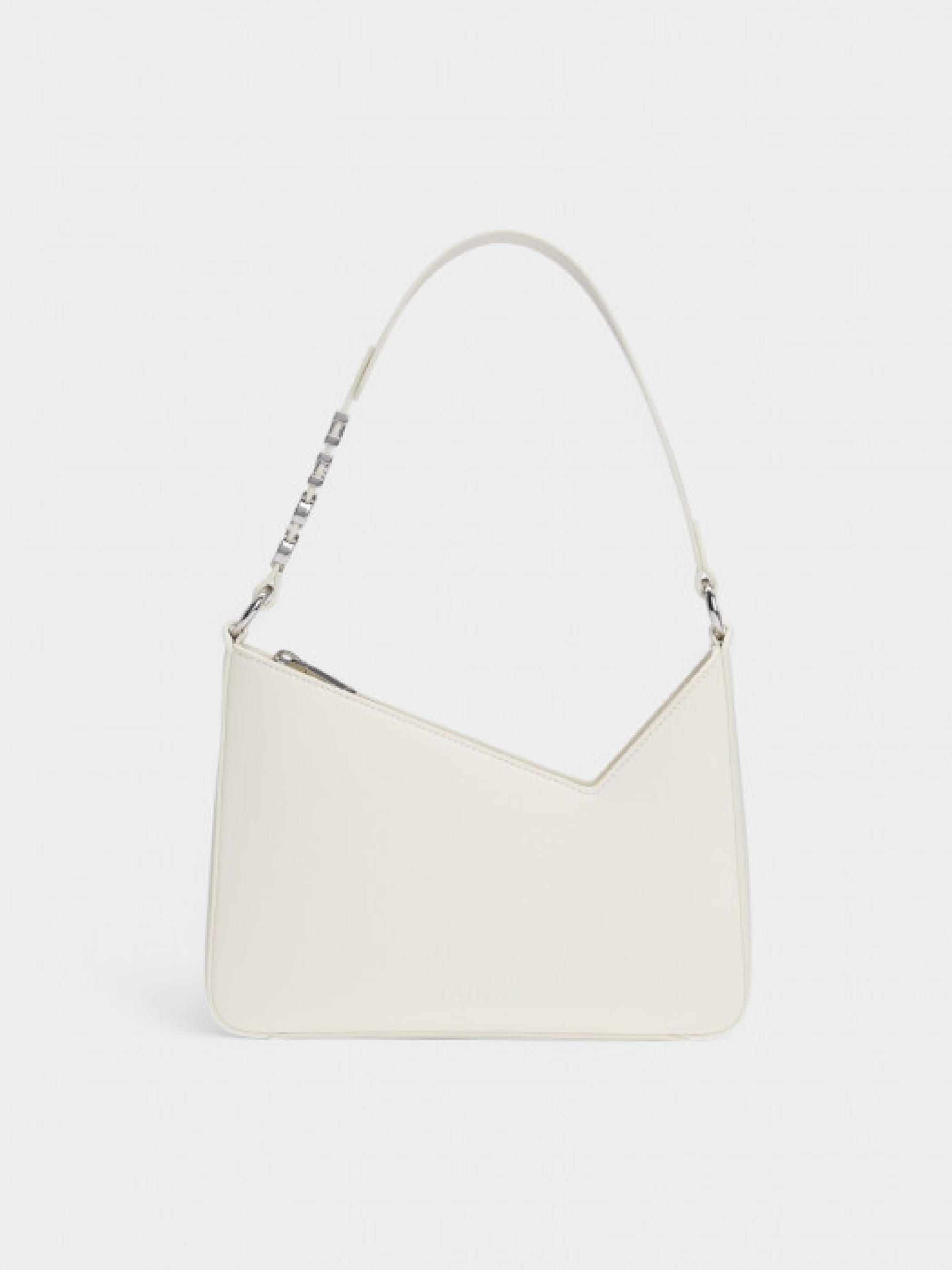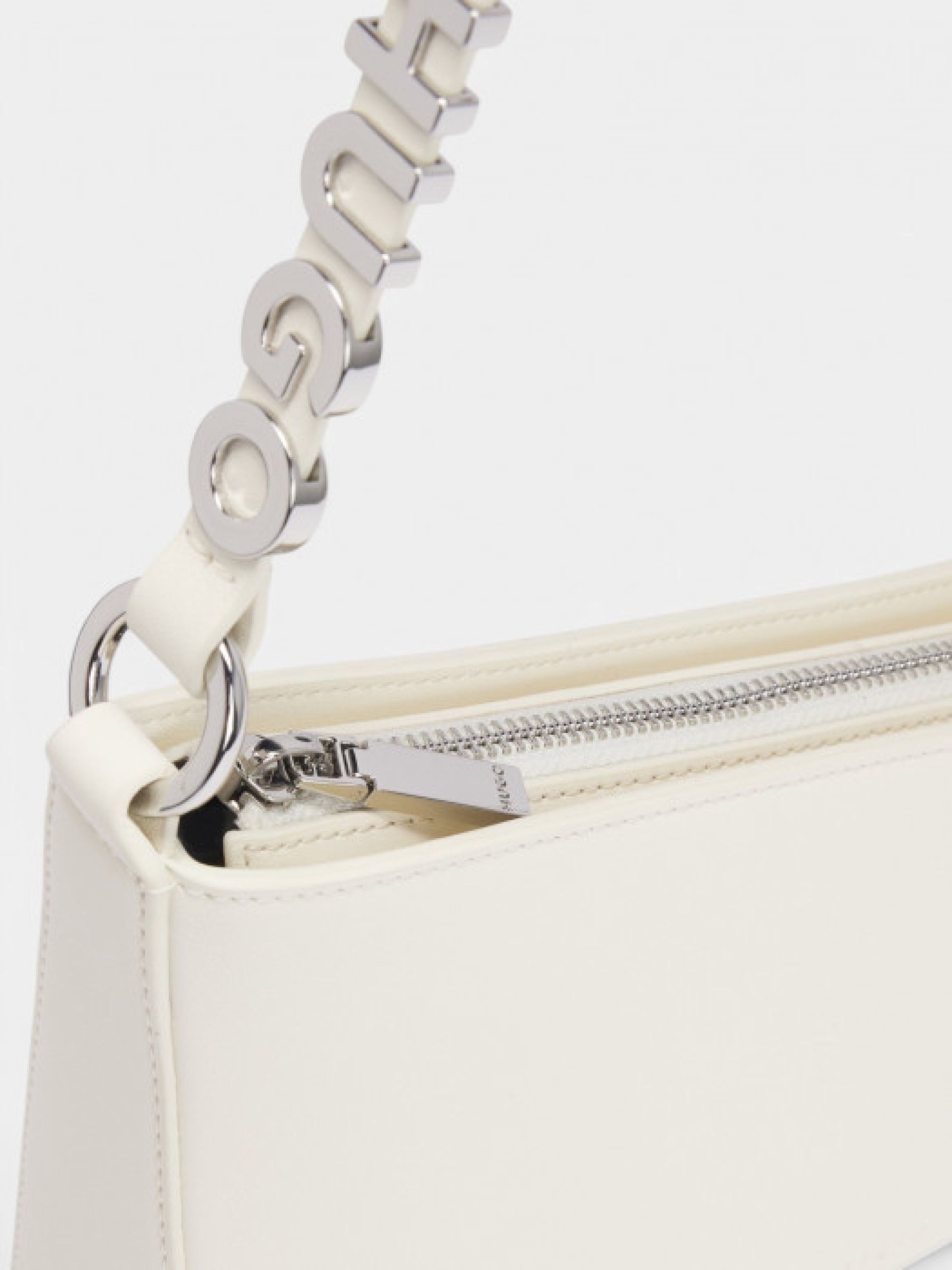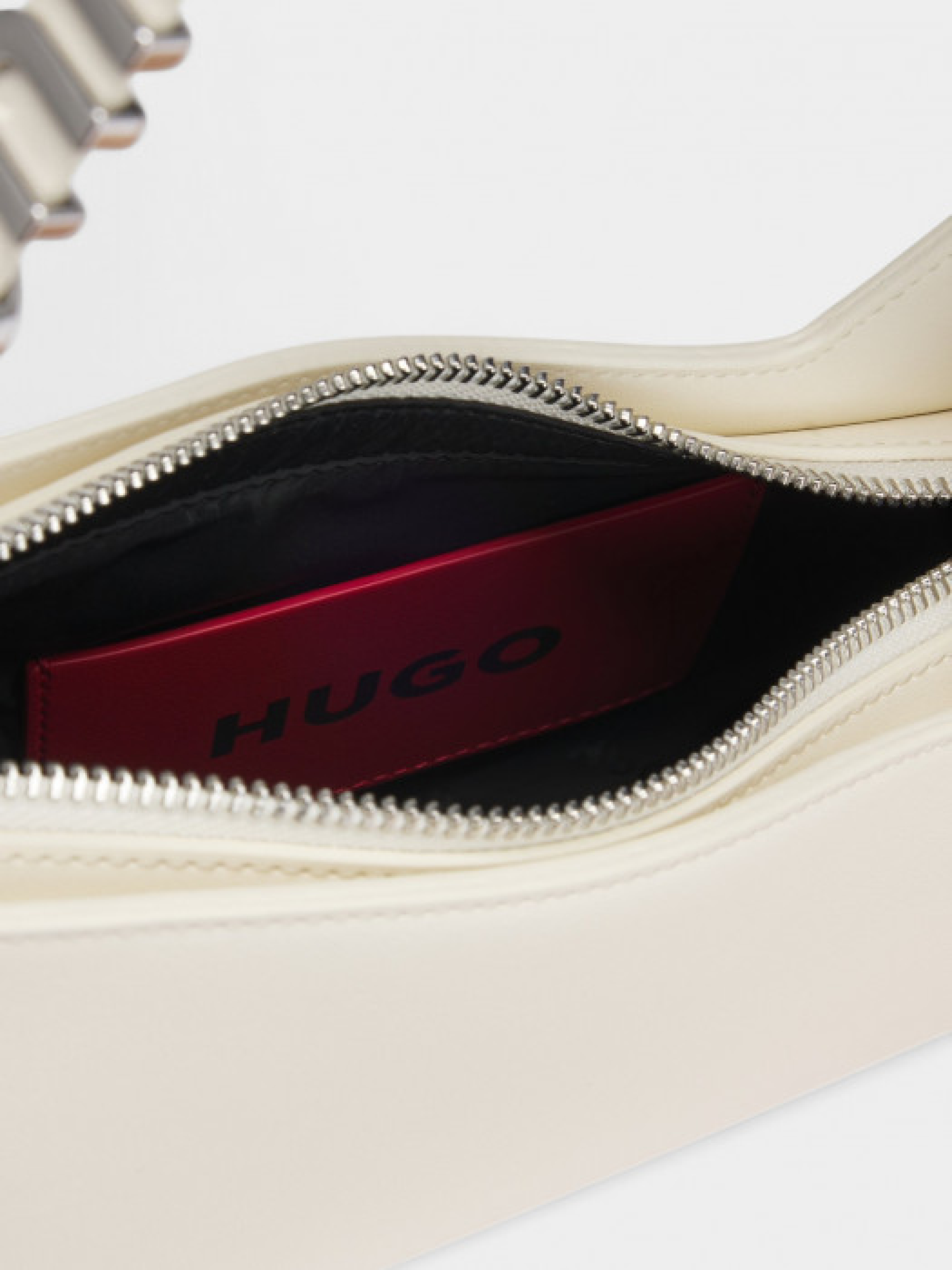 Сумка на плече від HUGO Womenswear з асиметричною формою та ремінцем із фірмовим написом. Виконана з синтетичного покритого матеріалу, що імітує натуральну шкіру та має гладку текстуру. Оснащена блискавкою, внутрішньою відкритою кишенею, металевими літерами та блискучою фурнітурою сріблястого кольору. Розмір: 25х19х6 см.