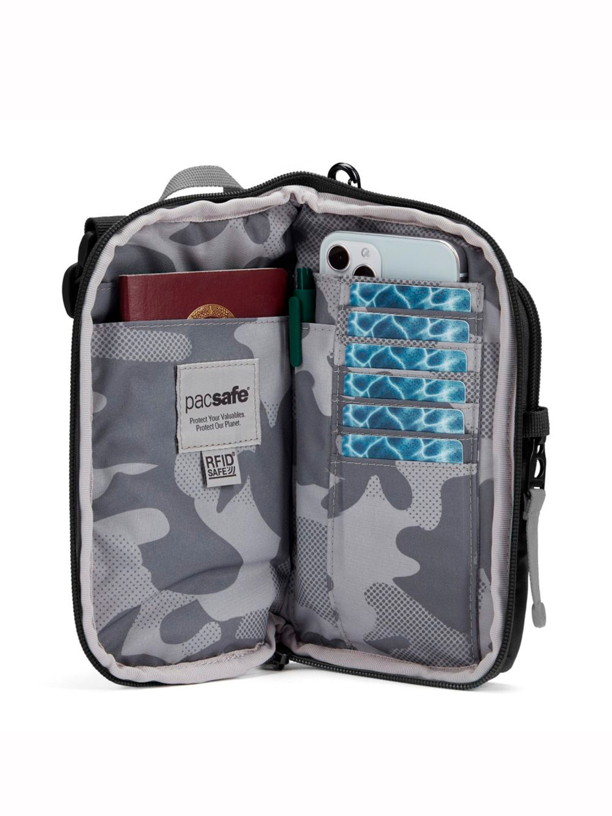 Сумка з захистом антизлодій Pacsafe® GO Tech crossbody – це модель невеликих розмірів, яку можна заховати під курткою чи светром. В кросбоді помістяться телефон, гаманець, ключі, посадковий талон чи квиток. Сумка має два відділення на блискавках. Переднє відділення зі швидким доступом ідеально підходить для телефону. В основному відділенні є кишеня для паспорта з блокуванням RFID для захисту особистих даних, 6 слотів для банківських карт та петля для ручки. Сумка кросбоді обладнана стійким до порізів ремінцем. Довжину плечового ременя можна регулювати. Блискавки мають зручні пулери з текстилю. Об’єм сумки – 0,2 л, розміри – 21,5 х 12 х 3 см, вага – 160 г. Виготовлена з переробленого поліестеру (rPET), модель еквівалентна 4 переробленим пластиковим пляшкам. Верх – водовідштовхувальна оболонкова тканина без ПФУ, підкладка – перероблений поліестер. При виготовленні сумки були використані 4 запатентованих технології, які створюють надійний захист від крадіжок. 1 Тканина, яка не дає просканувати кредитку та інші документи – RFIDsafe ™ blocking pockets & material. 2 Посилений ремінець Carrysafe® slashguard з Dyneema®. 3 Замок на блискавці – Zip clip. 4 Дуга для фіксації язичка блискавки, яка не дає розстебнути рюкзак – Secure zip tab. Розмір: 21,5 х 12 х 3 см Вага: 160 г Об’єм: 0,2 л