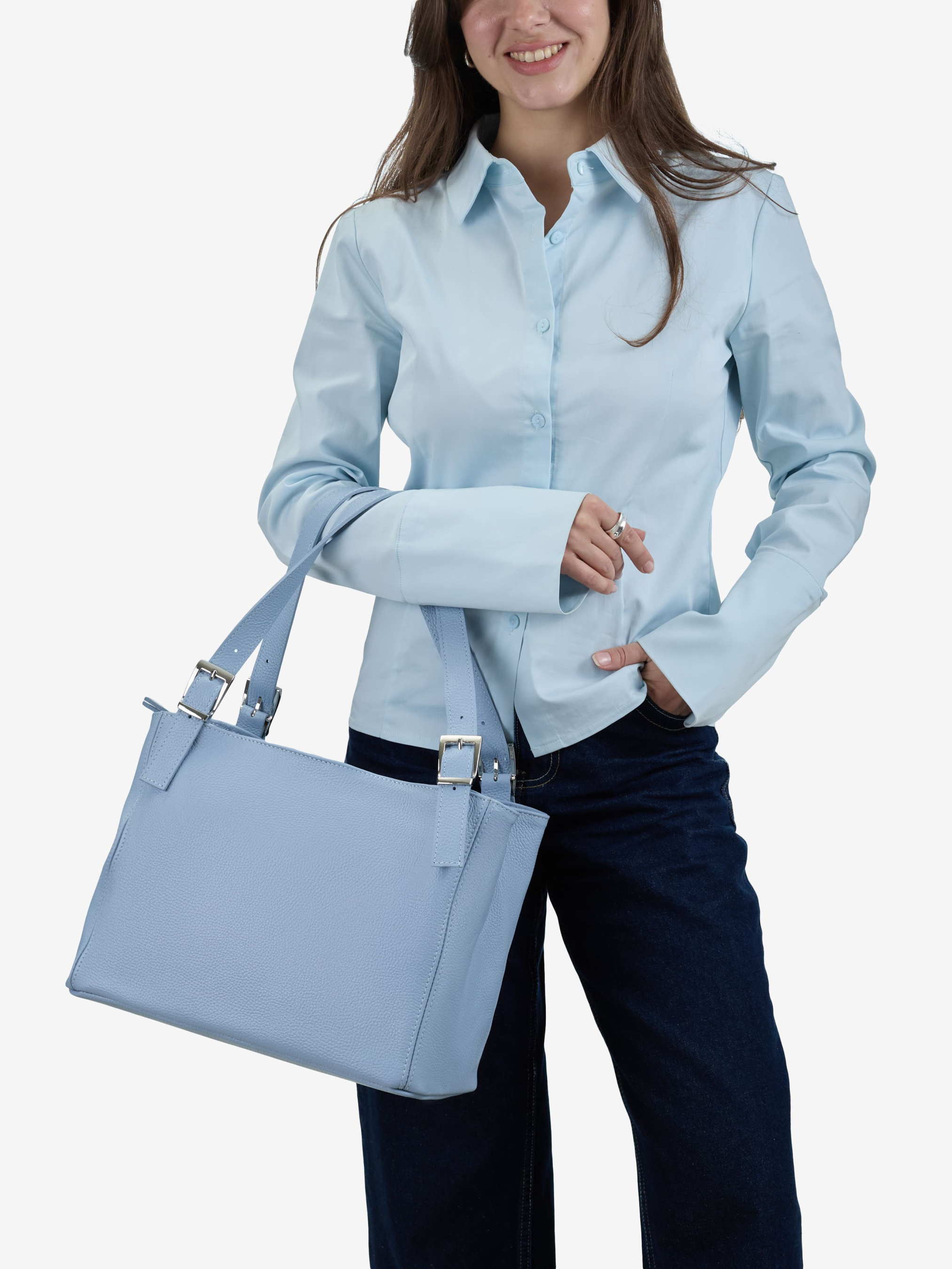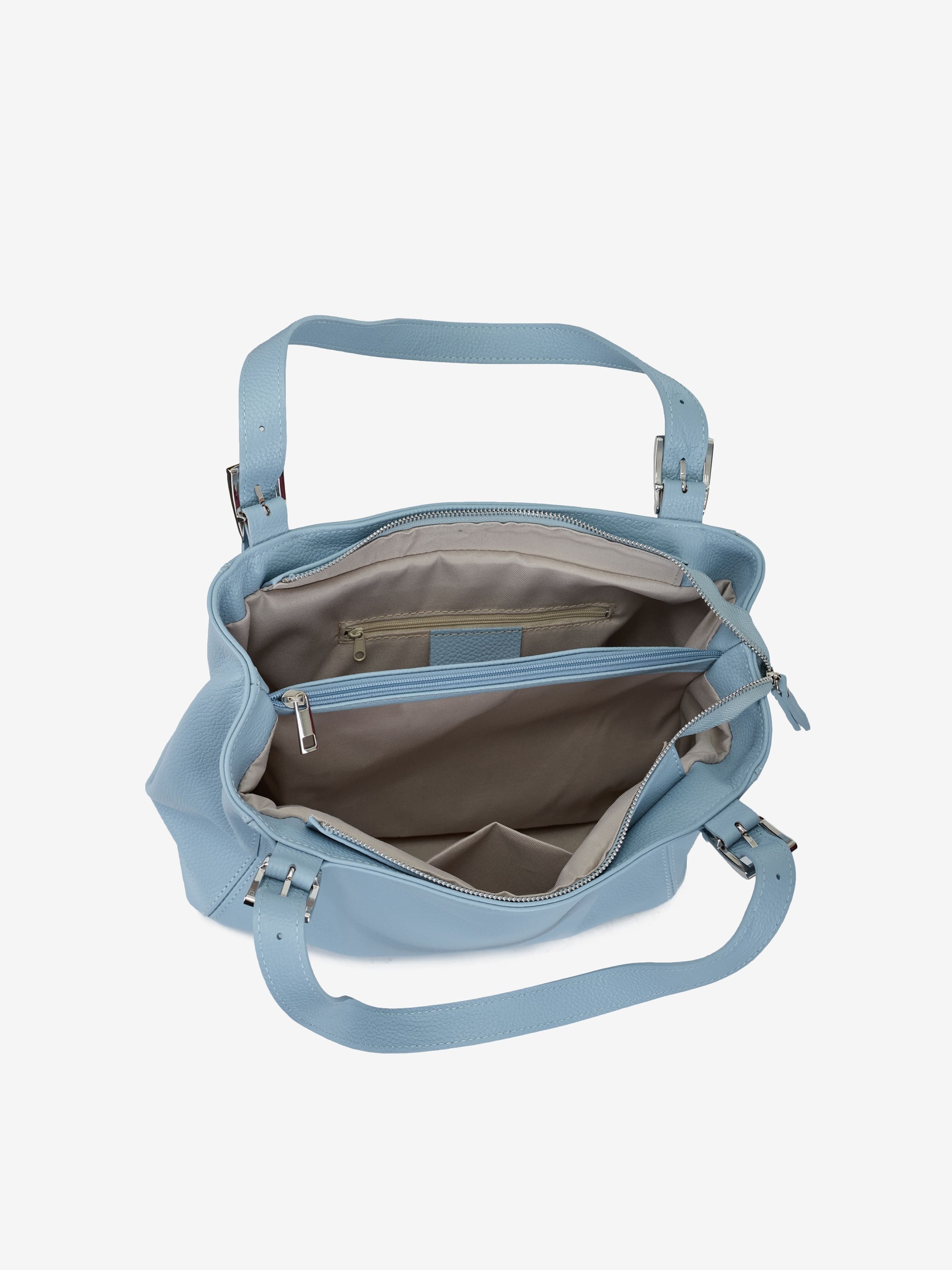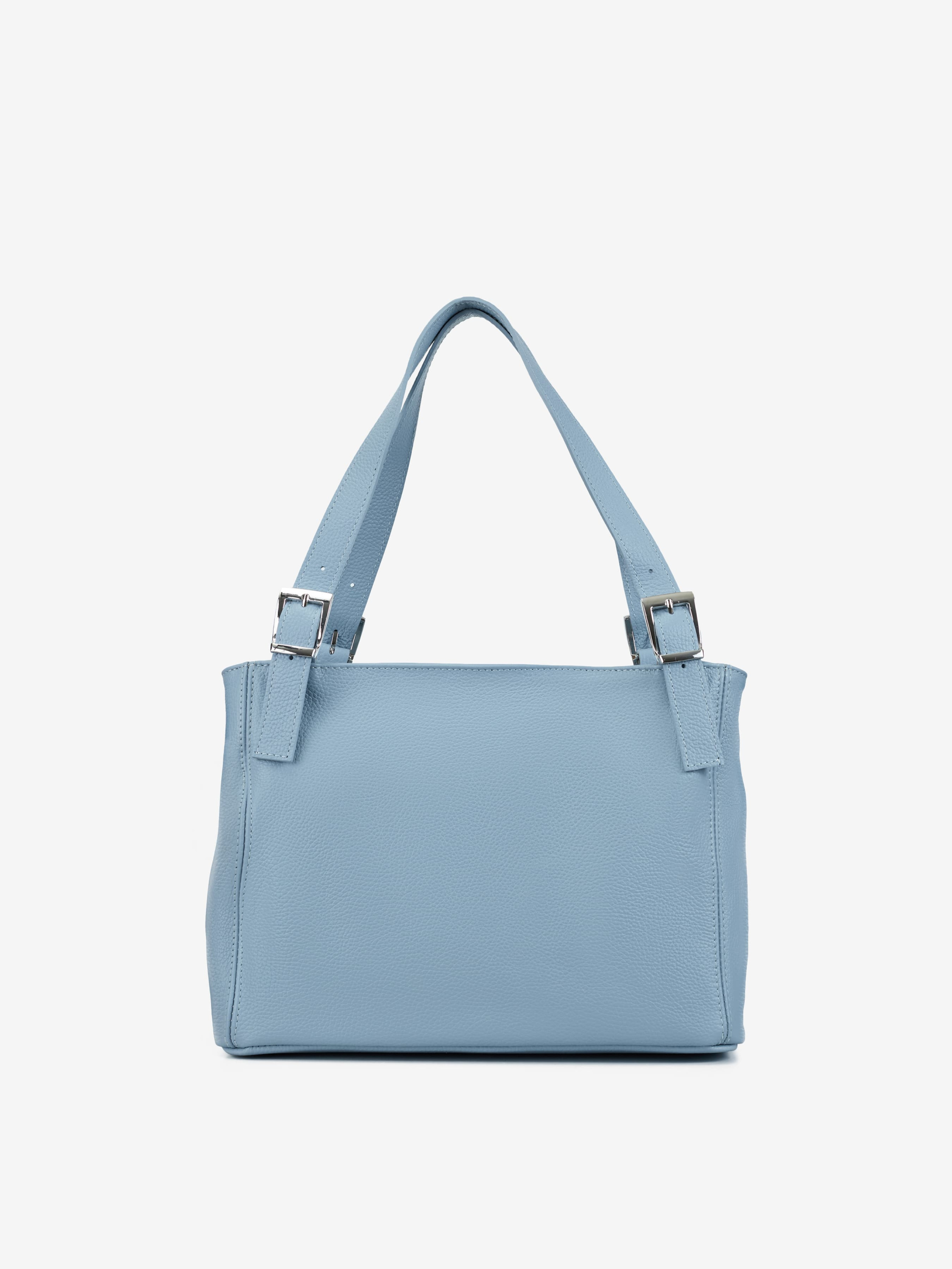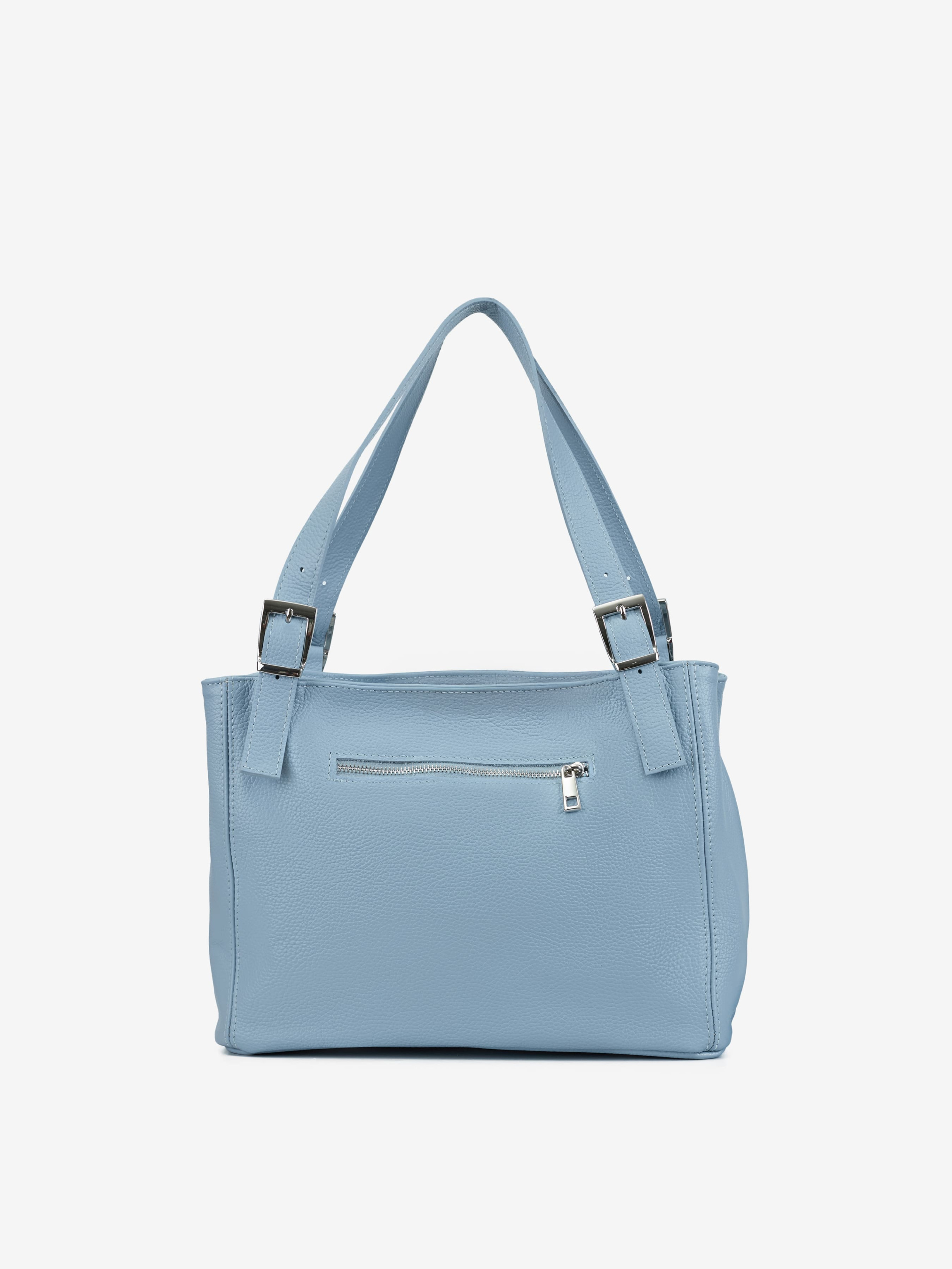 Деталі: Матеріал: 100% натуральна шкіра флотар Фурнітура сріблястого кольору Розміри (Ш x В x Г) - 33 х 25 х 16 см Усередині 2 відділення розділені кишенею на блискавці та 2 кишеньки, одна з них на блискавці Позаду кишеню на блискавці Підкладка: бавовна Застібка: блискавка Висота ручок 25 см