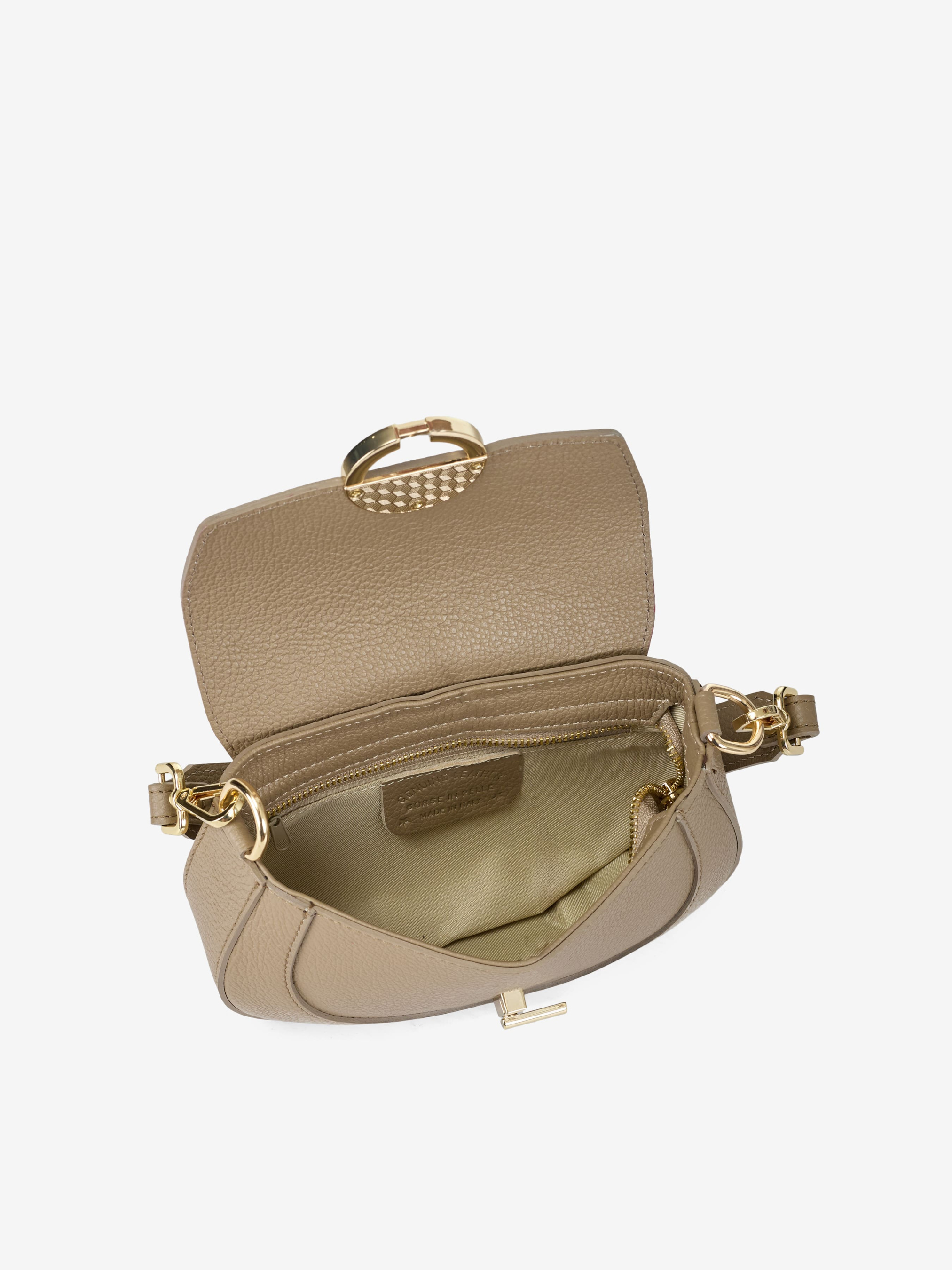 Деталі: Матеріал: 100% натуральна шкіра Шкіра має фактуру флотар Фурнітура золотистого кольору Розміри (Ш x В x Г) – 22 x 15 x 5 см Всередині 1 відділення та кишенька для дрібниць на блискавці Клапан на поворотному замку Підкладка: 100% бавовна Застібка: поворотний замок Ручка на карабінах, знімна, довжина 35 см Ремінець шкіряний, регулюється, знімний, на карабінах, максимальна довжина 145 см