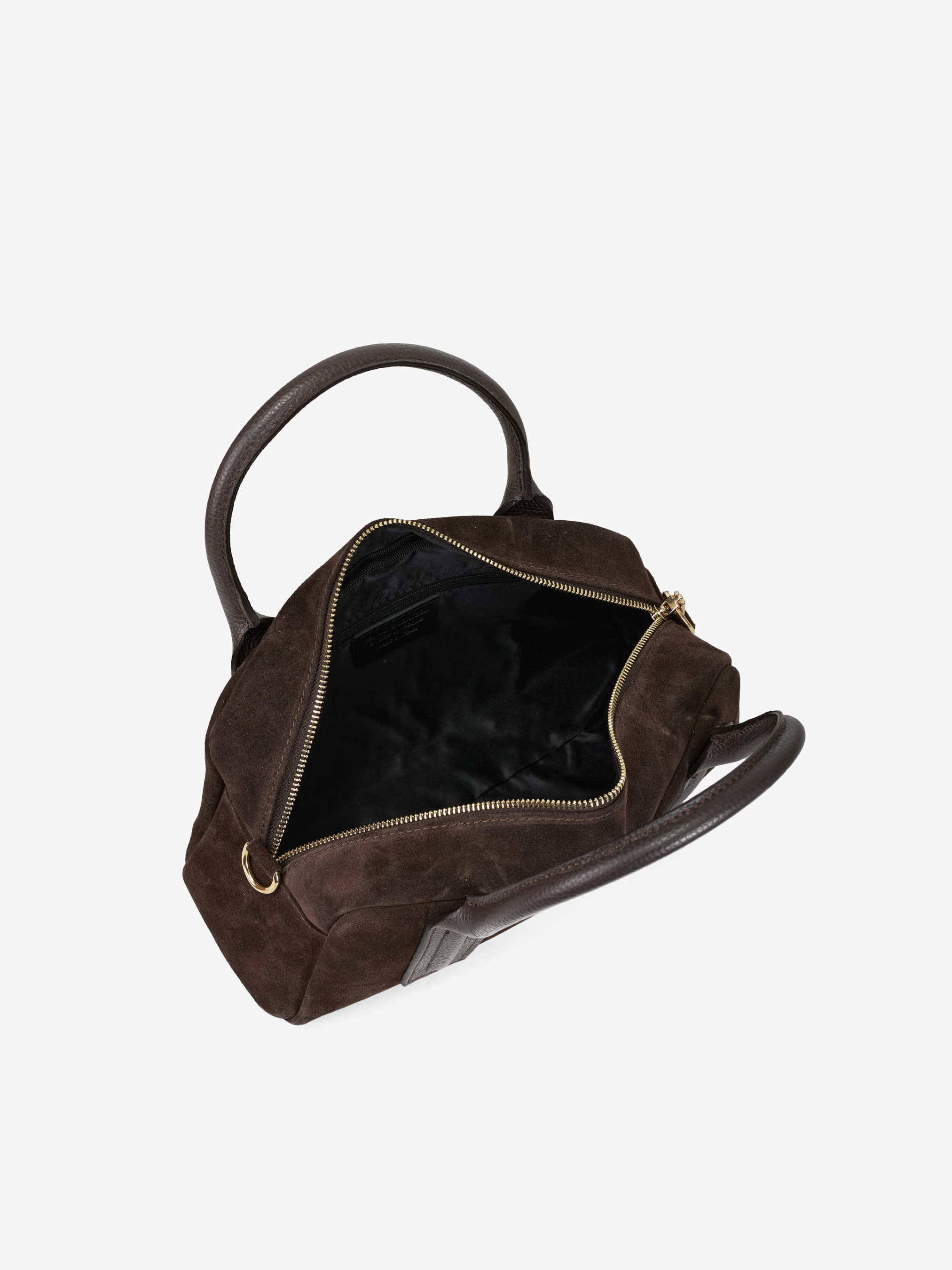 Деталі: Матеріал: 100% натуральна замша, натуральна шкіра флотар Фурнітура золотистого кольору Розміри (Ш x В x Г) – 29 x 17 x 8 см Усередині 1 відділення та 1 кишенька на блискавці Підкладка: бавовна Застібка: блискавка Висота ручок 12 см Ремінець шкіряний, знімний, регулюється, максимальна довжина 120 см
