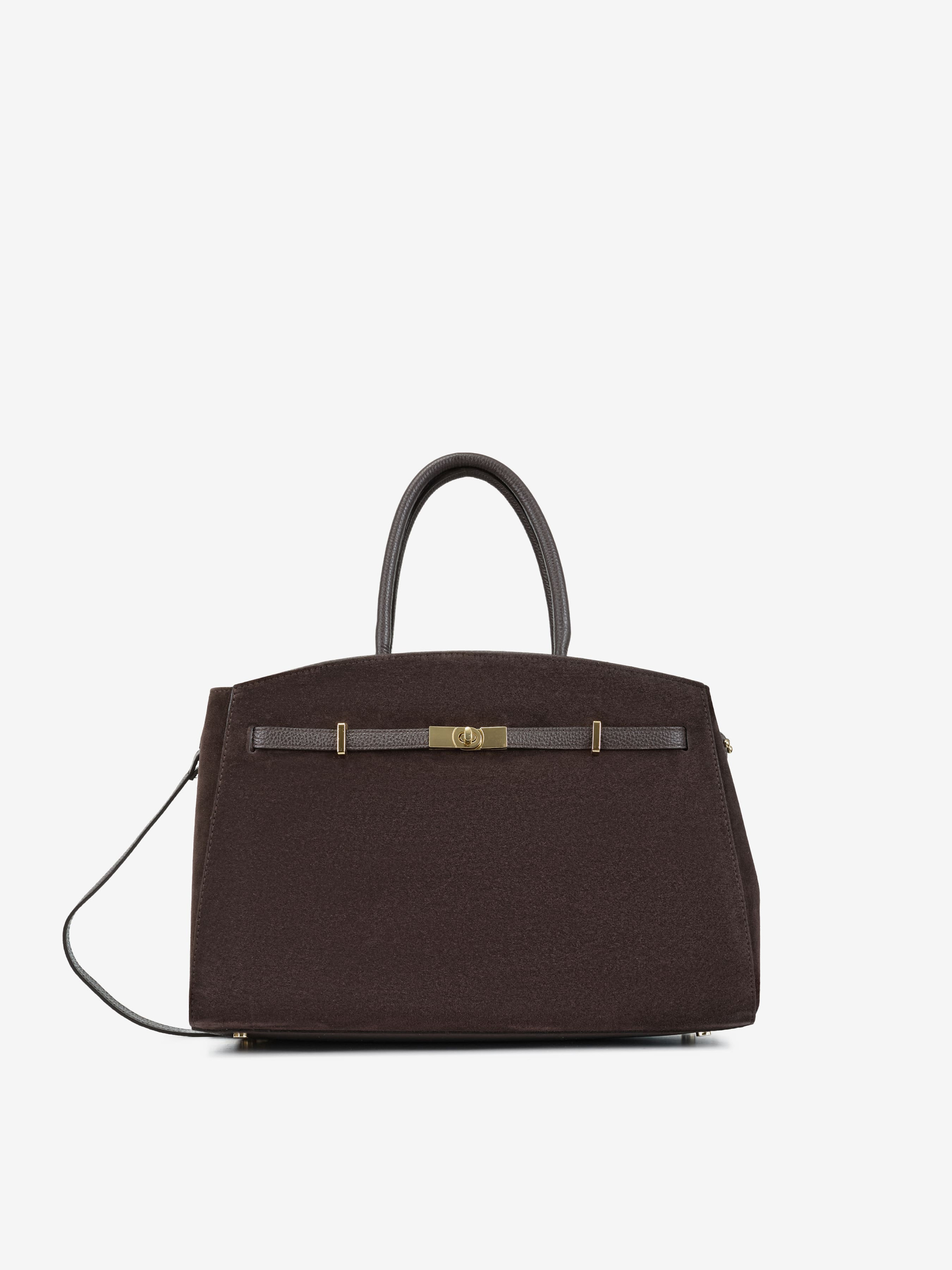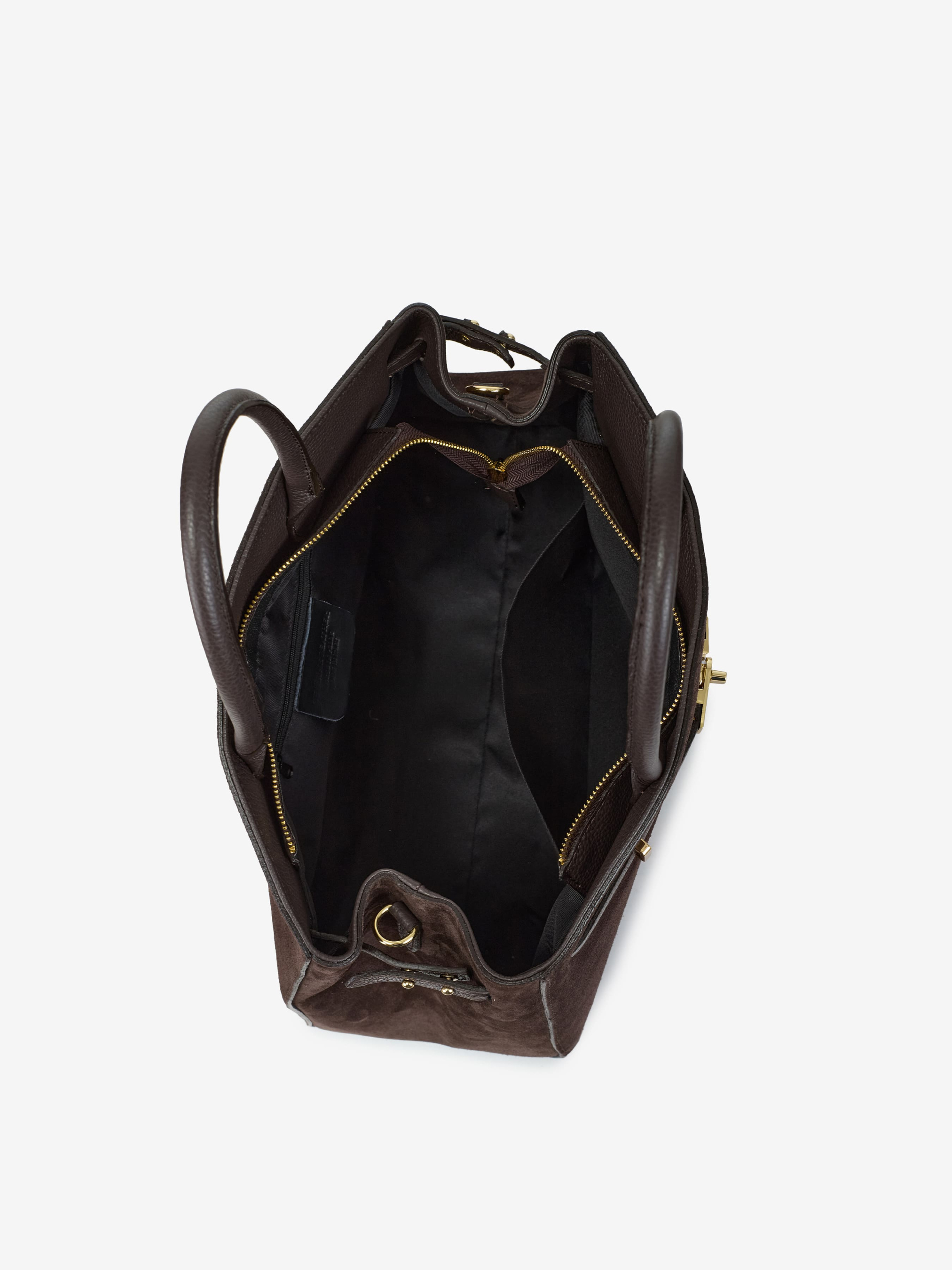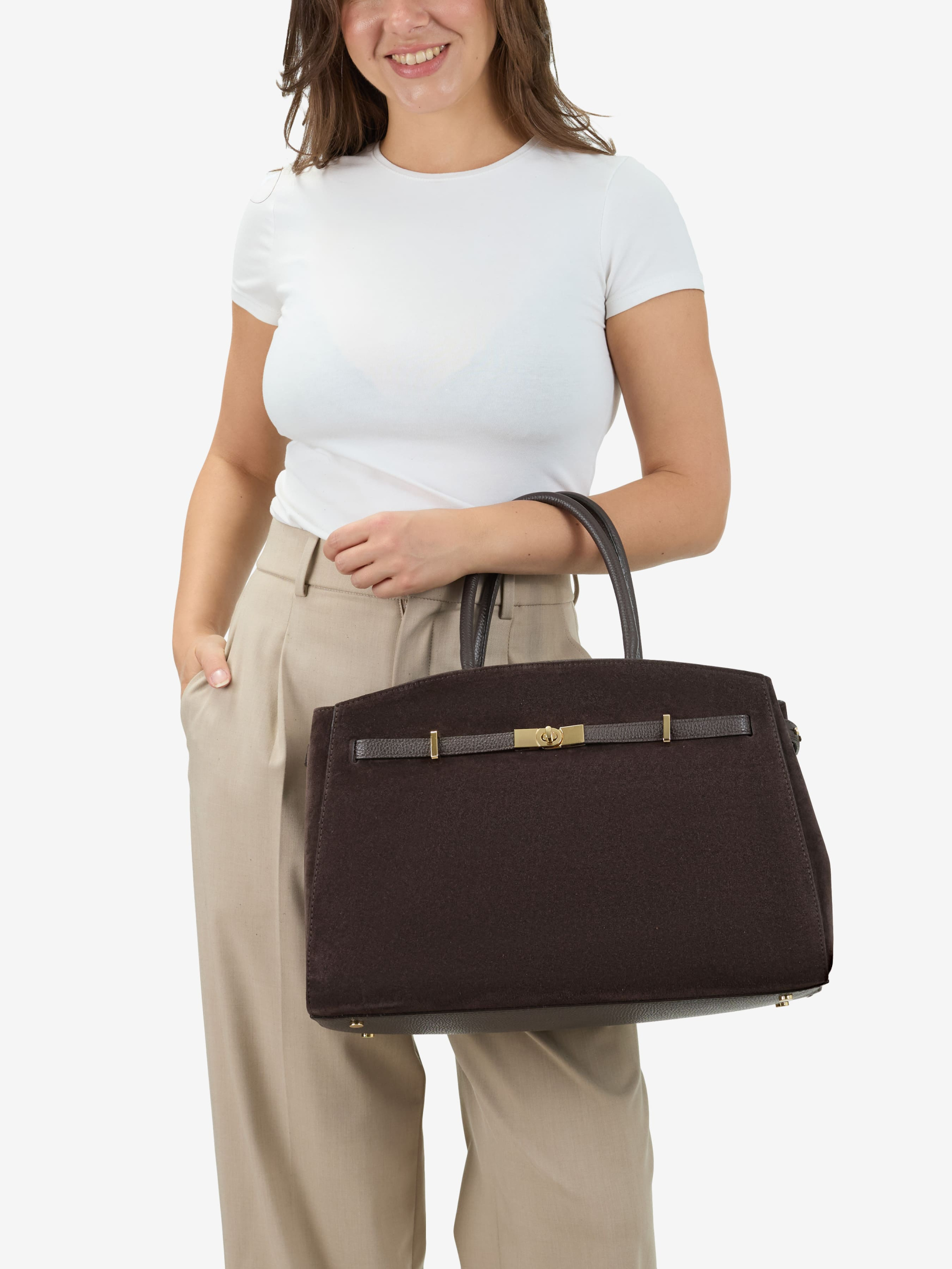 Деталі: Матеріал: 100% натуральна шкіра флотар, натуральна замша Фурнітура золотистого кольору Розміри (Ш x В x Г) – 38 x 26 x 14 см Усередині 1 відділення, 1 кишенька на блискавці для дрібниць Підкладка: Текстиль Застібка: блискавка Висота ручок: 14 см Ремінець шкіряний, знімний, регулюється, довжина 115 см