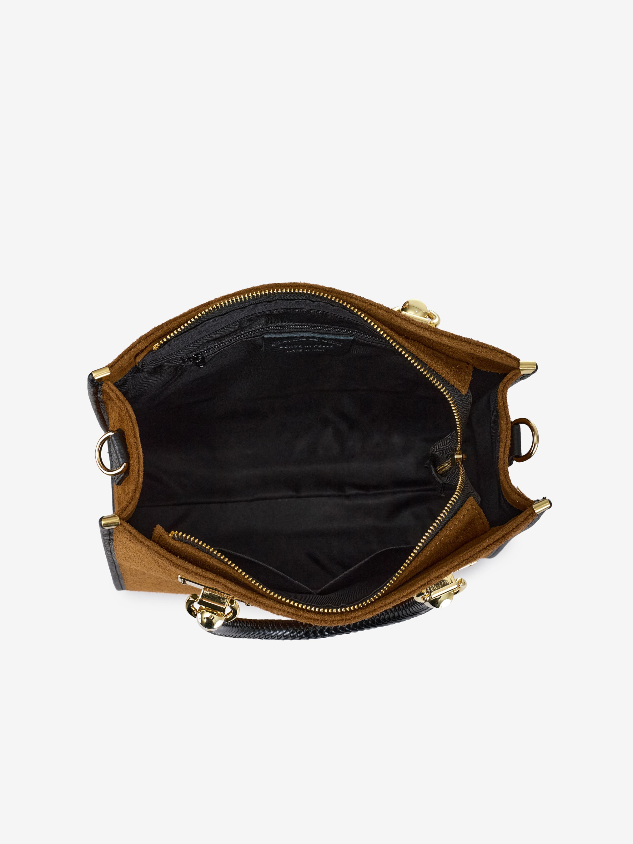 Деталі: Матеріал: 100% натуральна замша, 100% натуральна шкіра флотар Фурнітура золотистого кольору Розміри (Ш x В x Г) - 30 х 27 х 12 см Усередині 1 відділення, 1 кишенька для дрібниць на блискавці, 2 кишеньки без блискавки Підкладка: бавовна Застібка: блискавка Ремінець шкіряний, знімний, регулюється, максимальна довжина 110 см Висота ручки 13 см