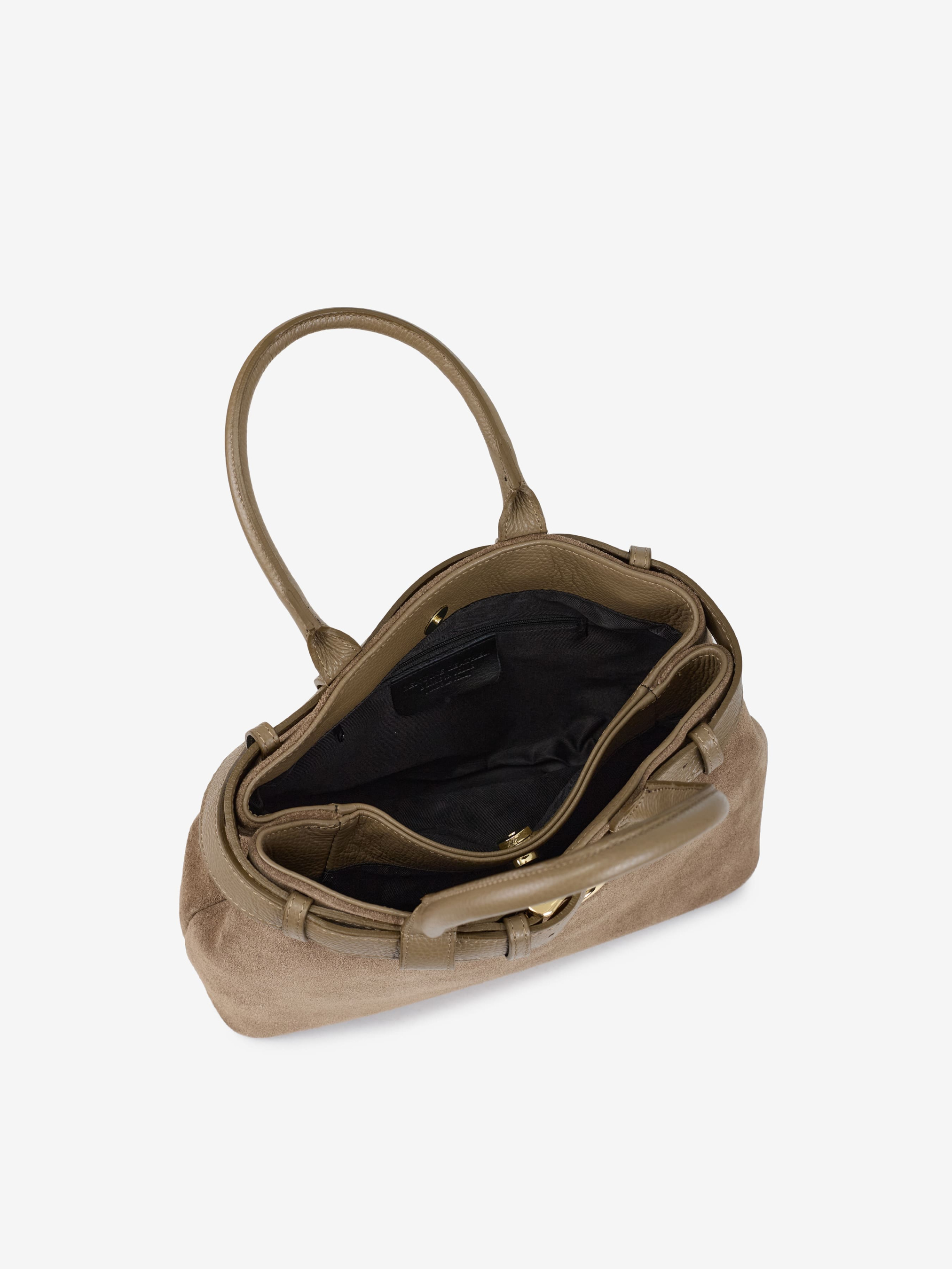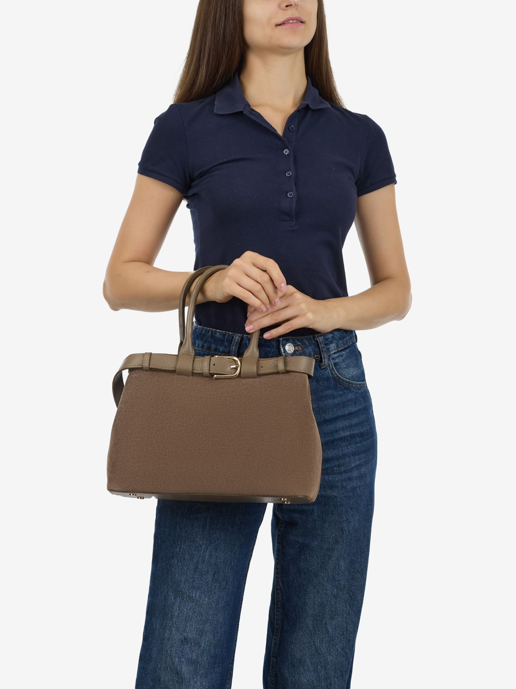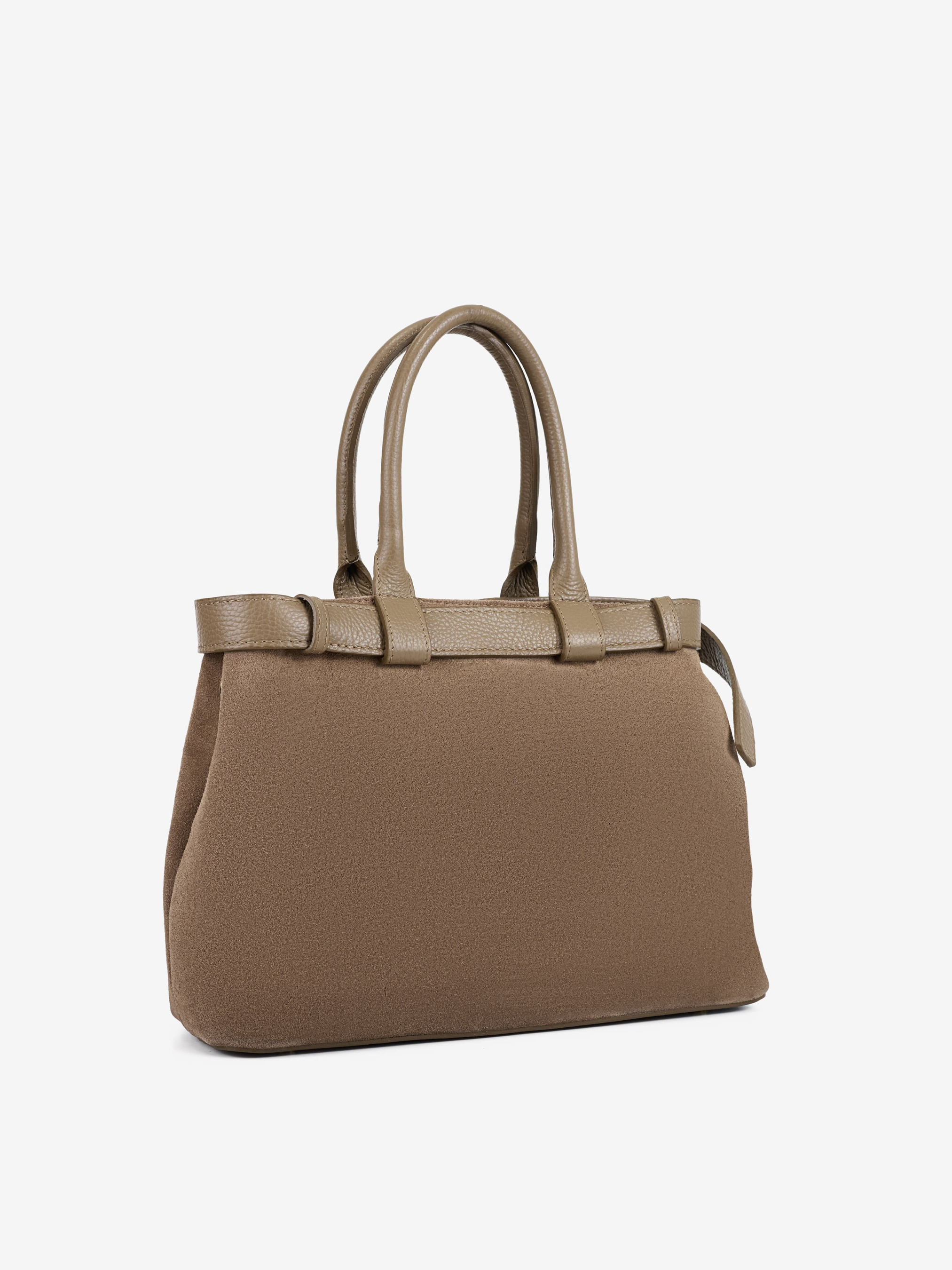 Деталі: Матеріал: 100% натуральна замша, натуральна шкіра флотар Фурнітура золотистого кольору Розміри (Ш x В x Г) – 32х23х11 см Усередині 2 відділення, 1 кишенька на блискавці для дрібниць Підкладка: бавовна Застібка: магніт Ремінець шкіряний, знімний, регулюється, максимальна довжина 125 см Висота ручки 15 см