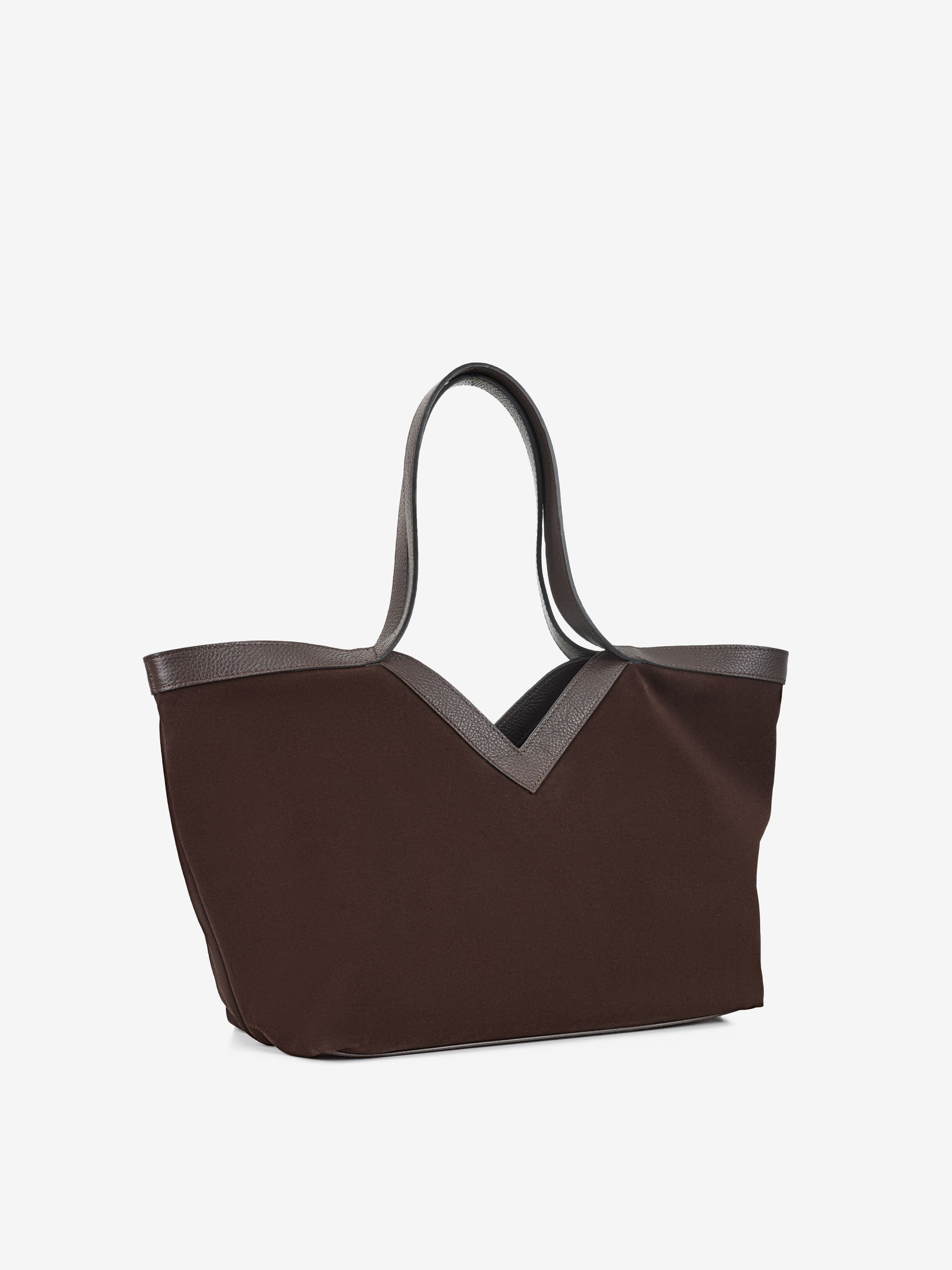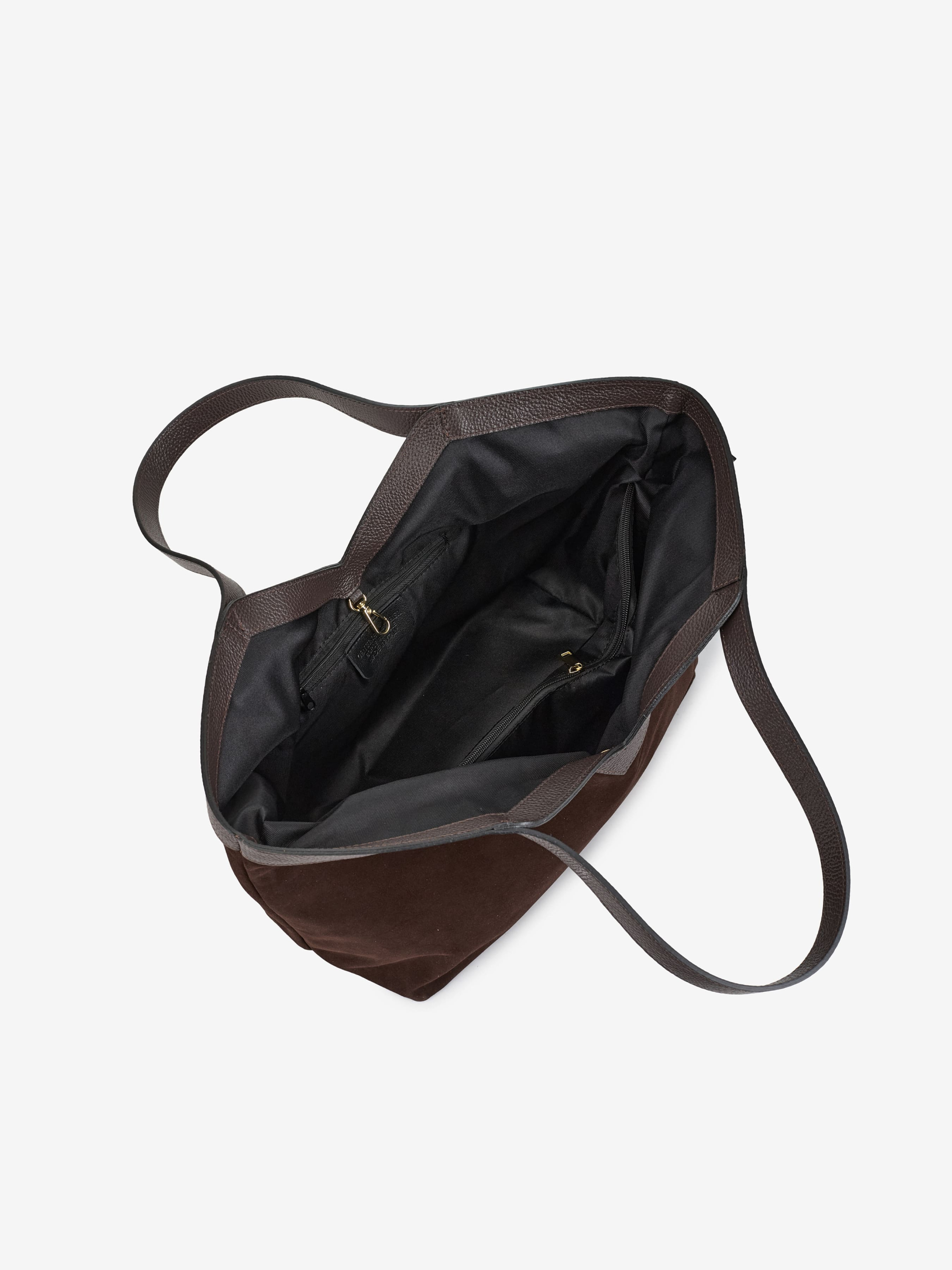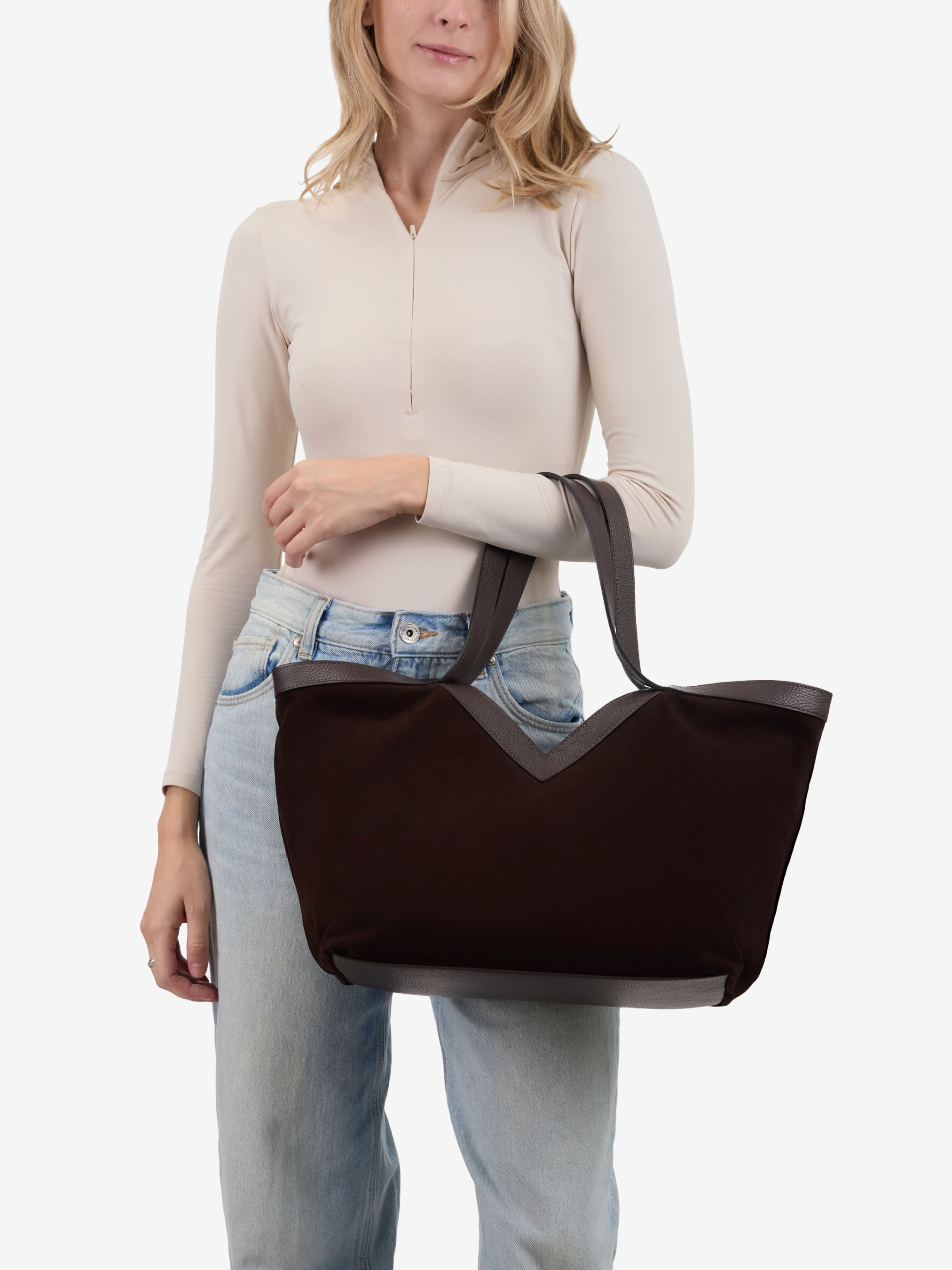 Деталі: Матеріал: 100% натуральна шкіра флотар, натуральна замша Фурнітура сріблястого кольору Розміри (Ш x В x Г) – 33 x 28 x 16 см Усередині 2 відділення, розділені кишенею на блискавці та кишеньку для дрібниць на блискавці Підкладка: бавовна Застібка: карабін Висота ручок 25 см