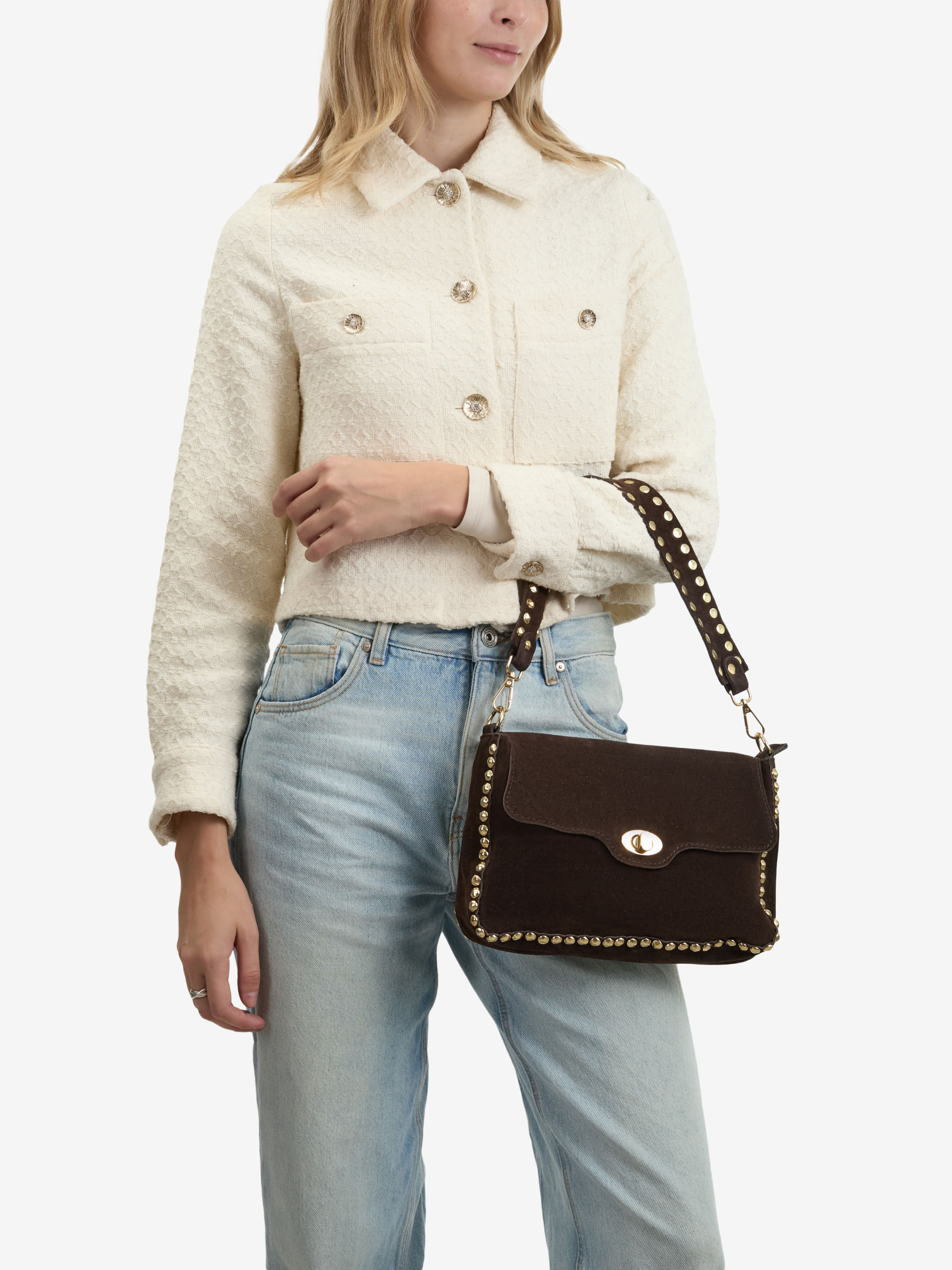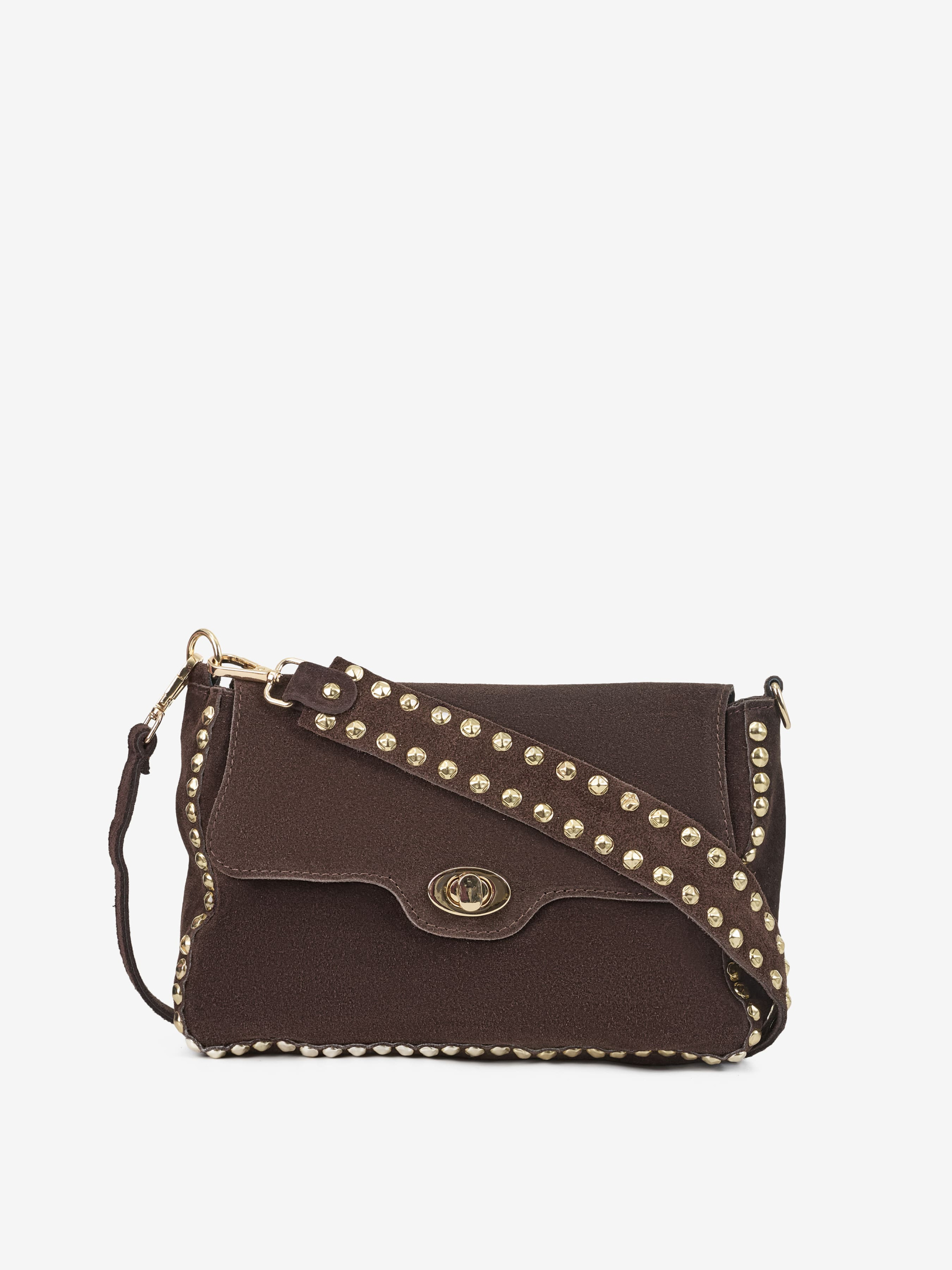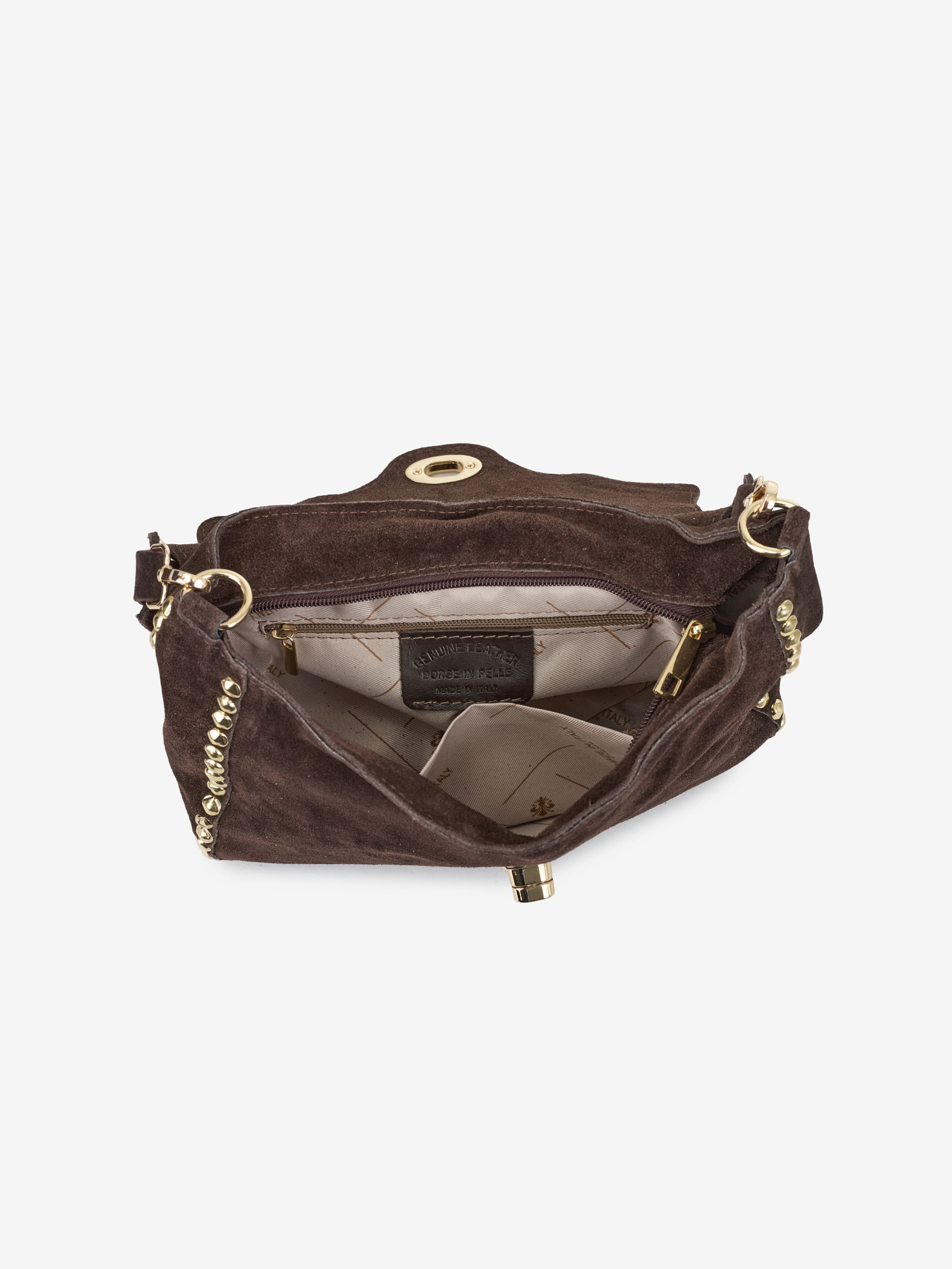 Деталі: Матеріал: 100% натуральна замша Фурнітура золотистого кольору Розміри (Ш x В x Г) – 28 x 20 x 5 см Усередині 1 відділення та 2 кишеньки для дрібниць, одна з них на блискавці Підкладка: бавовна Застібка: блискавка, клапан на поворотному замку Висота ручок 25 см Ремінець замшевий знімний, регулюється, максимальна довжина 110 см