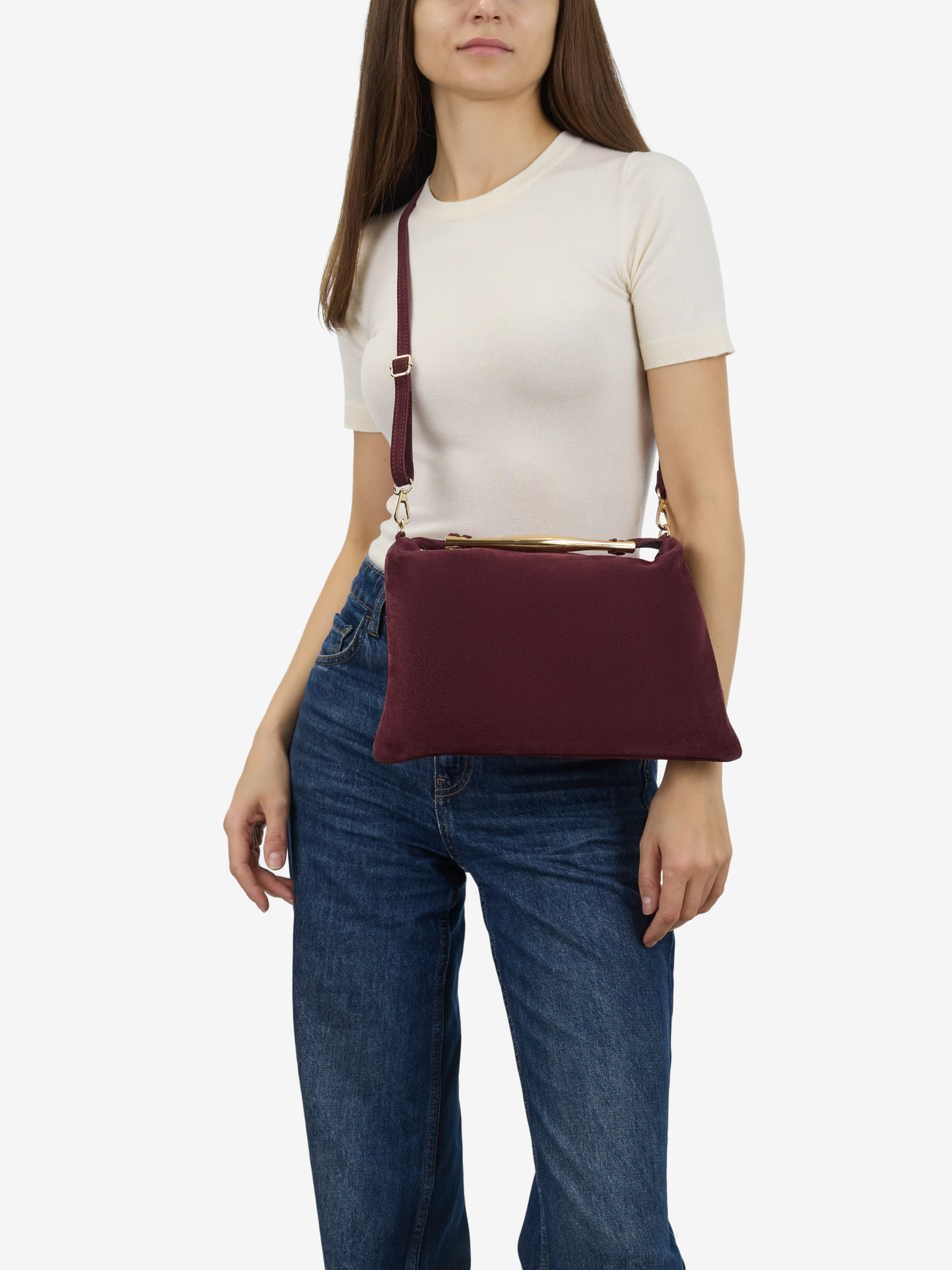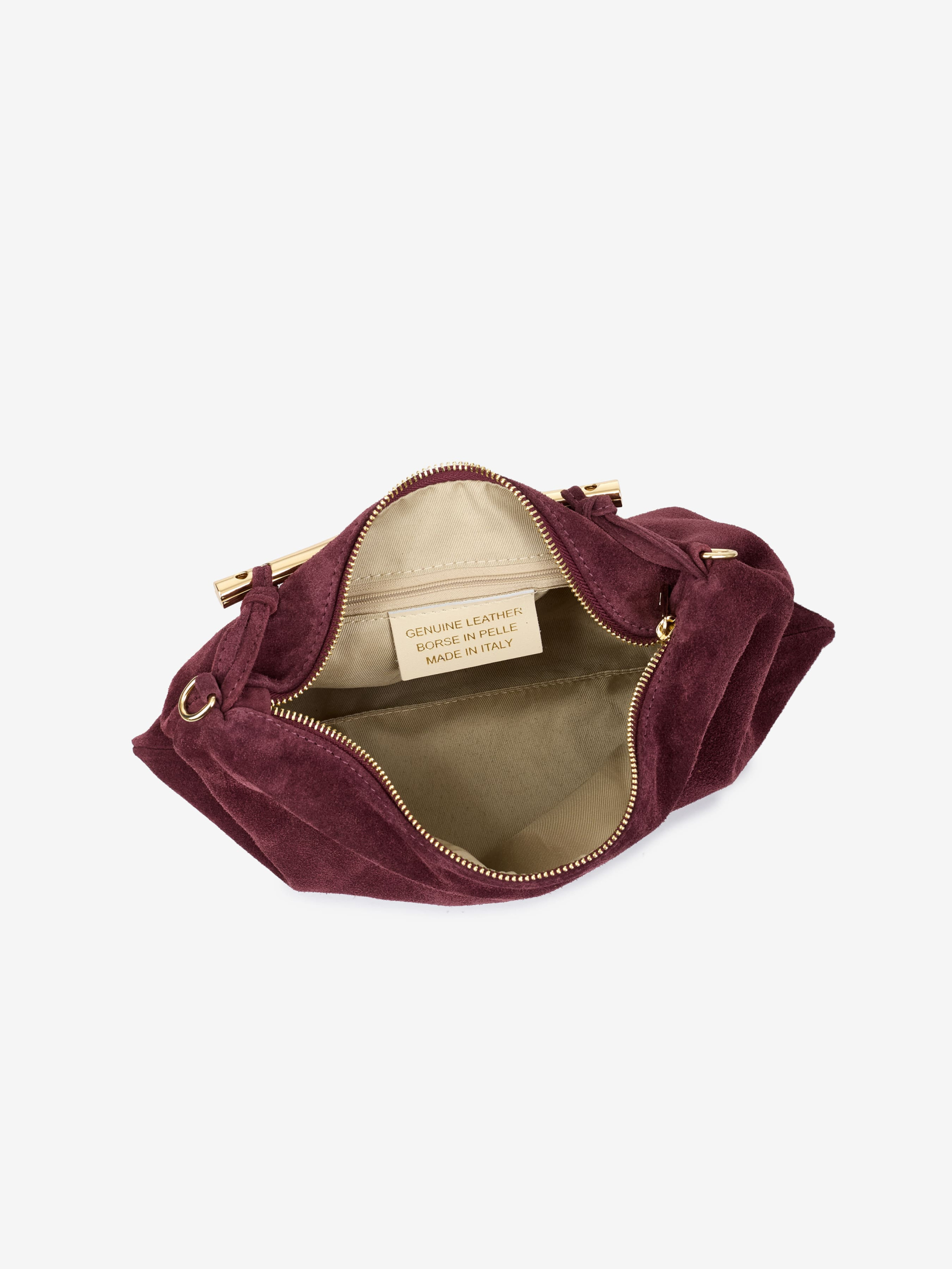 Деталі: Матеріал: 100% натуральна замша Фурнітура золотистого кольору Розміри (Ш x В x Г) – 32 x 23 x 2 см Усередині 1 відділення та 1 кишенька на блискавці Підкладка: бавовна Застібка: блискавка Висота ручки 8 см Ремінець замшевий, знімний, регулюється, максимальна довжина 95 см