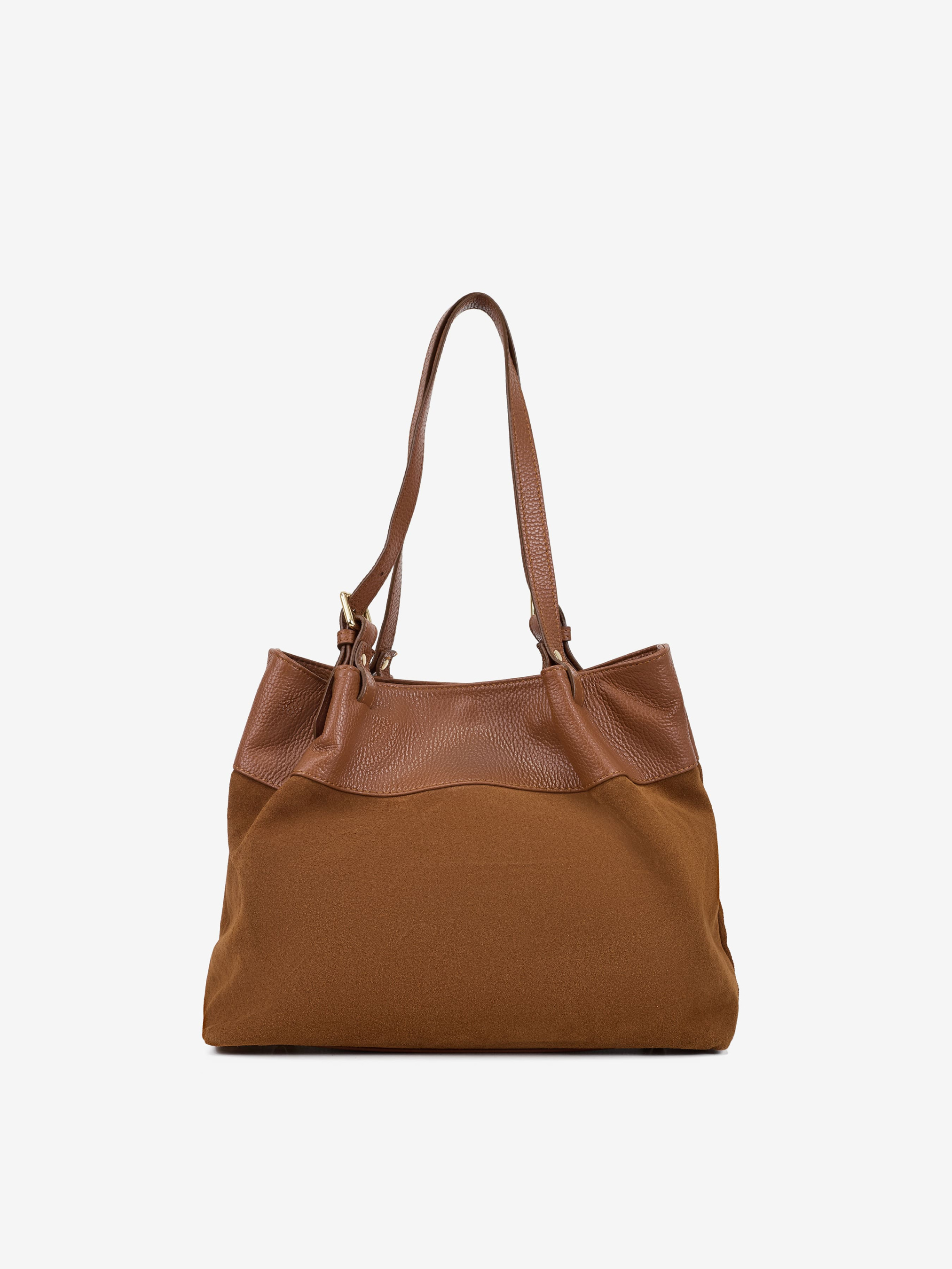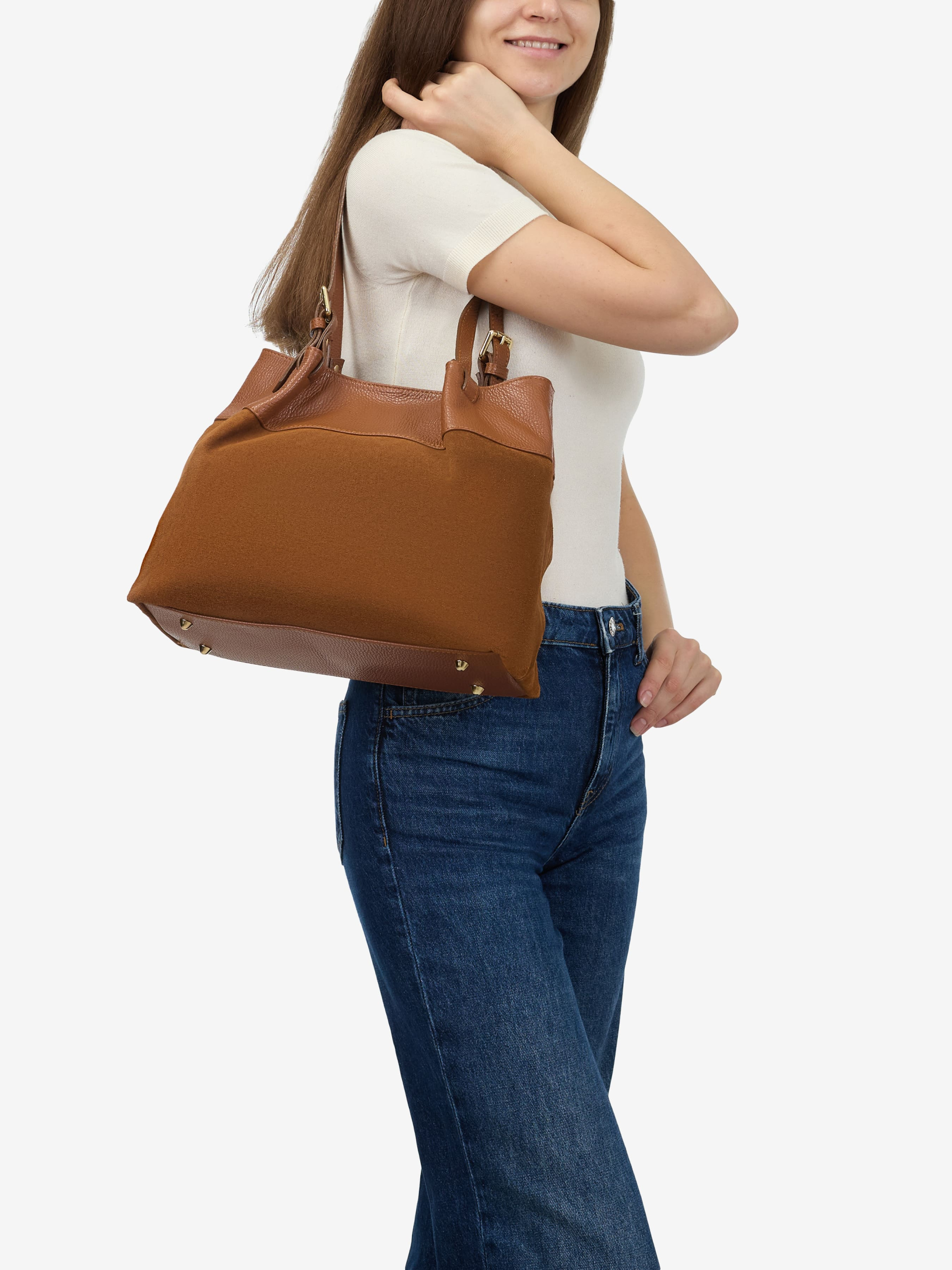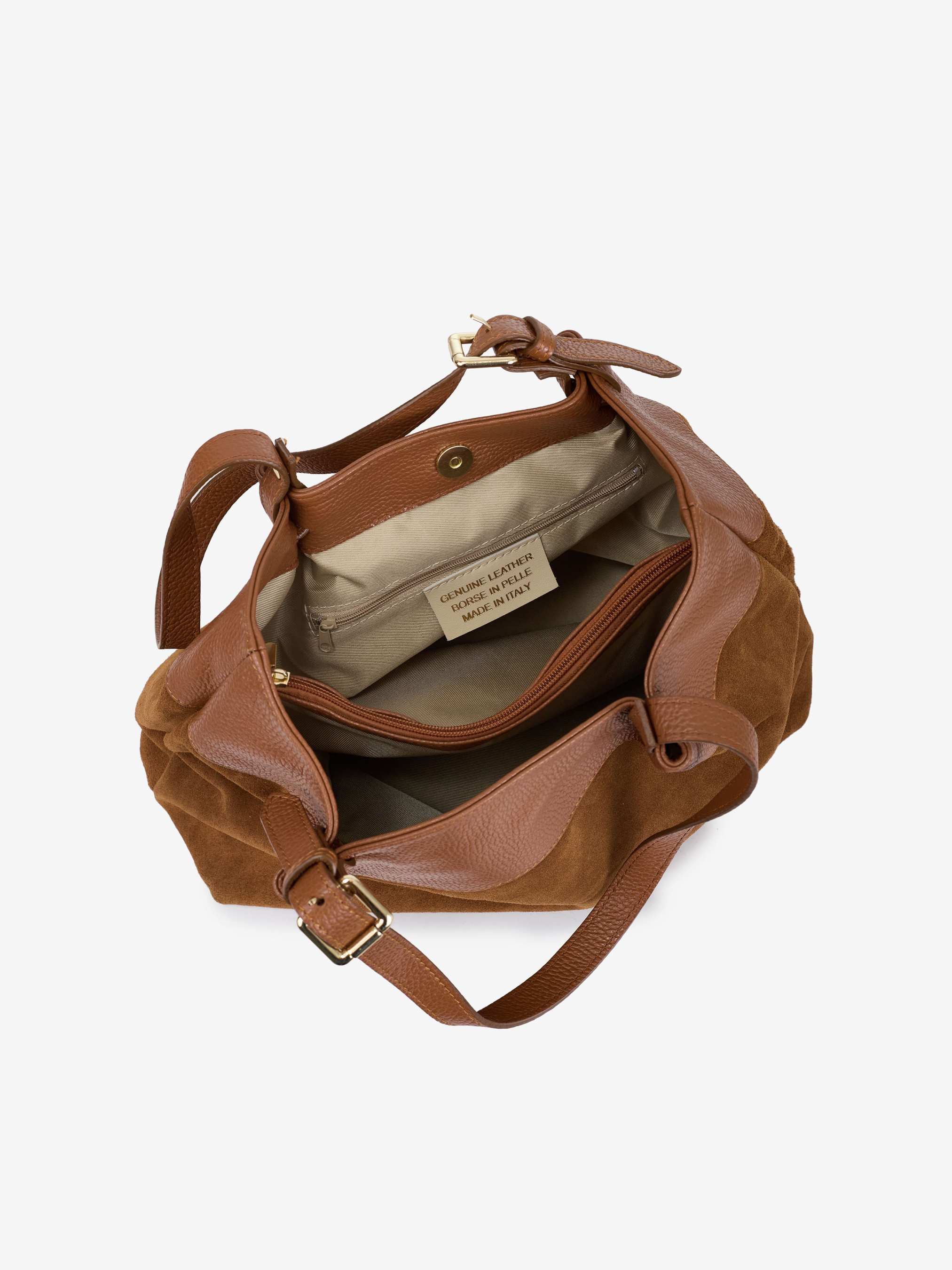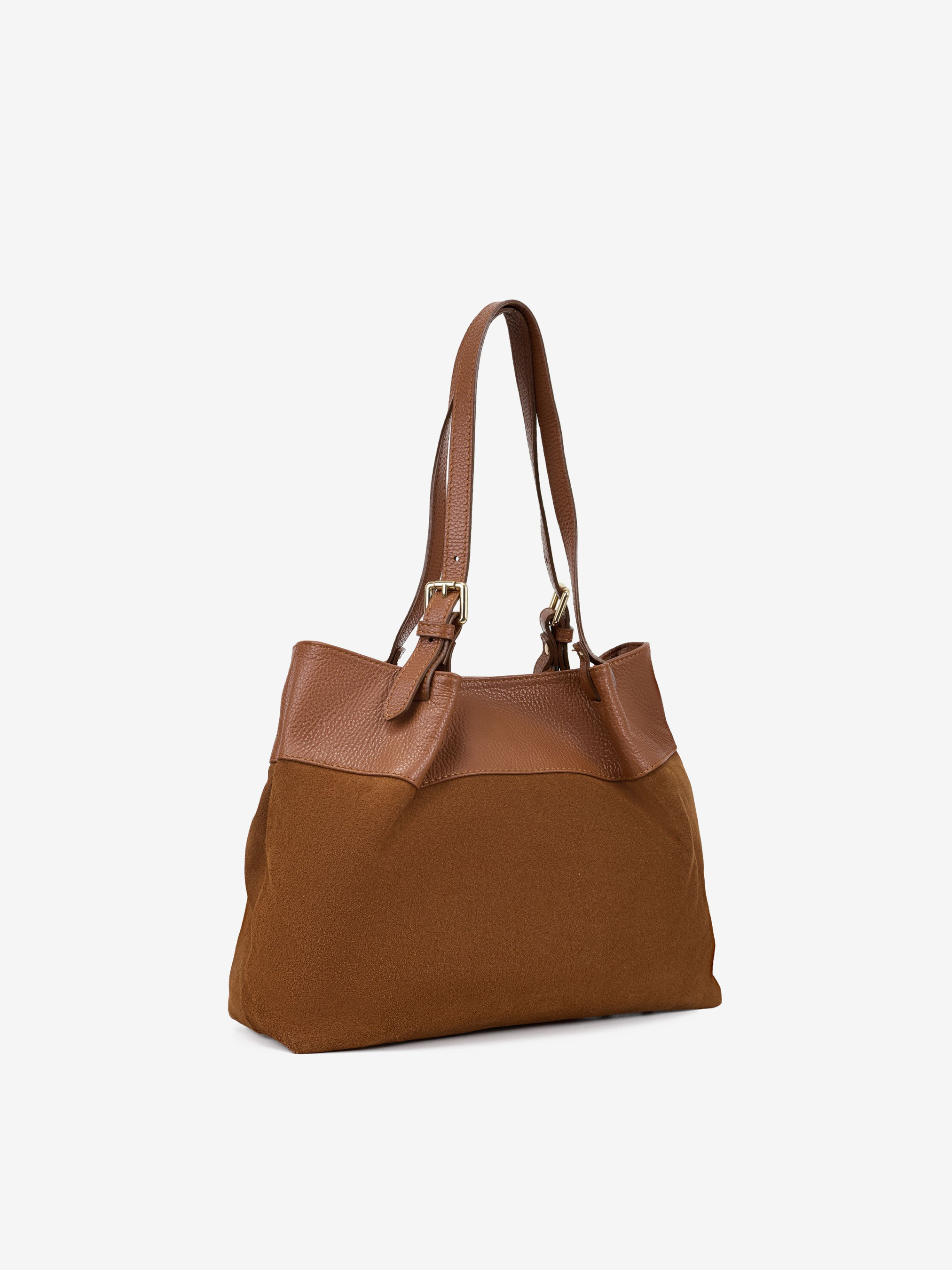 Деталі: Матеріал: 100% натуральна замша, натуральна шкіра флотар Фурнітура золотистого кольору Розміри (Ш x В x Г) – 30 x 27 x 11 см Усередині 2 відділення, розділені кишенею на блискавці, всередині 3 кишеньки для дрібниць, одна на блискавці Підкладка: бавовна Застібка: магніт Ремінець шкіряний, знімний, регулюється, максимальна довжина 120 см Висота ручок 18 см