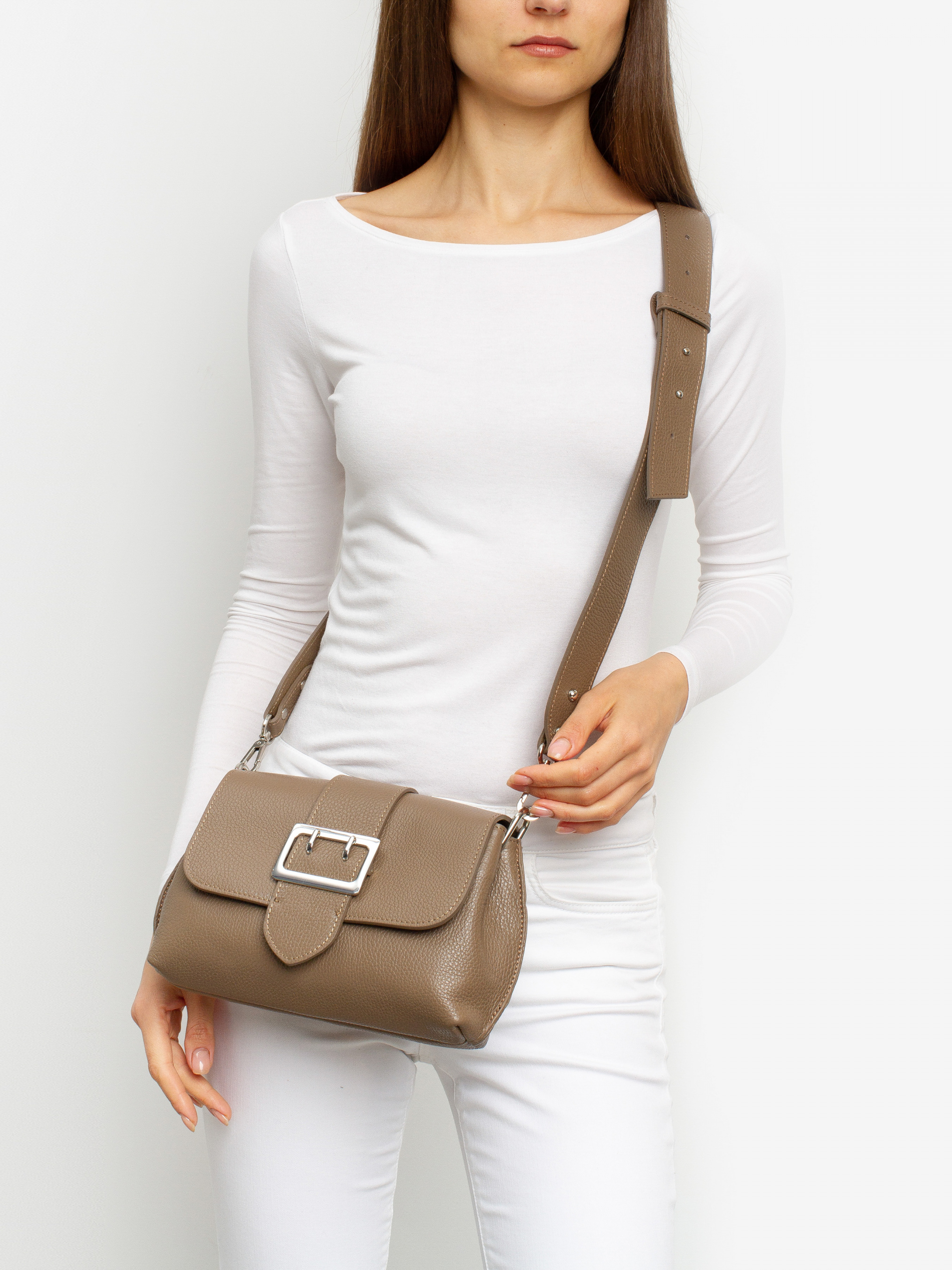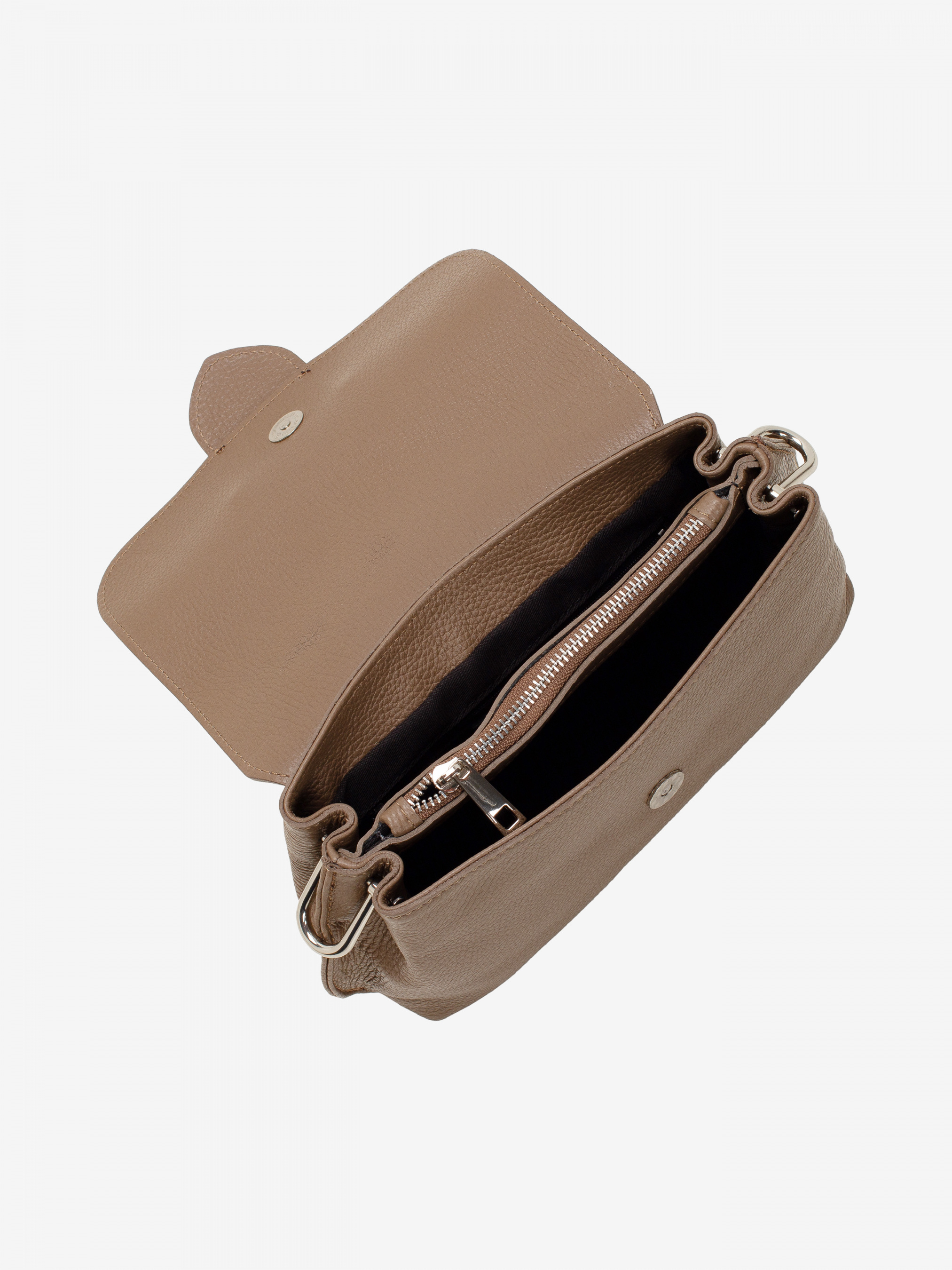 Деталі: - Матеріал: 100% натуральна шкіра - Шкіра має фактуру флотар - Фурнітура сріблястого кольору - розміри (Ш x В x Г) - 22 x 14 x 7 см - Усередині 2 відділення розділені кишенею на блискавці та 1 кишенька для дрібниць на блискавці - Підкладка: 100% бавовна - Застібка: блискавка, клапан на магніті - У комплекті ремінець для носіння на плечі