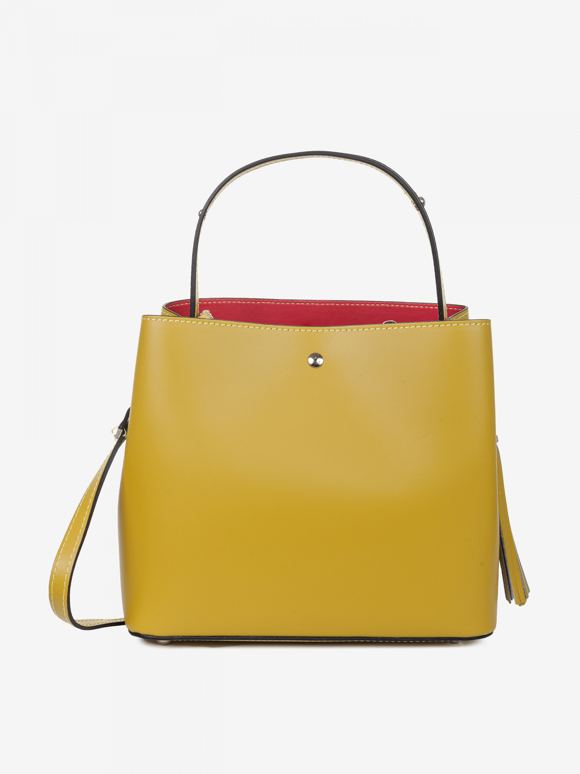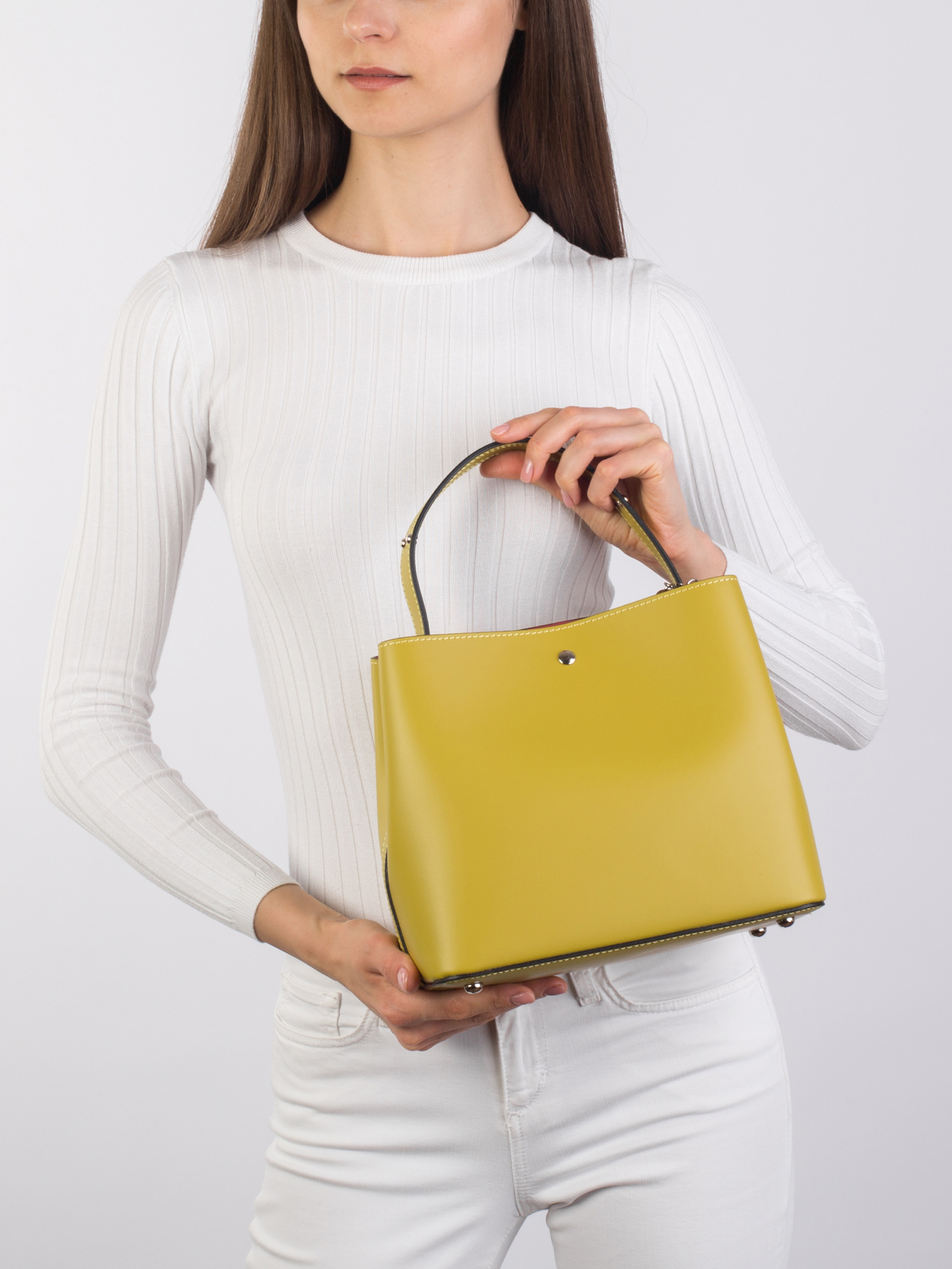 Деталі: - Матеріал: 100% натуральна шкіра - Шкіра має гладку фактуру - Фурнітура сріблястого кольору - Розміри (Ш x В x Г) – 25 x 22 x 14 см - Усередині 1 відділення, посередині відділення-косметичка на блискавці закріплена з боків сумки на заклепках, також пристібається до сумки кнопками спереду та ззаду - Сумка без підкладки - Висота ручок 16 см - У комплекті ремінець для носіння на плечі знімний на карабінах регулюється, максимальна довжина 110 см. - Застібка: блискавка, кнопки