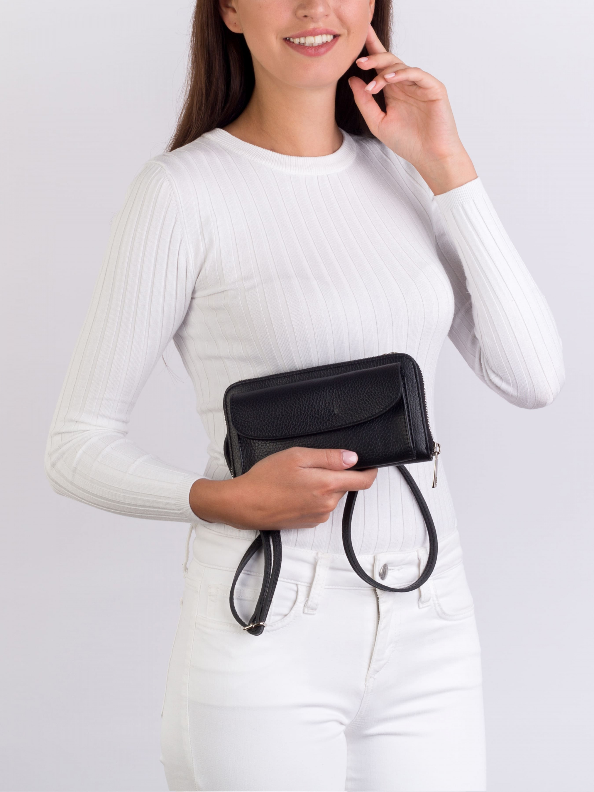Деталі: Матеріал: 100% натуральна шкіра Шкіра має фактуру флотар Фурнітура сріблястого кольору Розміри (Ш x В x Г) - 20 х 10 х 6 см Усередині 3 відділення, посередині кишенька на блискавці, з боків відділення для карт та візиток, спереду кишенька на кнопці Без підкладки Застібка: блискавка У комплекті ремінець для носіння на плечі (знімний на карабінах регулюється, максимальна довжина 120 см)