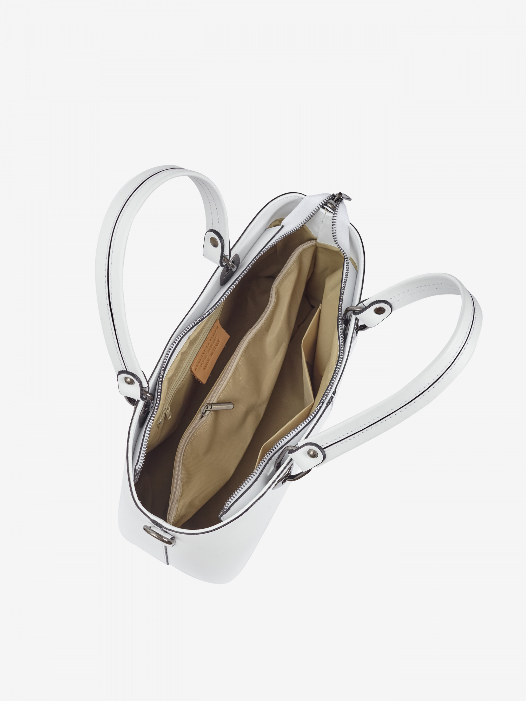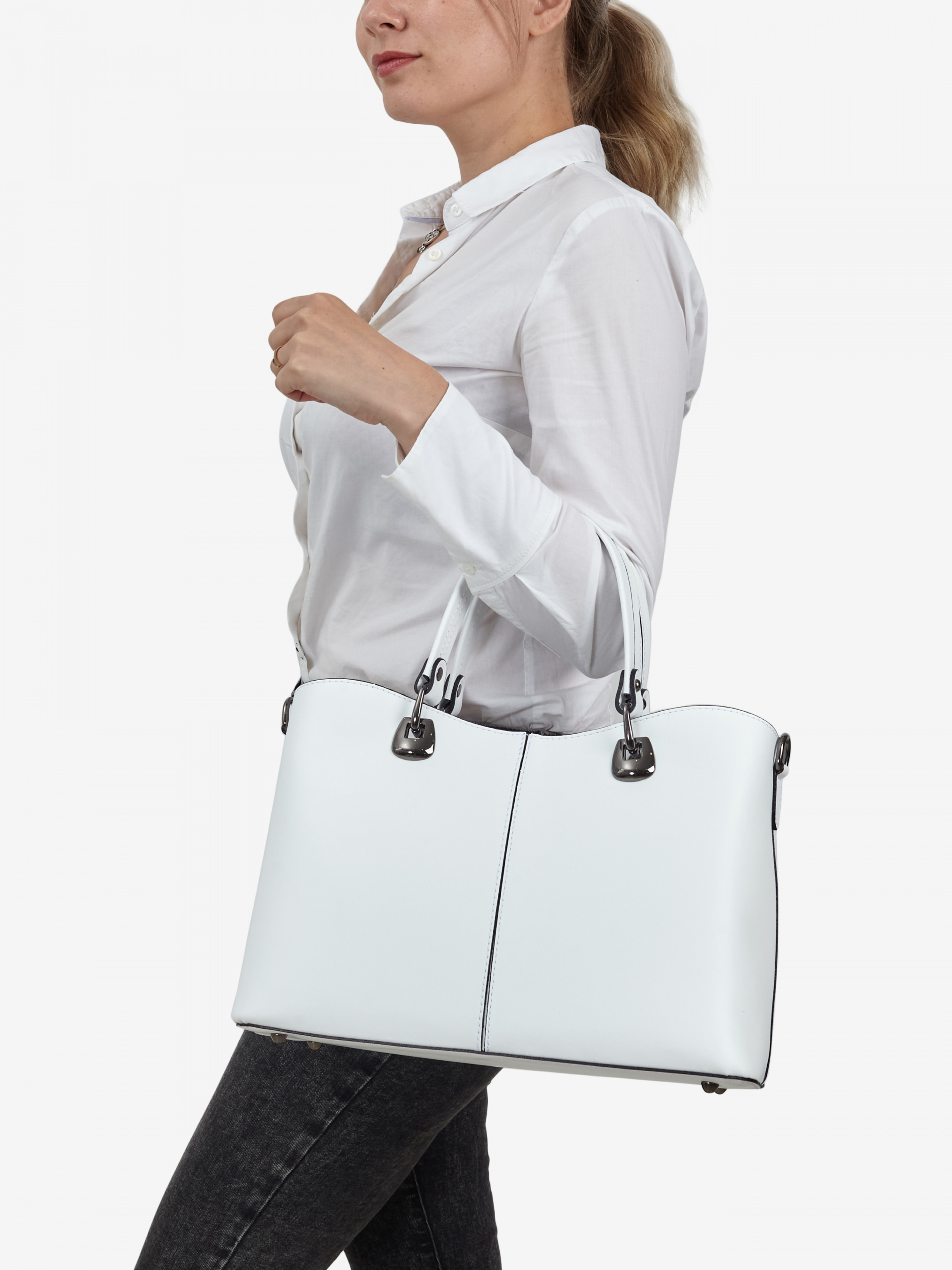 Деталі: - Матеріал: 100% натуральна шкіра - Шкіра має гладку фактуру - Фурнітура чорного кольору - розміри (Ш x В x Г) - 35 x 24 x 14 см - Усередині 2 відділення розділені кишенею на блискавці та 2 кишеньки для дрібниць - Підкладка: 100% бавовна - З заднього боку окрема кишеня на блискавці - Висота ручок 16 см - У комплекті ремінець для носіння на плечі (не регулюється, довжина 100 см) - Застібка: блискавка