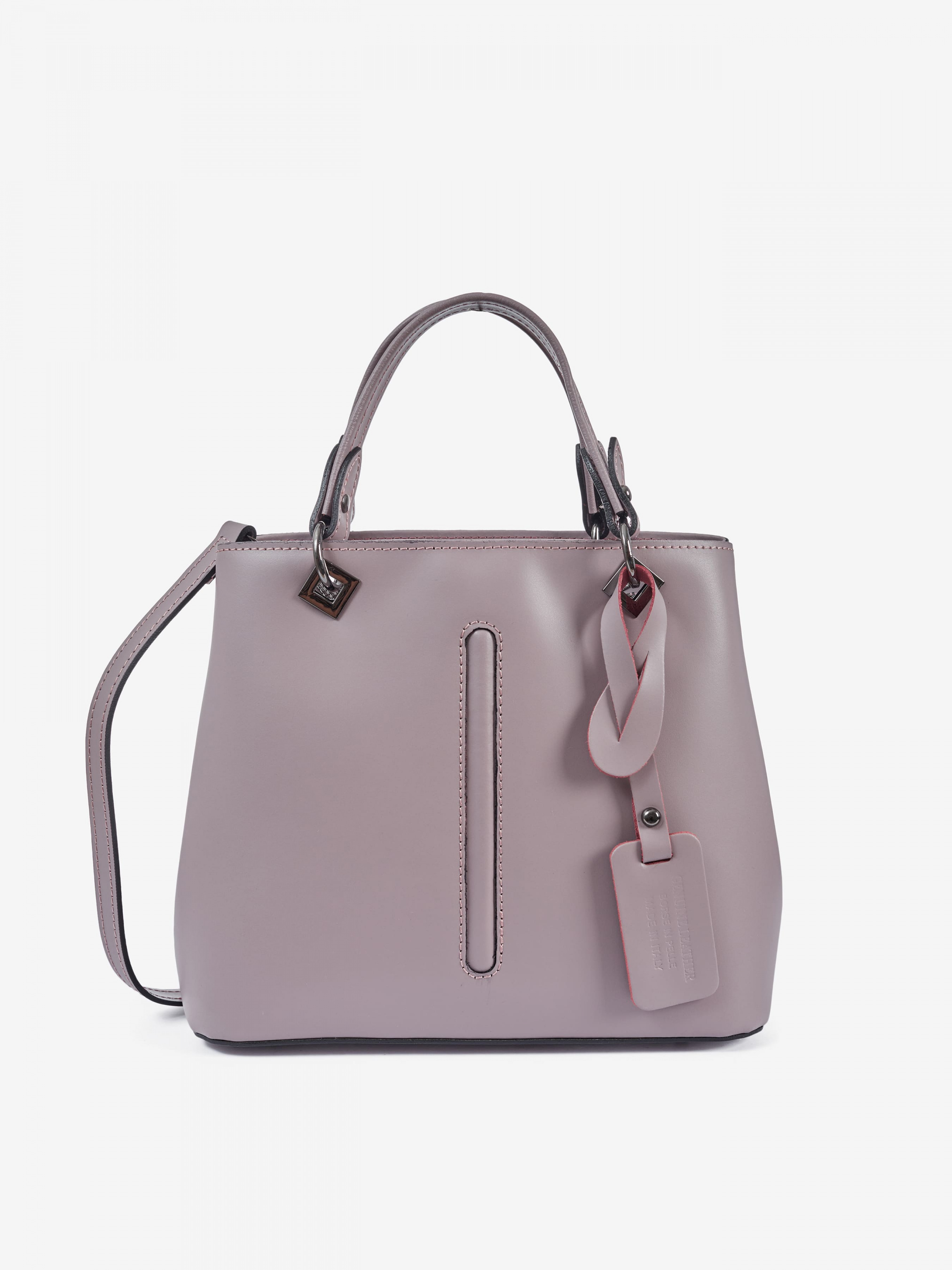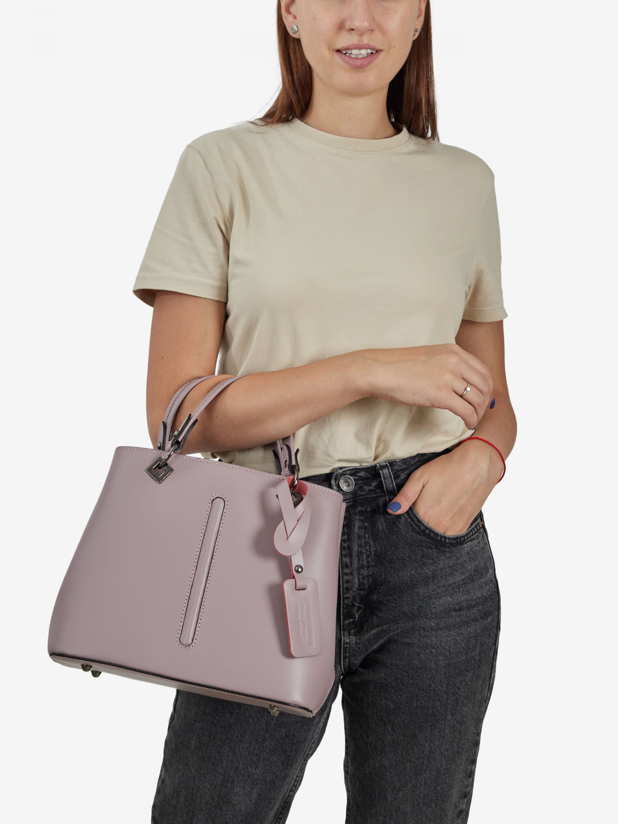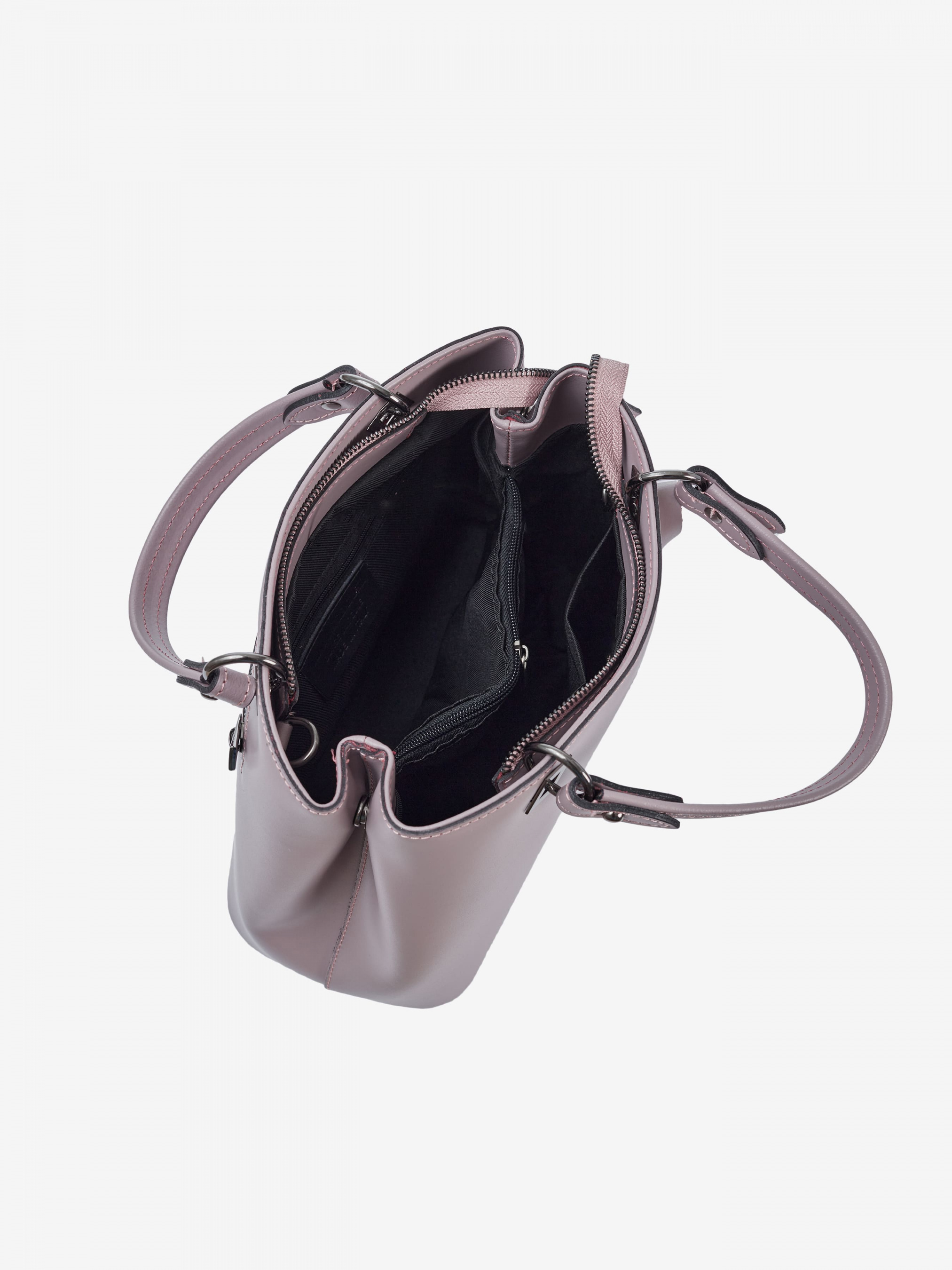 Деталі: Матеріал: 100% натуральна шкіра Шкіра має гладку фактуру Фурнітура чорного кольору Розміри (Ш x В x Г) - 25 x 20 x 14 см Усередині 2 відділення розділені кишенею на блискавці та 3 кишеньки для дрібниць, одна з них на блискавці Позаду горизонтальна кишеня на блискавці З боків знаходяться кліпси для зміни розміру та форми сумки Ручки знімні на карабінах Висота ручок 10 см У комплекті знімний ремінець на карабінах не регулюється, довжина 95 см Застібка: блискавка Підкладка бавовна