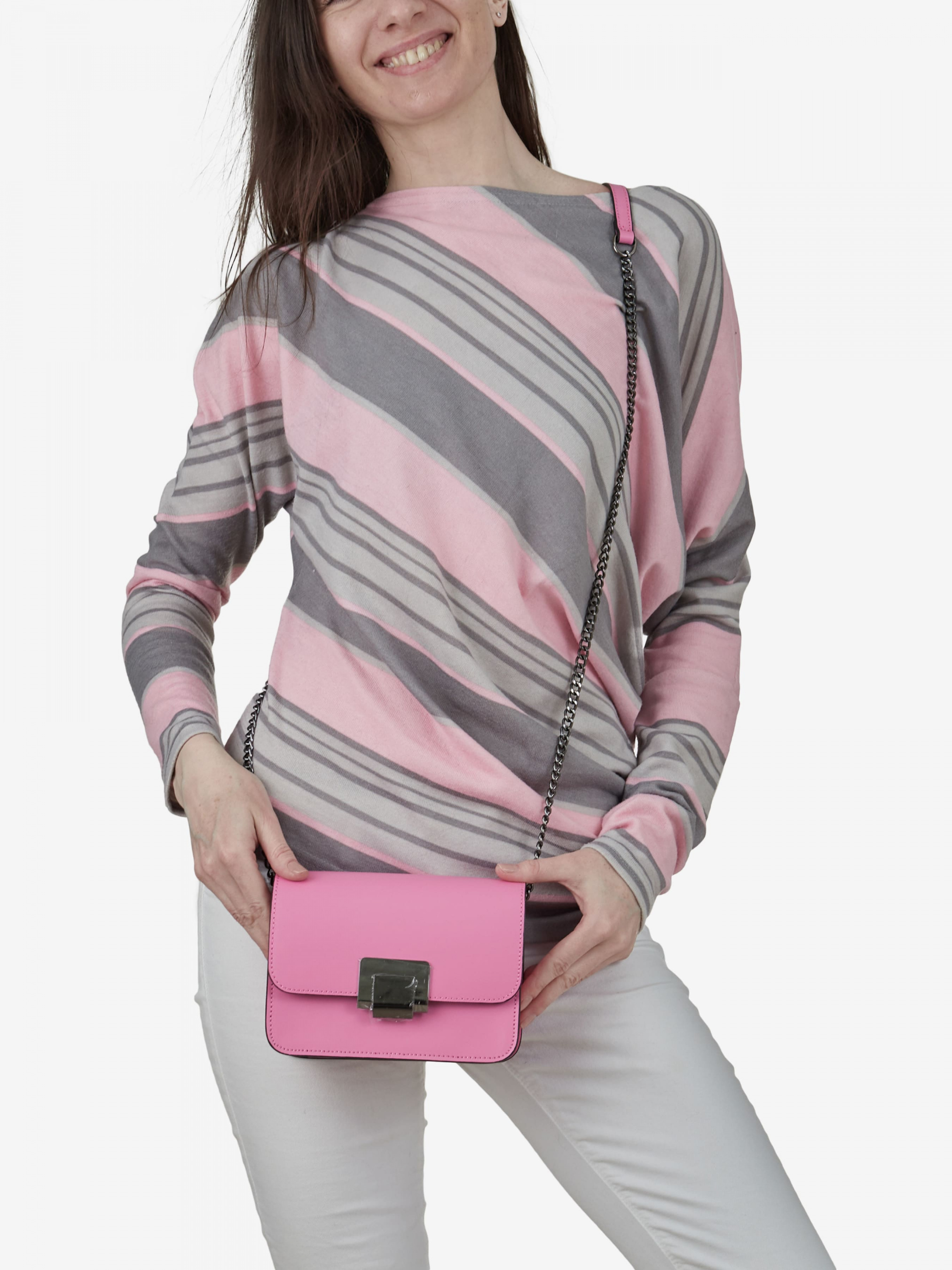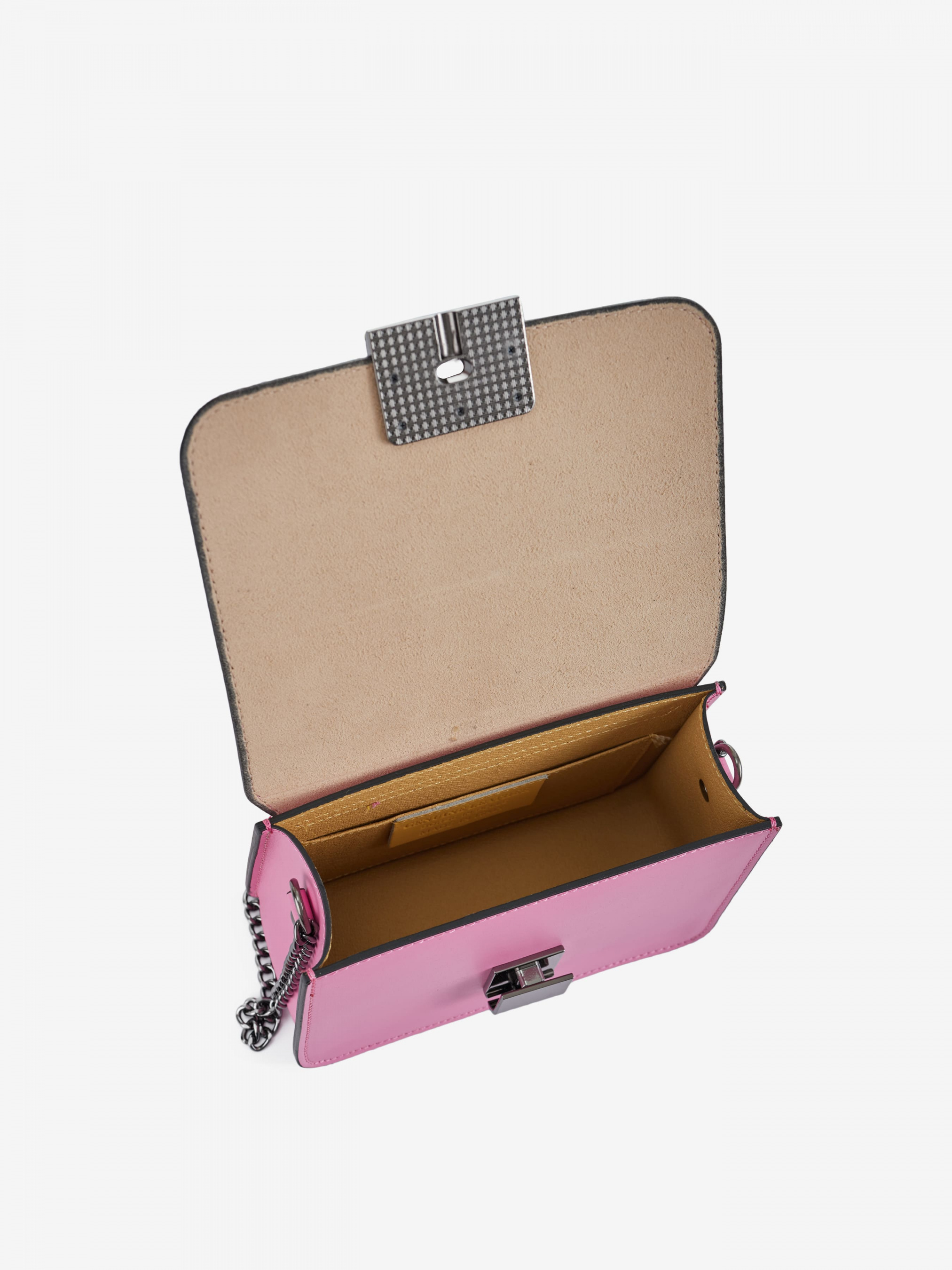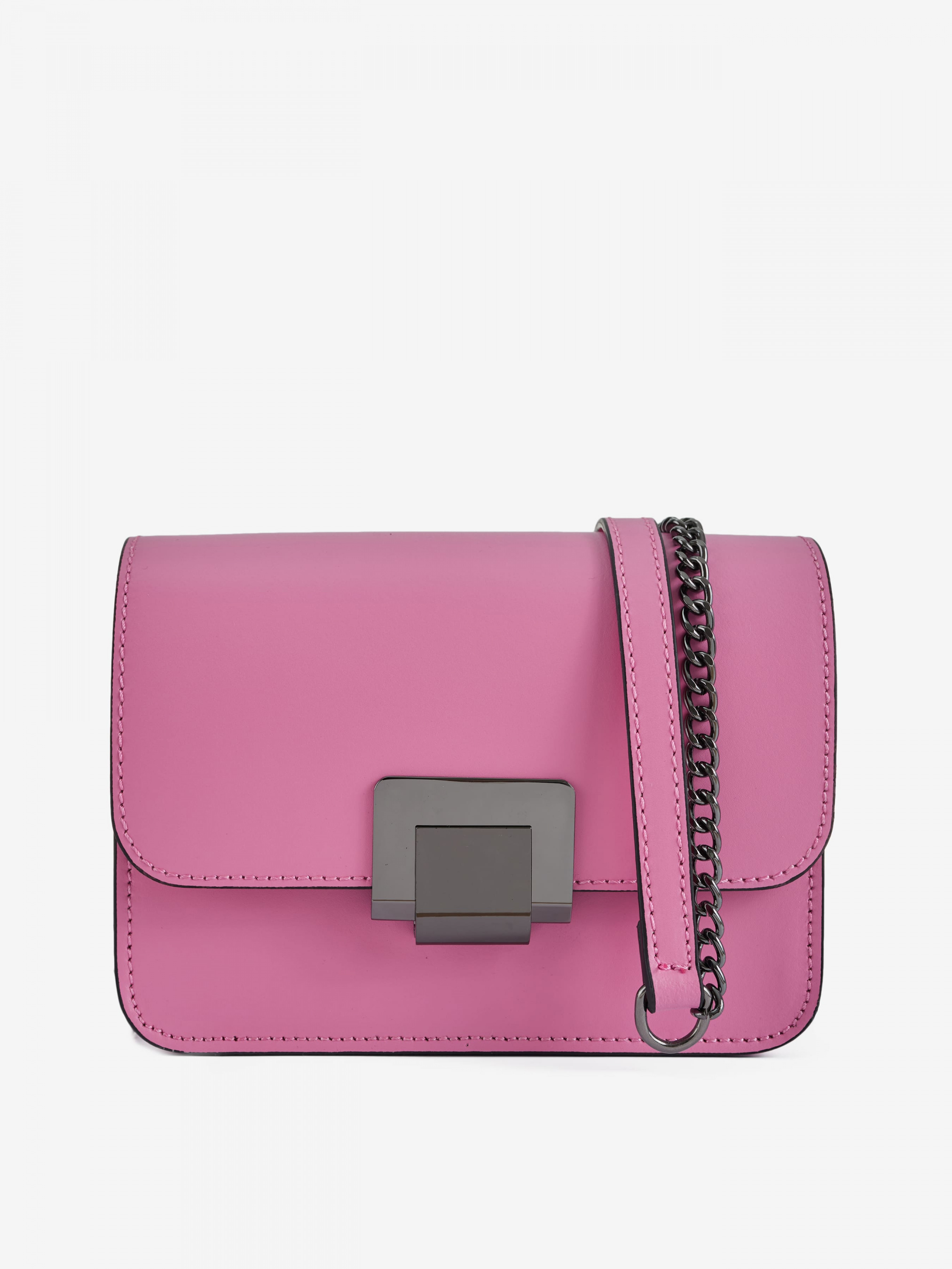 Деталі: Матеріал: 100% натуральна шкіра Шкіра має гладку фактуру Фурнітура чорного кольору Розміри (Ш x В x Г) – 17 x 12 x 7 см Всередині 1 відділення та кишенька для дрібниць без застібки Застібка: блискавка та клапан на кліпсі Ремінець-ланцюжок не регулюється незнімний, висота 52 см