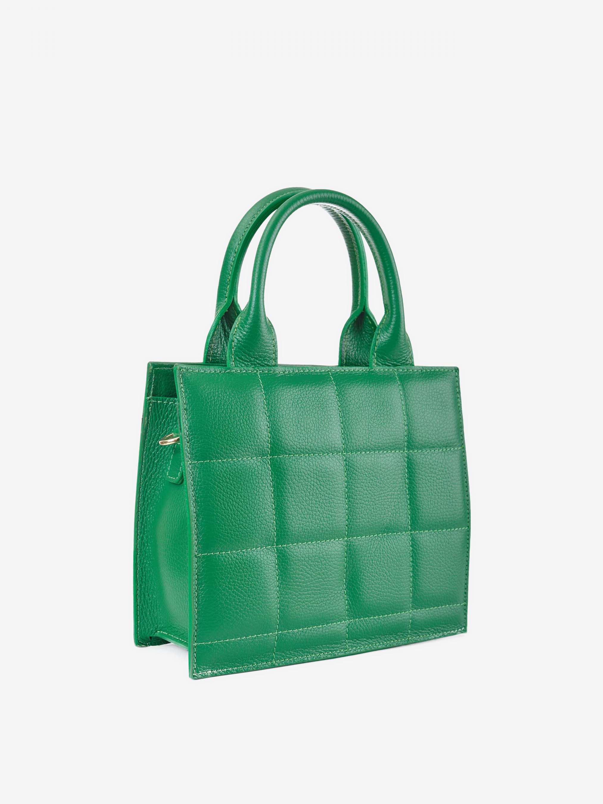 Деталі: Матеріал: 100% натуральна шкіра Шкіра флотар стьобана Фурнітура золотистого кольору Розміри (Ш x В x Г) – 25 x 17 x 10 см Усередині 1 відділення та 2 кишеньки для дрібниць, одна з них на блискавці Застібка: блискавка Без підкладки Висота ручок 10 см Ремінець текстильний, регульований, знімний, на карабінах, максимальна довжина 120 см
