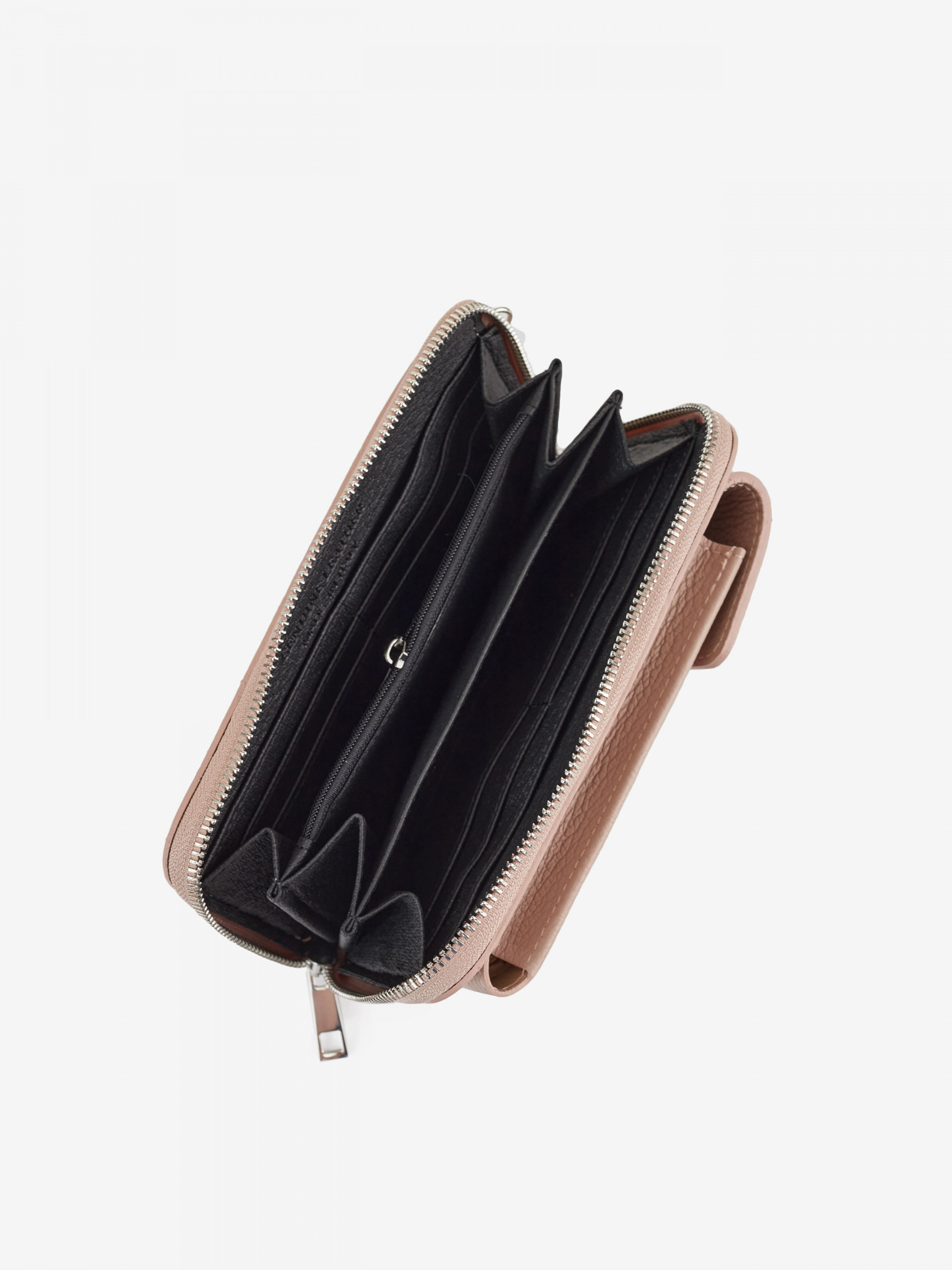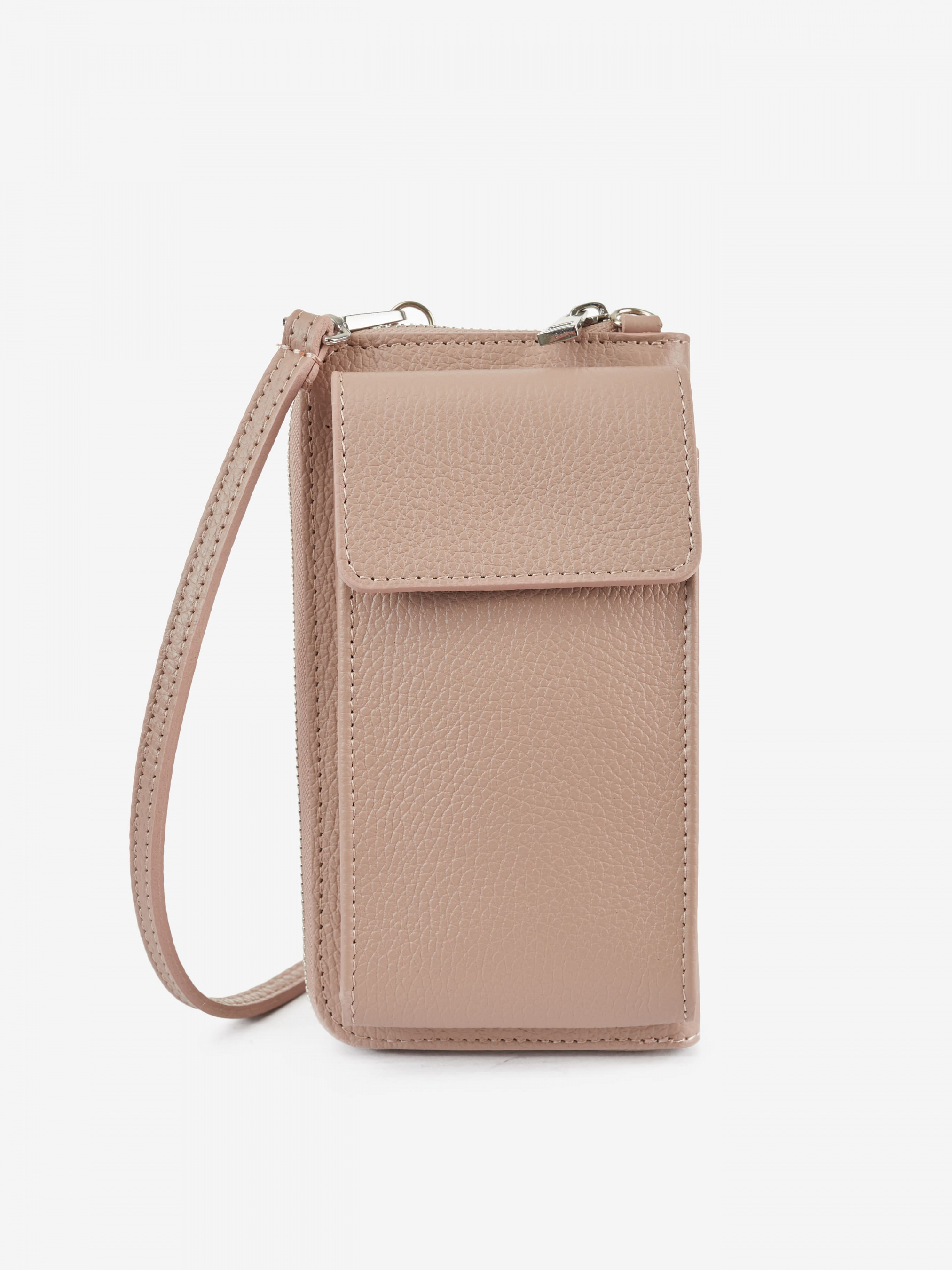 Деталі: Матеріал: 100% натуральна шкіра Шкіра має фактуру флотар Фурнітура сріблястого кольору Розміри (Ш x В x Г) - 20 х 10 х 5 см Усередині 5 відділень для готівки, 8 відділень для карток та монетниця на блискавці. Позаду кишенька для смартфона розміром 9х17, застібається на кнопку Підкадка шкіряна Застібка: блискавка Ремінець тонкий шкіряний, регулюється, знімний, на карабінах, максимальна довжина 120 см