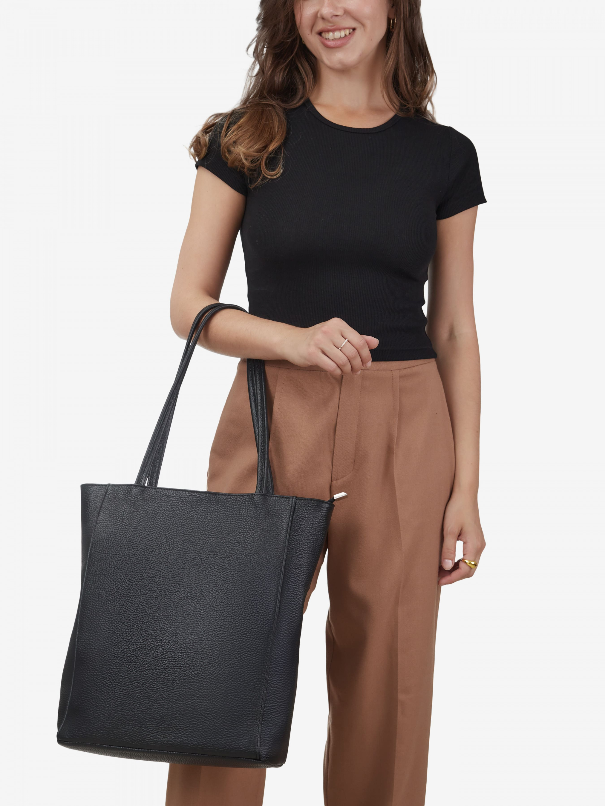 Деталі: Матеріал: 100% натуральна шкіра Шкіра має фактуру флотар, фурнітура сріблястого кольору Розміри (Ш x В x Г) - 33 х 36 х 13 см Усередині 1 відділення, кишенька для дрібниць на блискавці та кишенька для смартфона без застібки. Позаду кишенька на блискавці Підкладка: 100% бавовна Висота ручок 28 см Застібка: блискавка