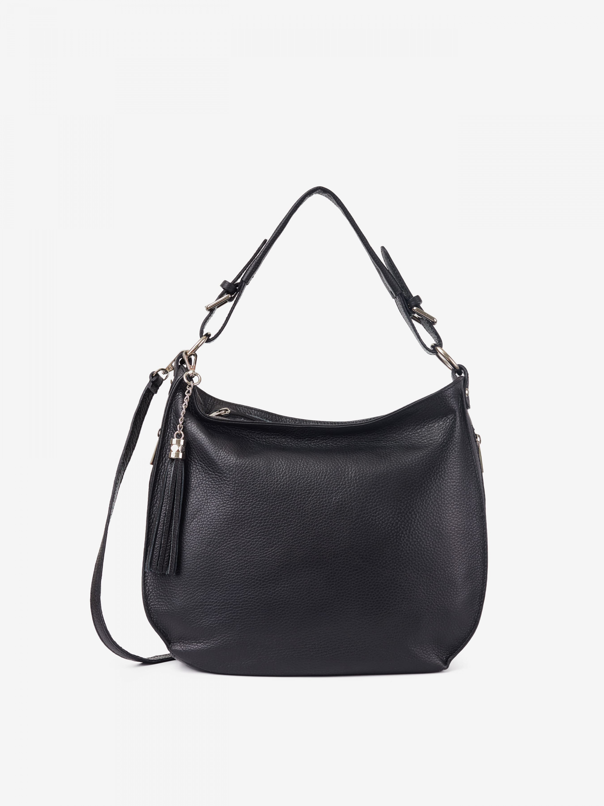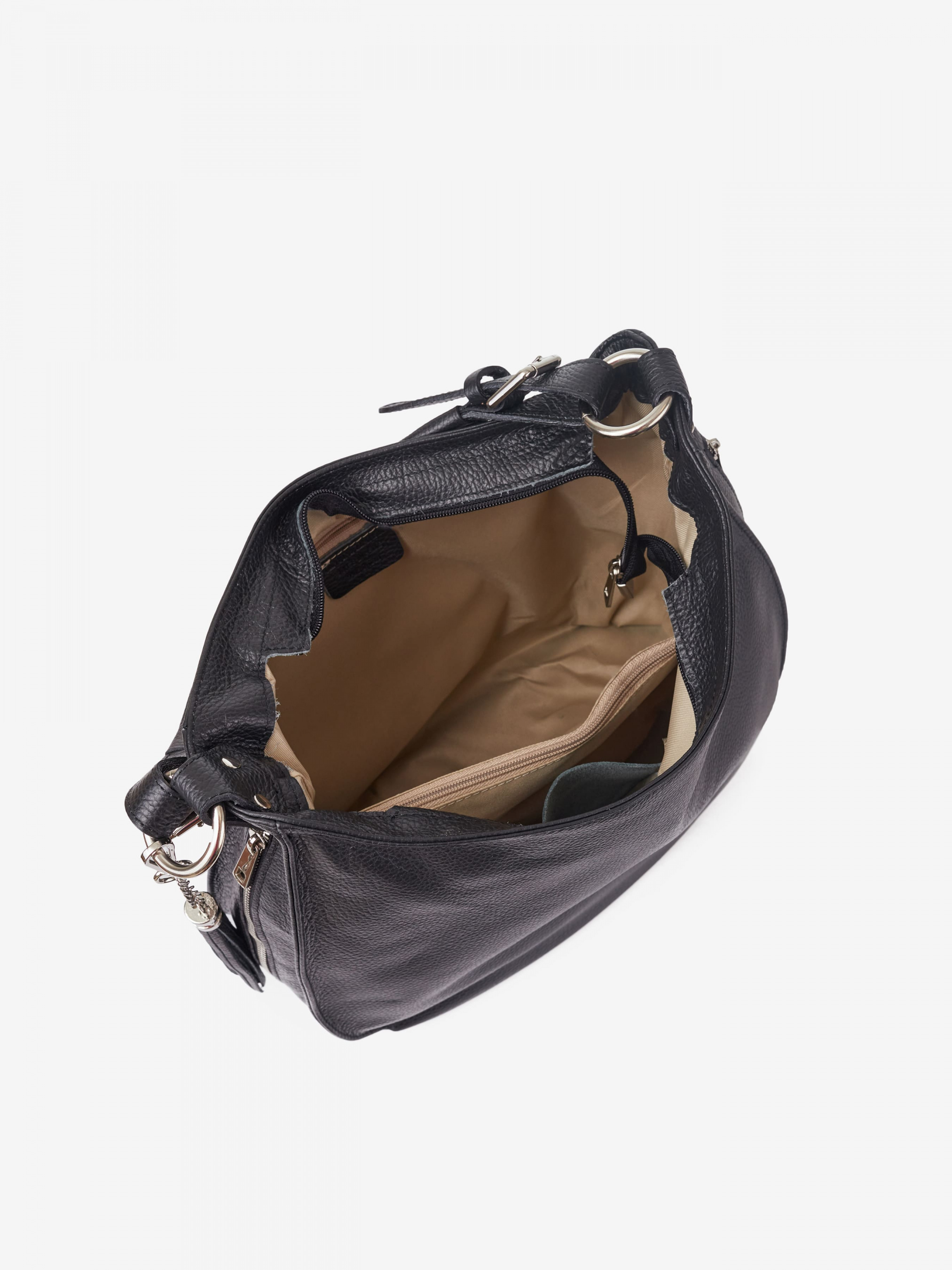 Деталі: Матеріал: 100% натуральна шкіра Шкіра має фактуру флотар Фурнітура сріблястого кольору Розміри (Ш x В x Г) - 35 х 30 х 12 см Усередині 2 відділення розділені кишенею на блискавці та 2 кишеньки для дрібниць, одна з них на блискавці Позаду кишеньку на блискавці. З боків вертикальні кишеньки на блискавці. Є декоративний брелок на карабіні Підкладка: 100% бавовна Вміщує документи формату A4 Застібка: блискавка Ремінець шкіряний, регулюється, знімний, максимальна довжина 115 см. Ручка знімна, висота ручки 25 см