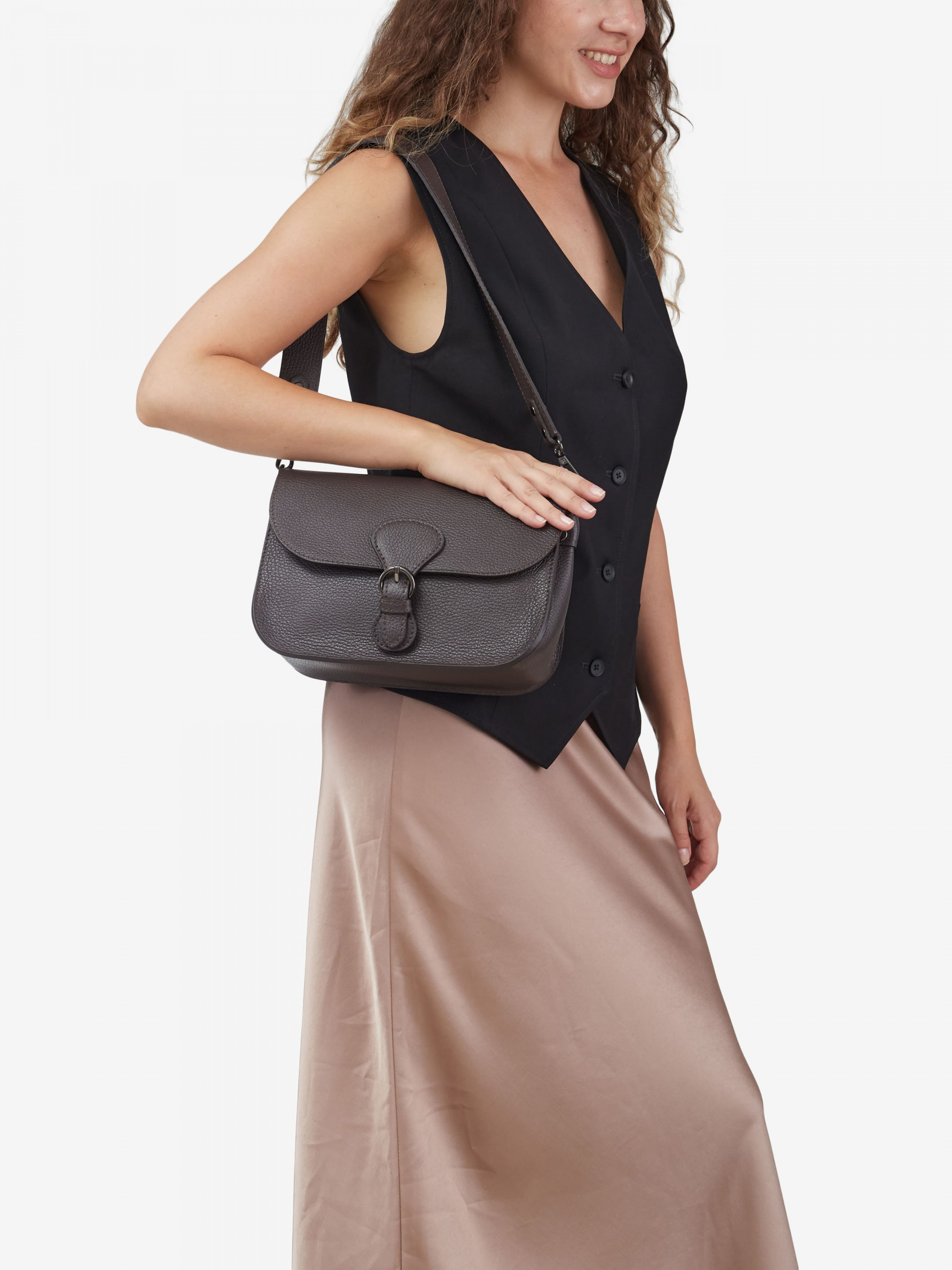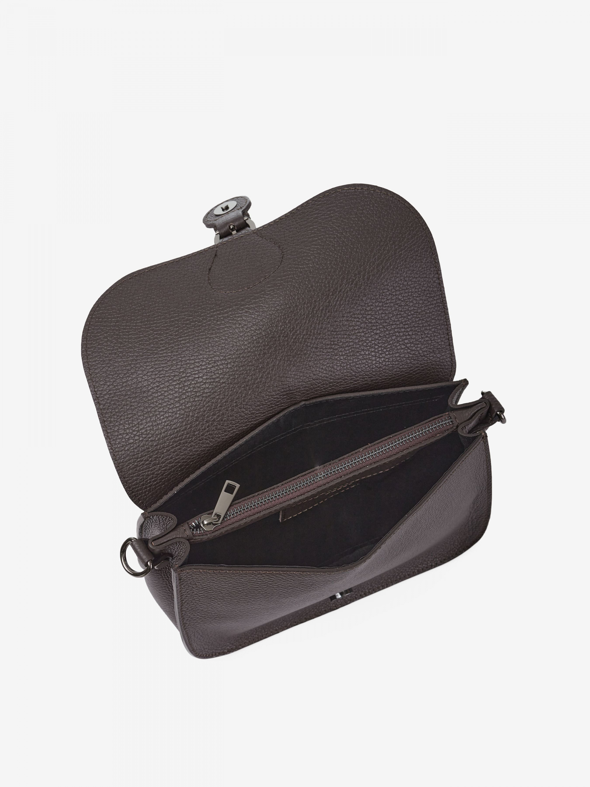 Деталі: Матеріал: 100% натуральна шкіра Шкіра має фактуру флотар Фурнітура чорного кольору Розміри (Ш x В x Г) - 25 x 18 x 10 см Всередині: 1 відділення та посередині кишеня на блискавці Підкладка: 100% бавовна Застібка: клапан на магніті Два знімні ремінці на карабінах: широкий не регулюється (довжина 60 см), тонкий тонкий регулюється (максимальна довжина 120 см)