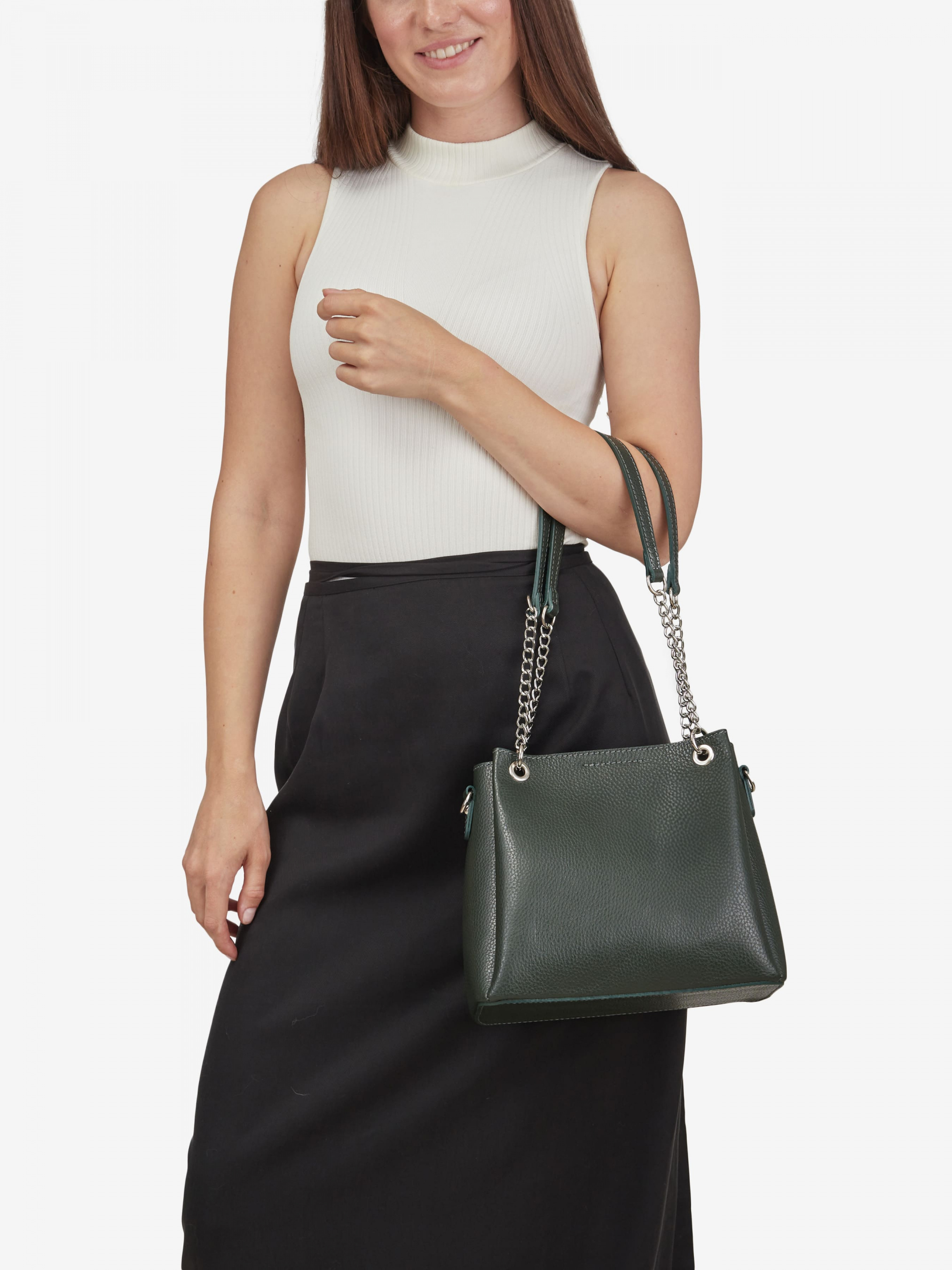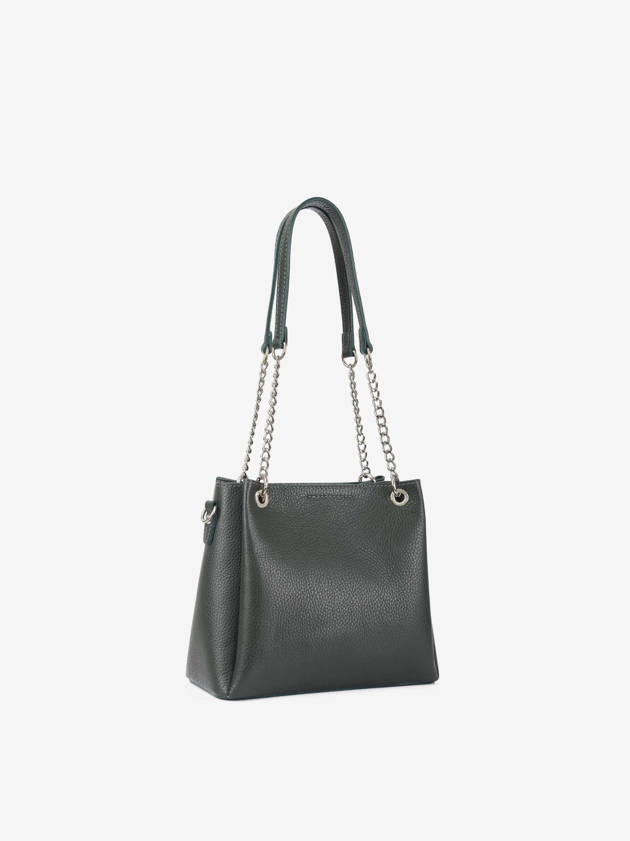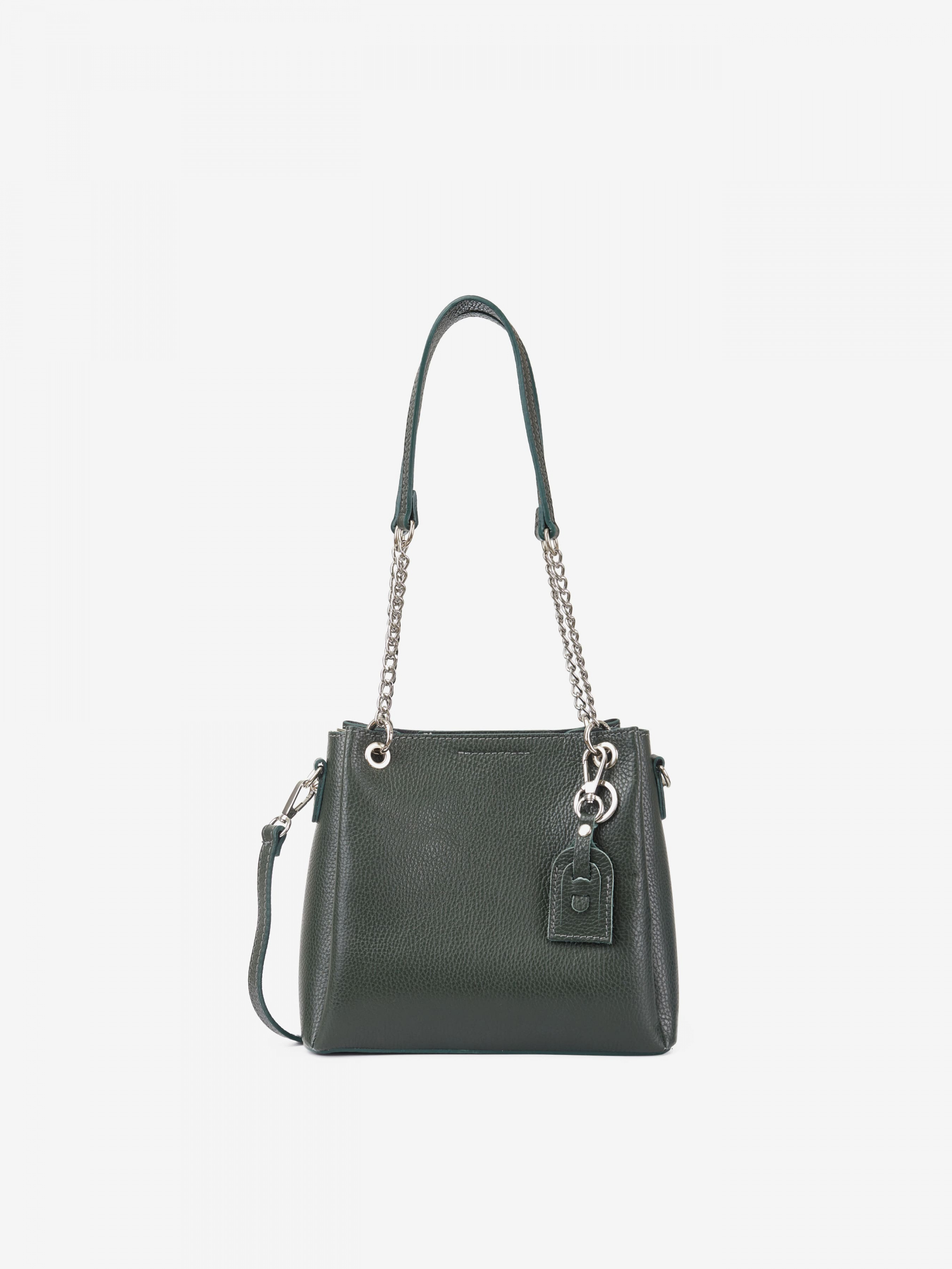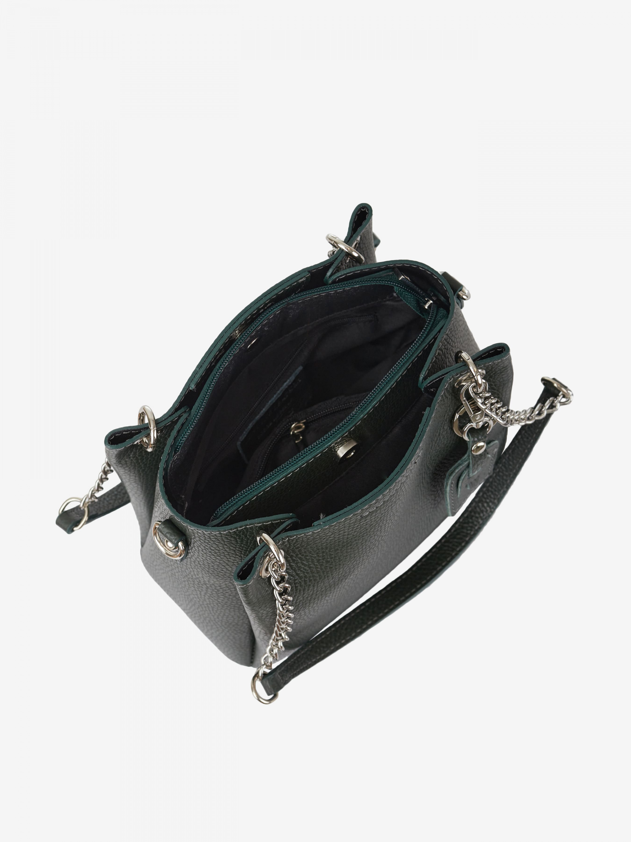 Деталі: Матеріал: 100% натуральна шкіра Шкіра має фактуру флотар Фурнітура сріблястого кольору Розміри (Ш x В x Г) – 24 x 21 x 10 см Всередині текстильна косметичка на блискавці з 2 відділеннями, розділеними кишенею на блискавці та кишенькою для дрібниць на блискавці. Косметичка незнімна. Спереду брелок на карабіні Підкладка відсутня Застібка: блискавка, магніт У комплекті ремінець для носіння на плечі шкіряний, регульований, знімний, на карабінах, максимальна довжина 95 см Ручки-ланцюжки на карабінах, не регулюються, висота 28 см
