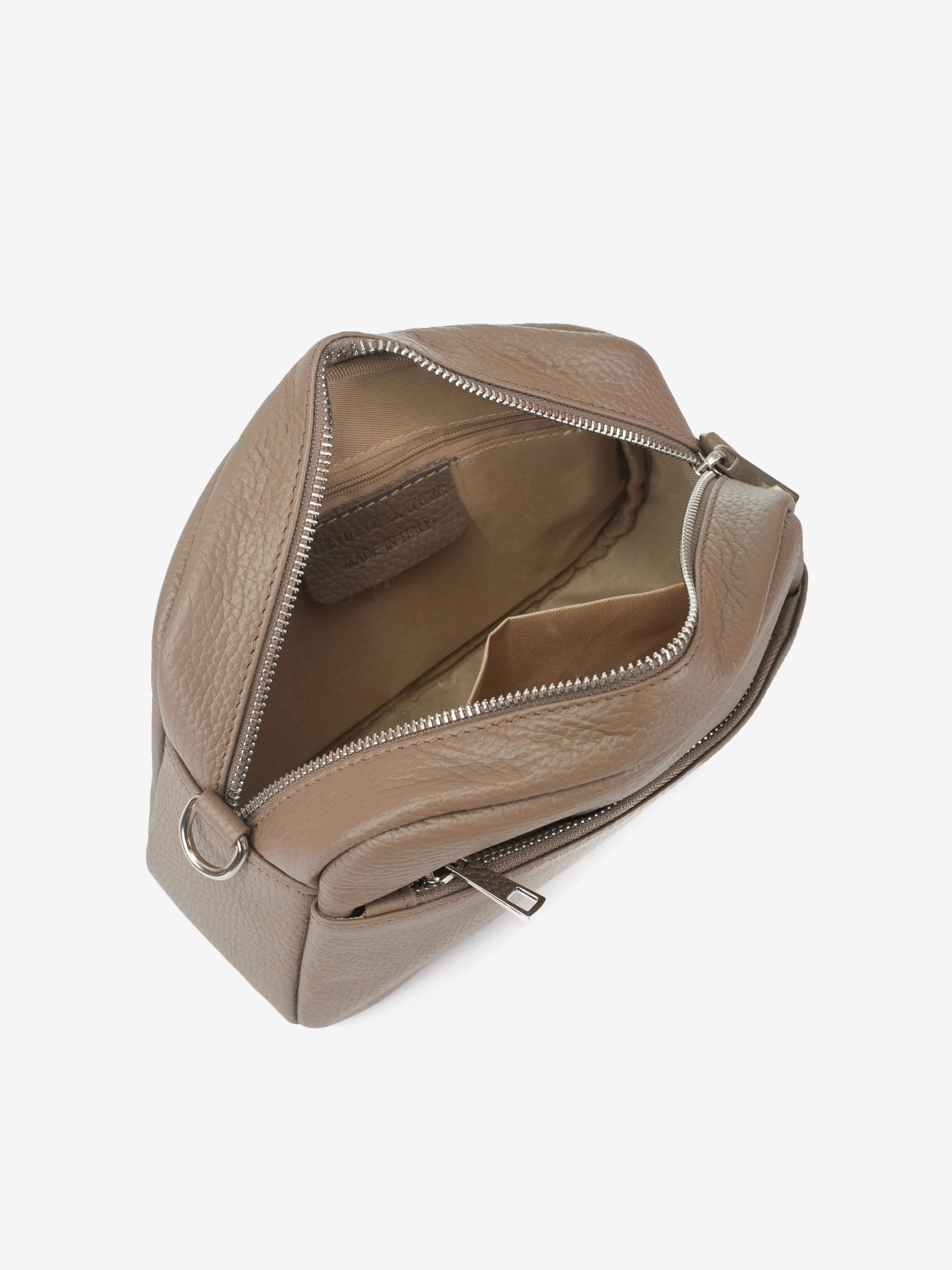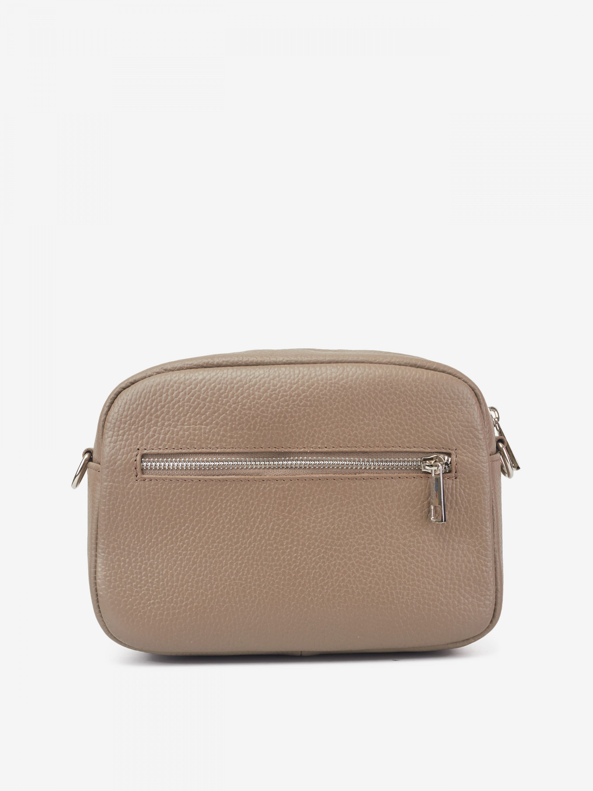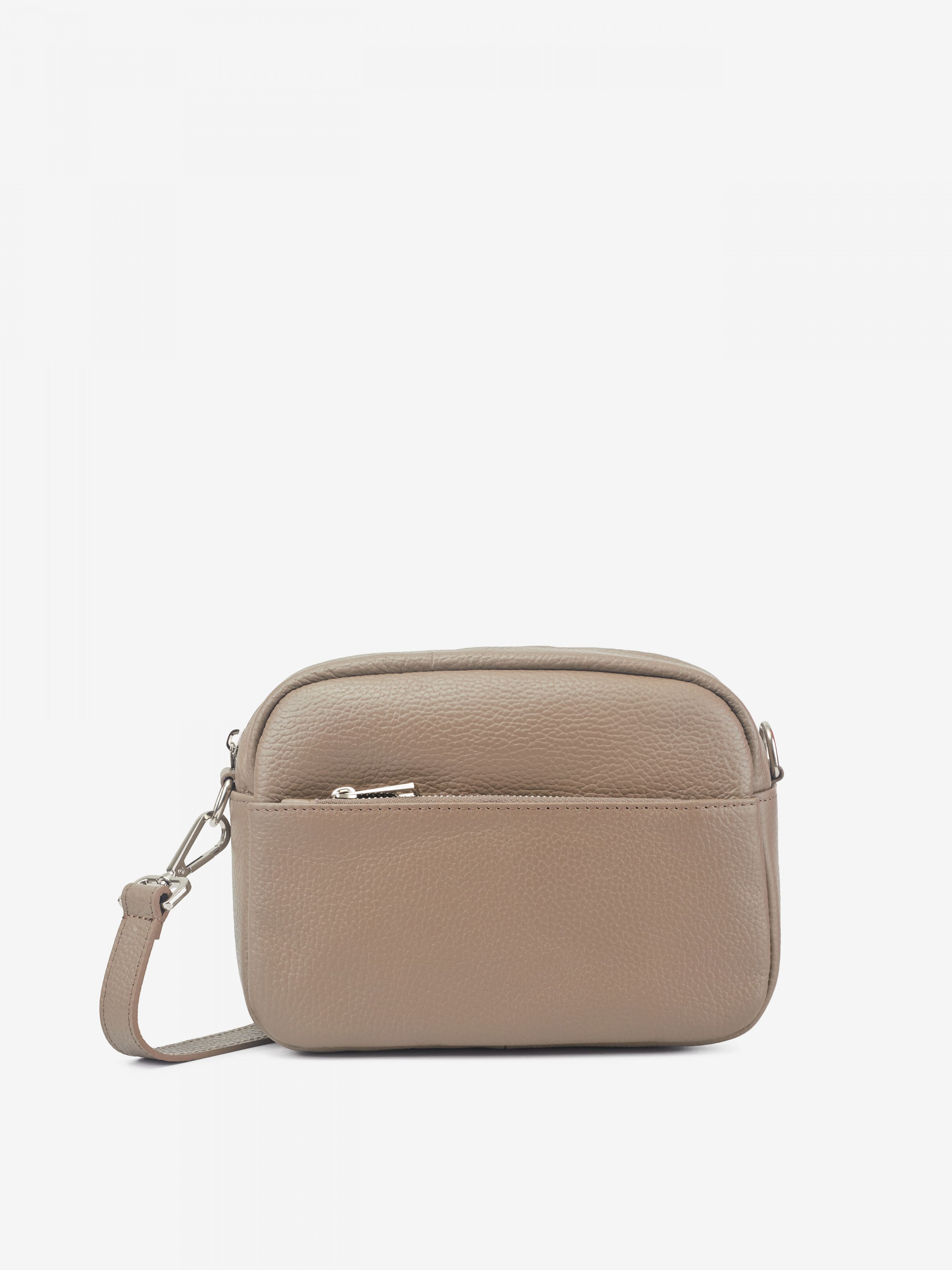 Деталі: Матеріал: 100% натуральна шкіра Шкіра має фактуру флотар Фурнітура сріблястого кольору Розміри (Ш x В x Г) – 22 x 18 x 9 см Усередині 1 відділення та 2 кишеньки для дрібниць, одна з них на блискавці Спереду та ззаду горизонтальні кишеньки на блискавці Підкладка: 100% бавовна Застібка: блискавка Ремінець шкіряний, регулюється, знімний, на карабінах, максимальна довжина 120 см