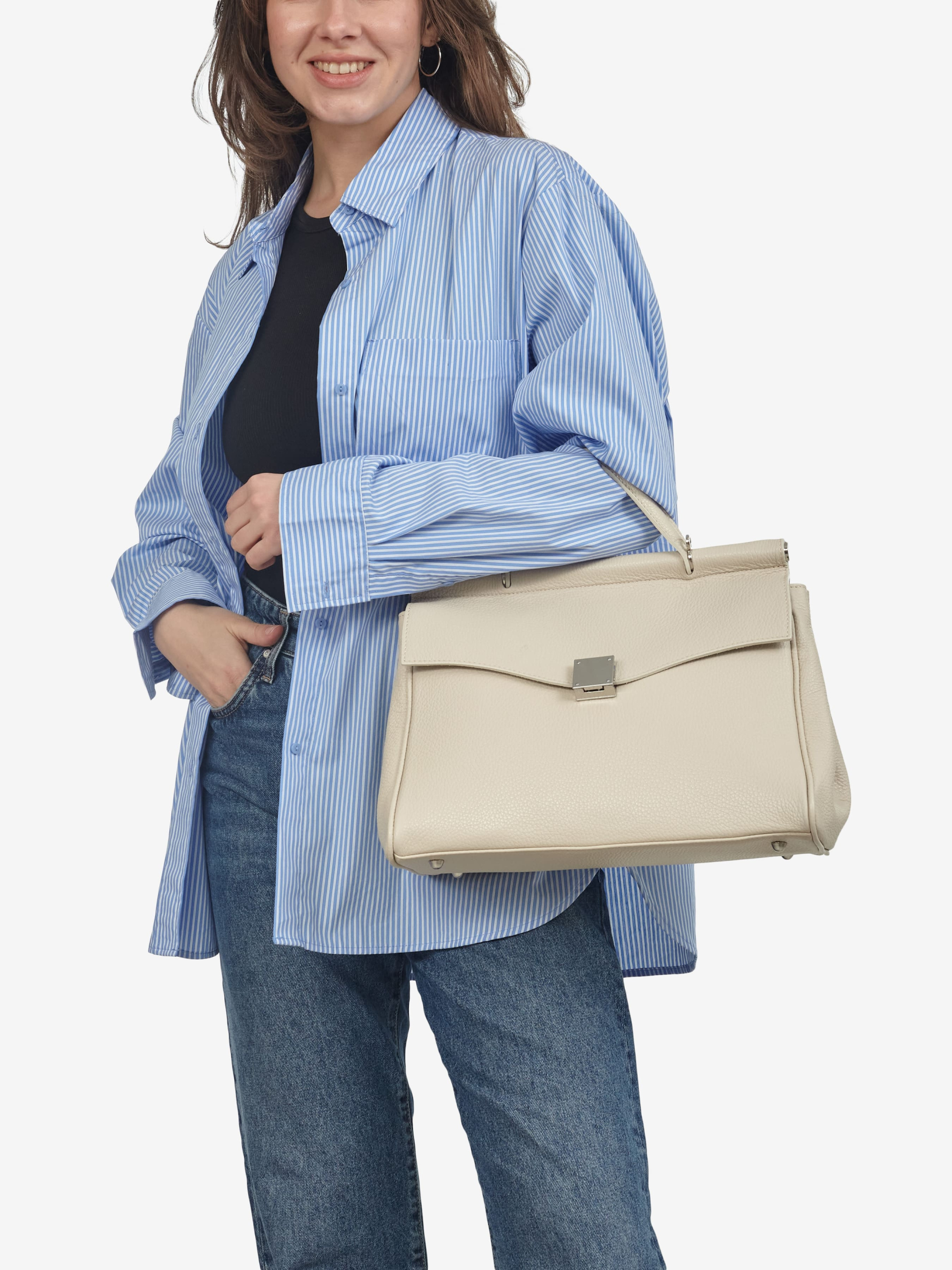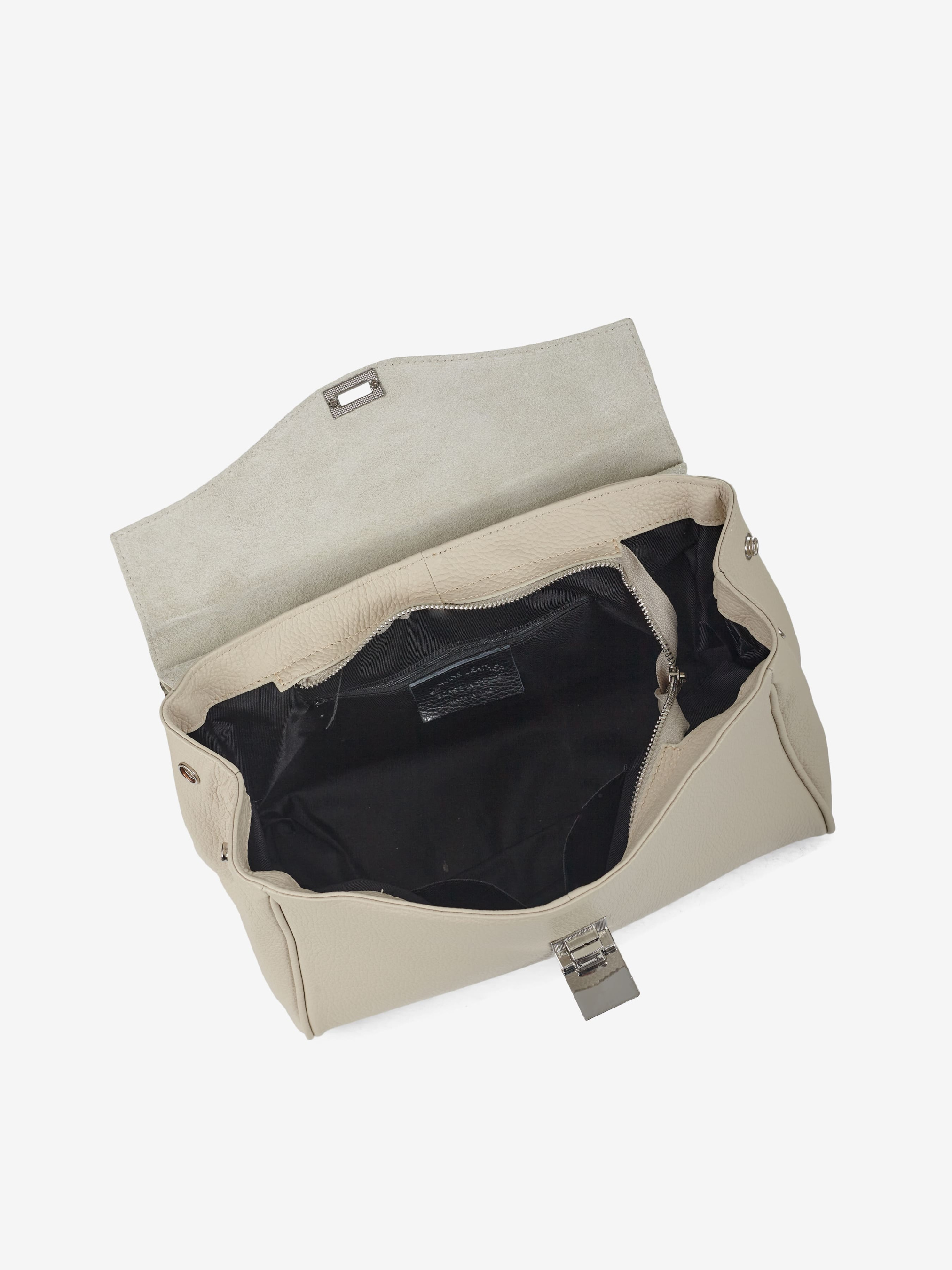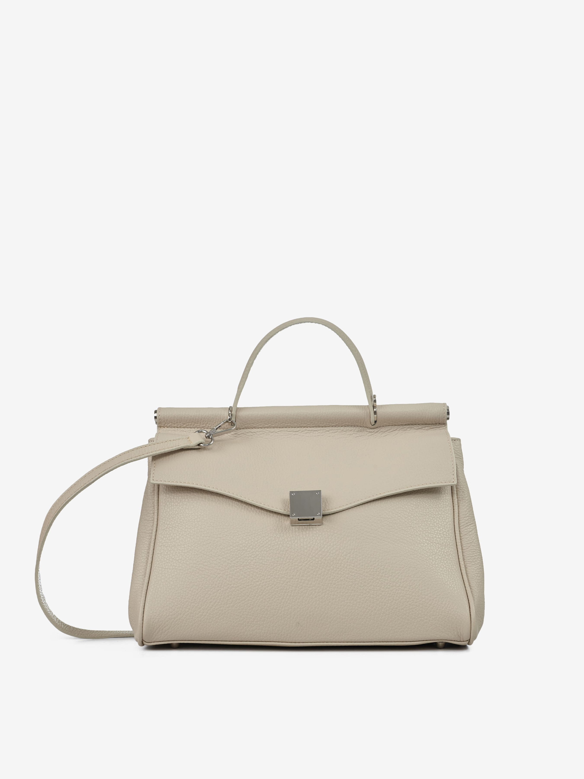 Деталі: Матеріал: 100% натуральна шкіра Шкіра флотар Фурнітура сріблястого кольору Розміри (Ш x В x Г) - 32 х 25 х 15 см Усередині 1 відділення та 3 кишеньки для дрібниць, одна з них на блискавці З боків є кнопки для зміни розміру та форми сумки Підкладка: 100% бавовна Застібка: клапан на поворотному замку Ремінець шкіряний, не регульований, знімний, максимальна довжина 98 см Висота ручки 10 см